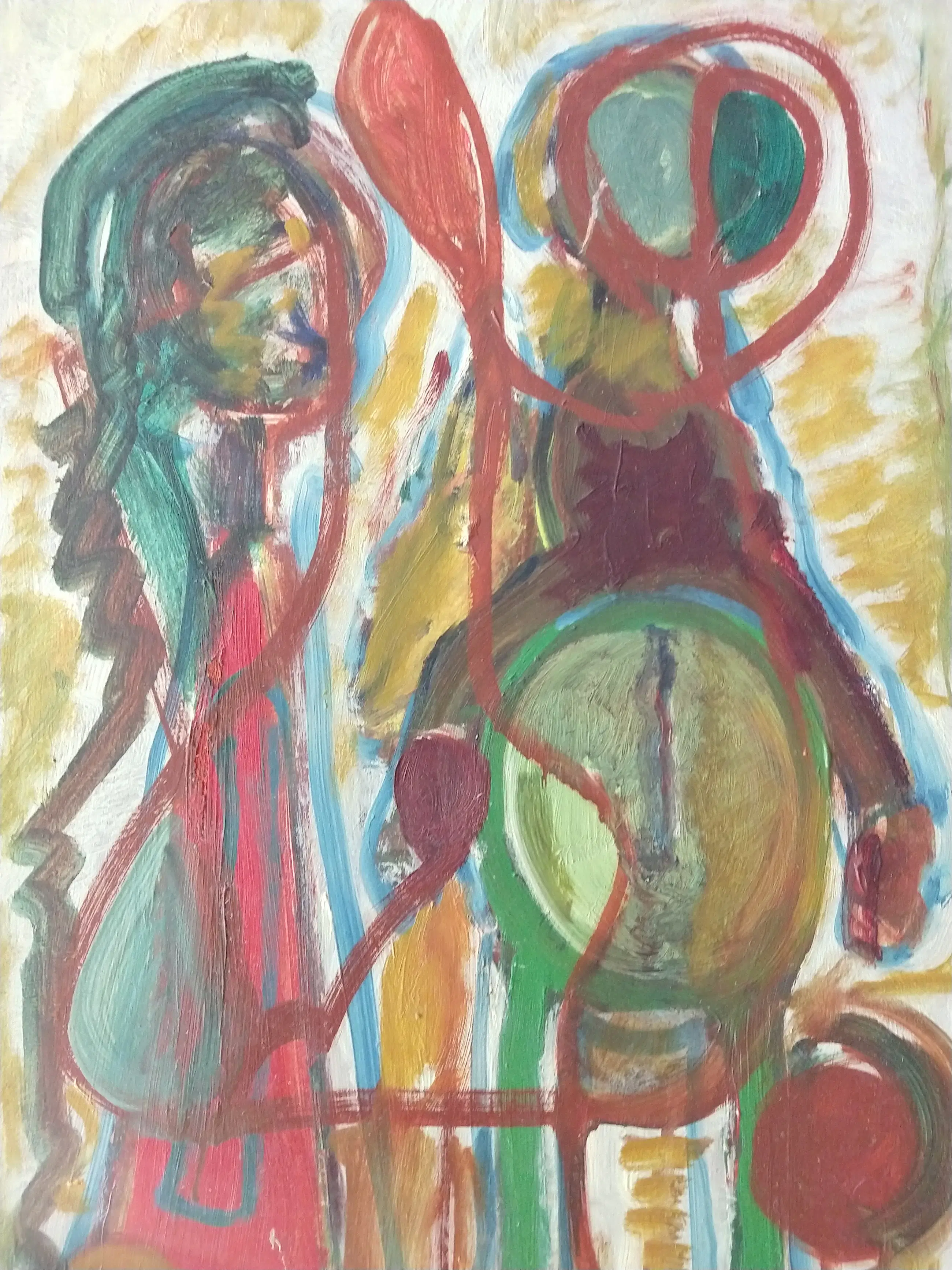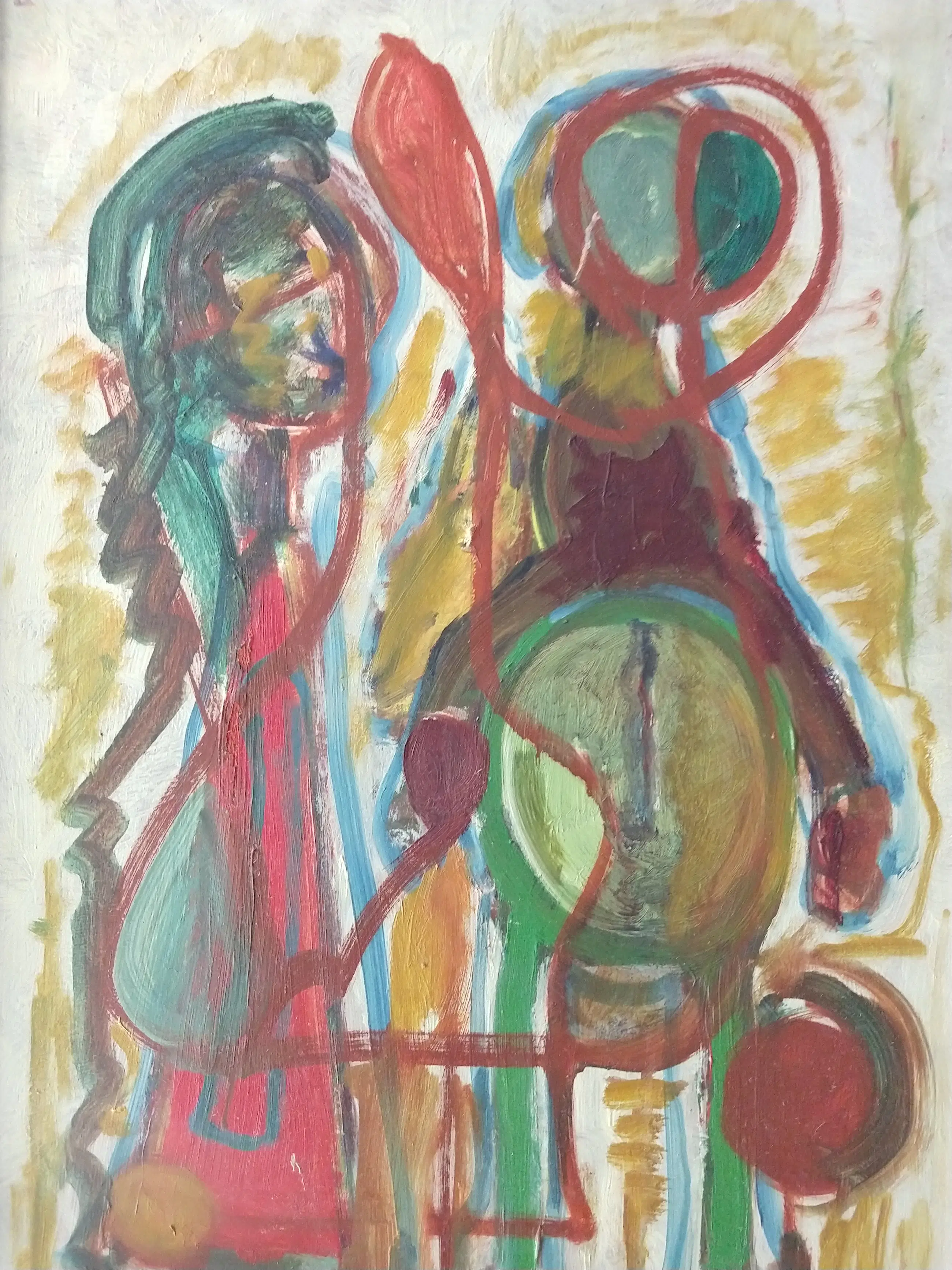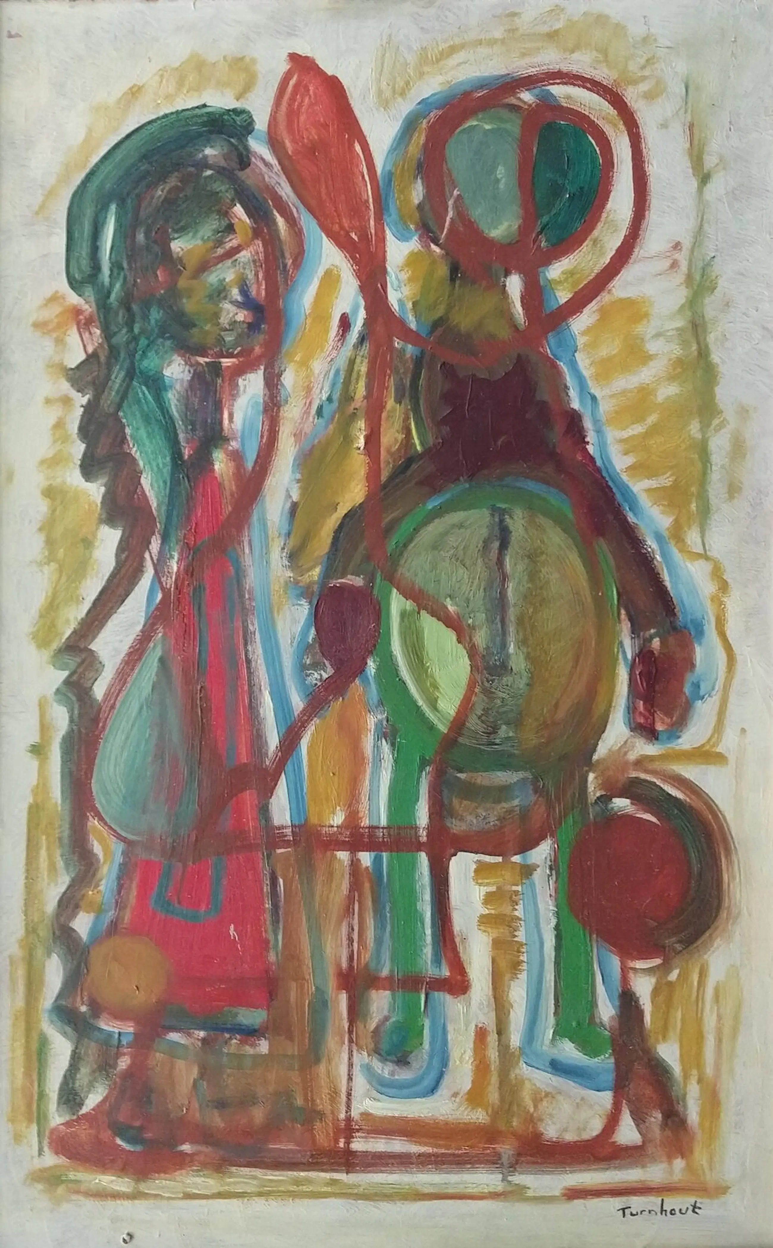 Drie figuren. Olieverf op board. Afmeting zonder lijst 62x41 cm. Inclusief lijst 67x44 cm. Het schilderij en de lijst hebben ouderdomssporen en gebruissporen.