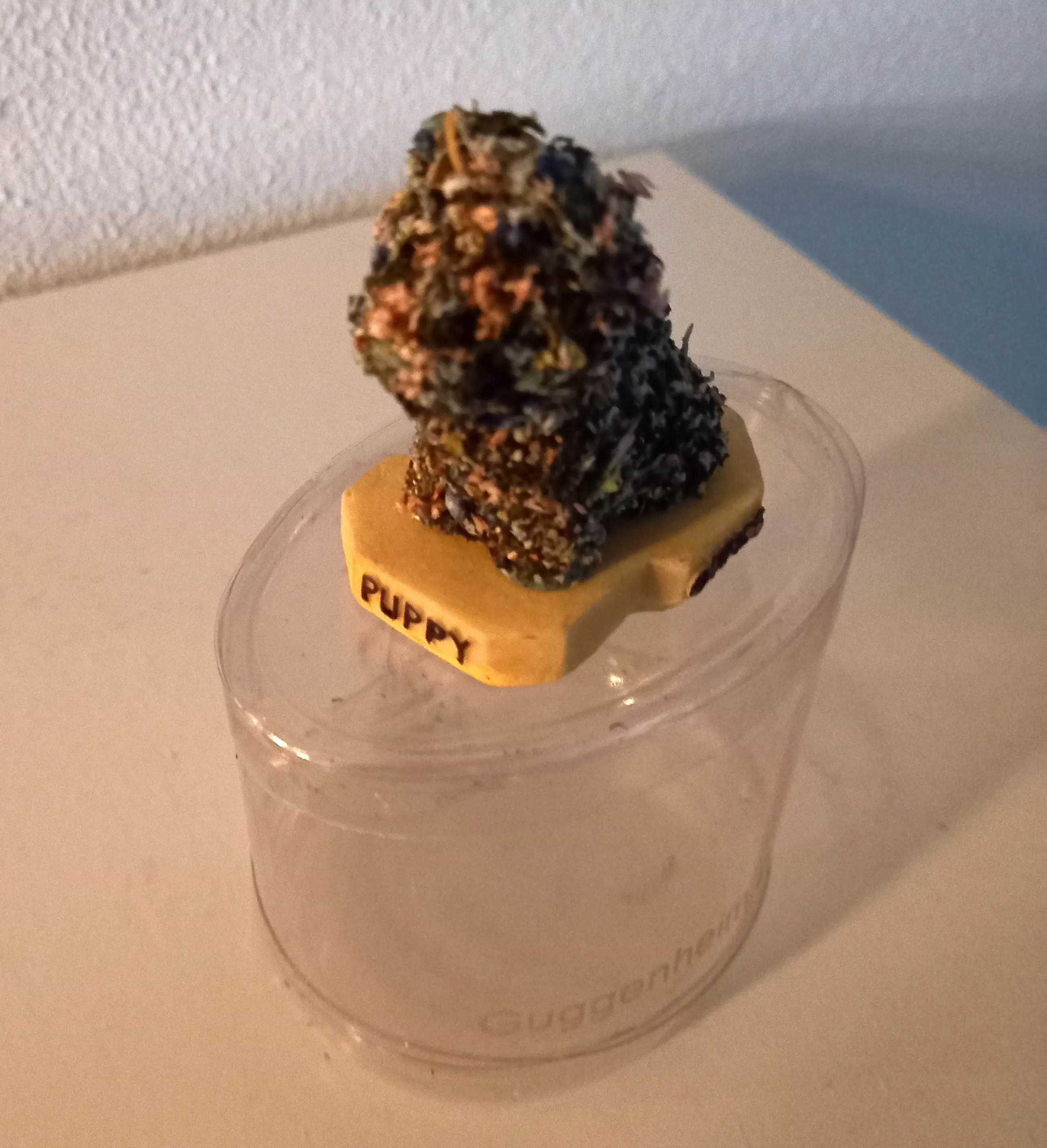 Het exemplaar is met de hand versierd (en daardoor is elk exemplaar uniek!) met droogbloemen en is een kleine versie van het grote exemplaar, op een sokkeltje met het opschrift "c. TAMCB "Puppy ".