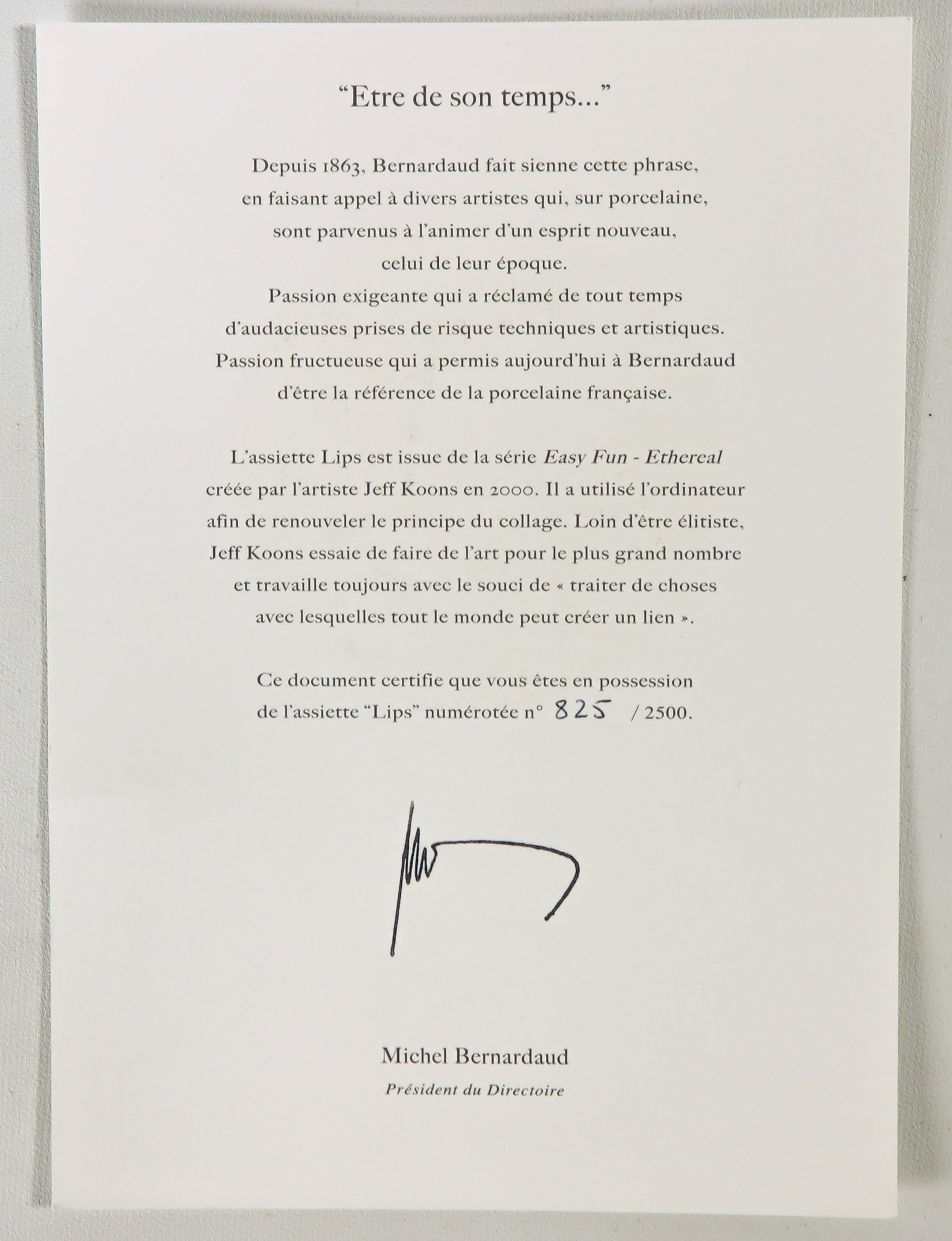 Porseleinen bord, met de voorstelling Lips, uitgegeven in een gelimiteerde oplage van 2500 exemplaren. Het bord is uitgevoerd door het Franse porseleinmerk Bernardaud.