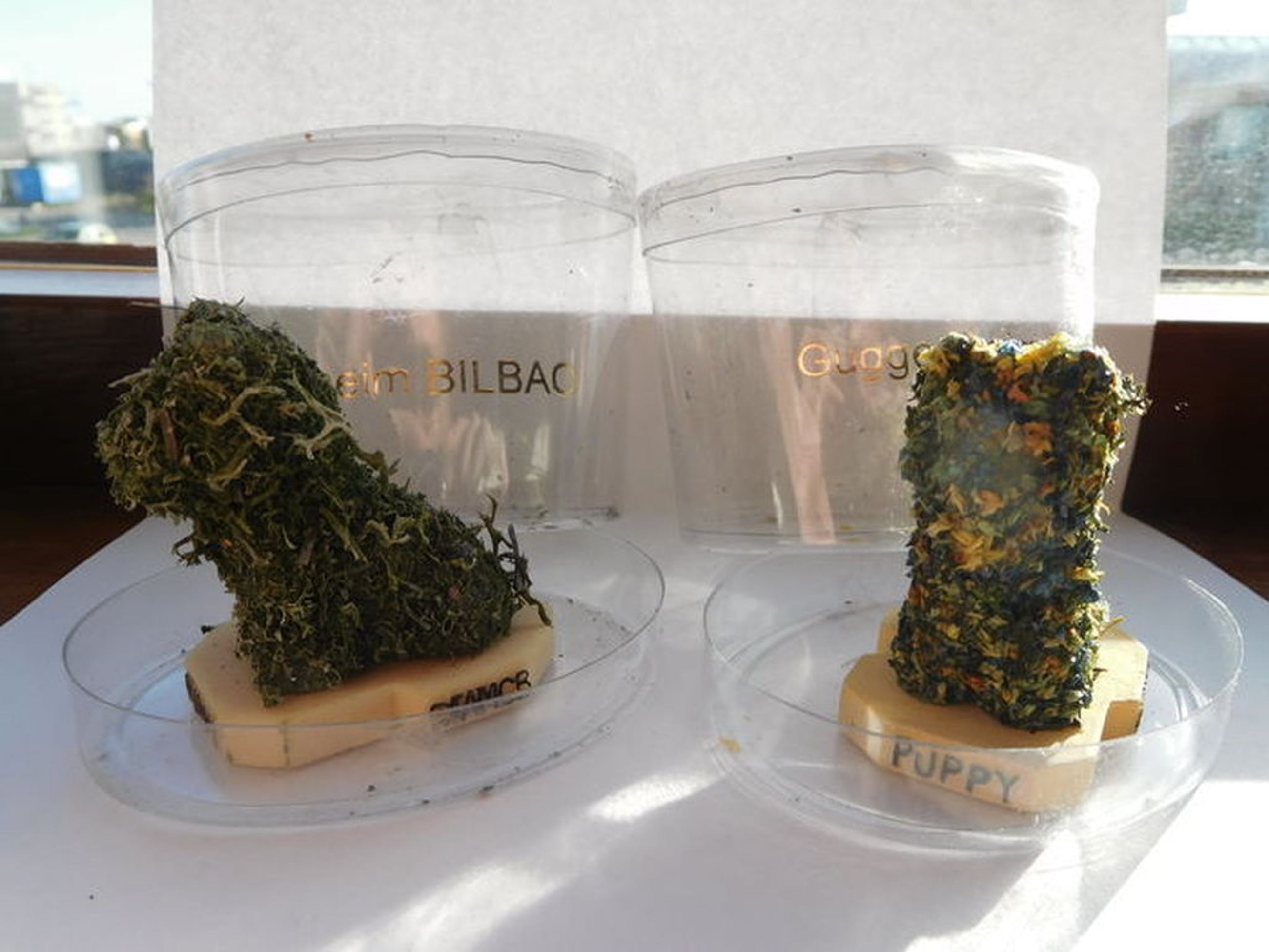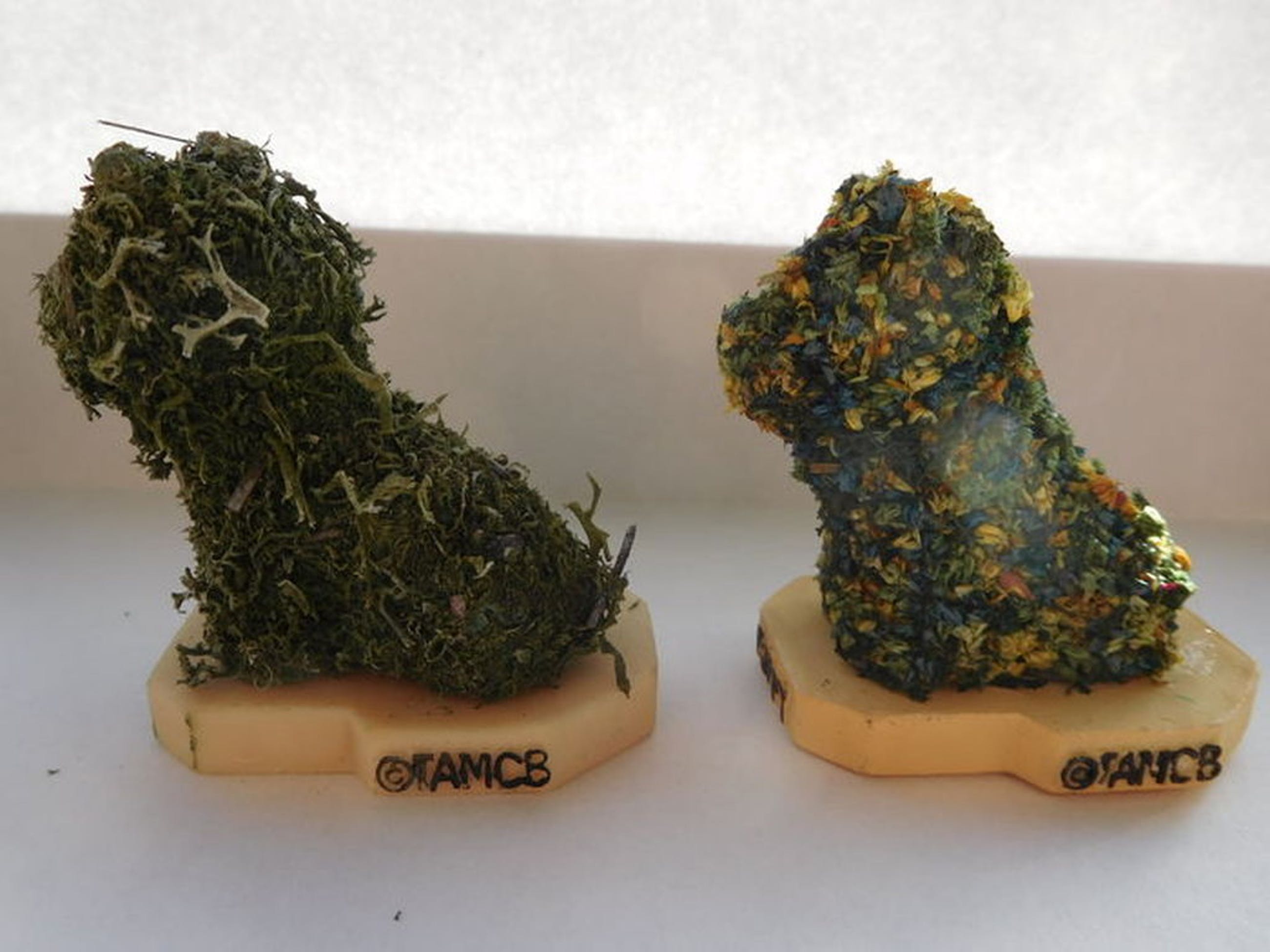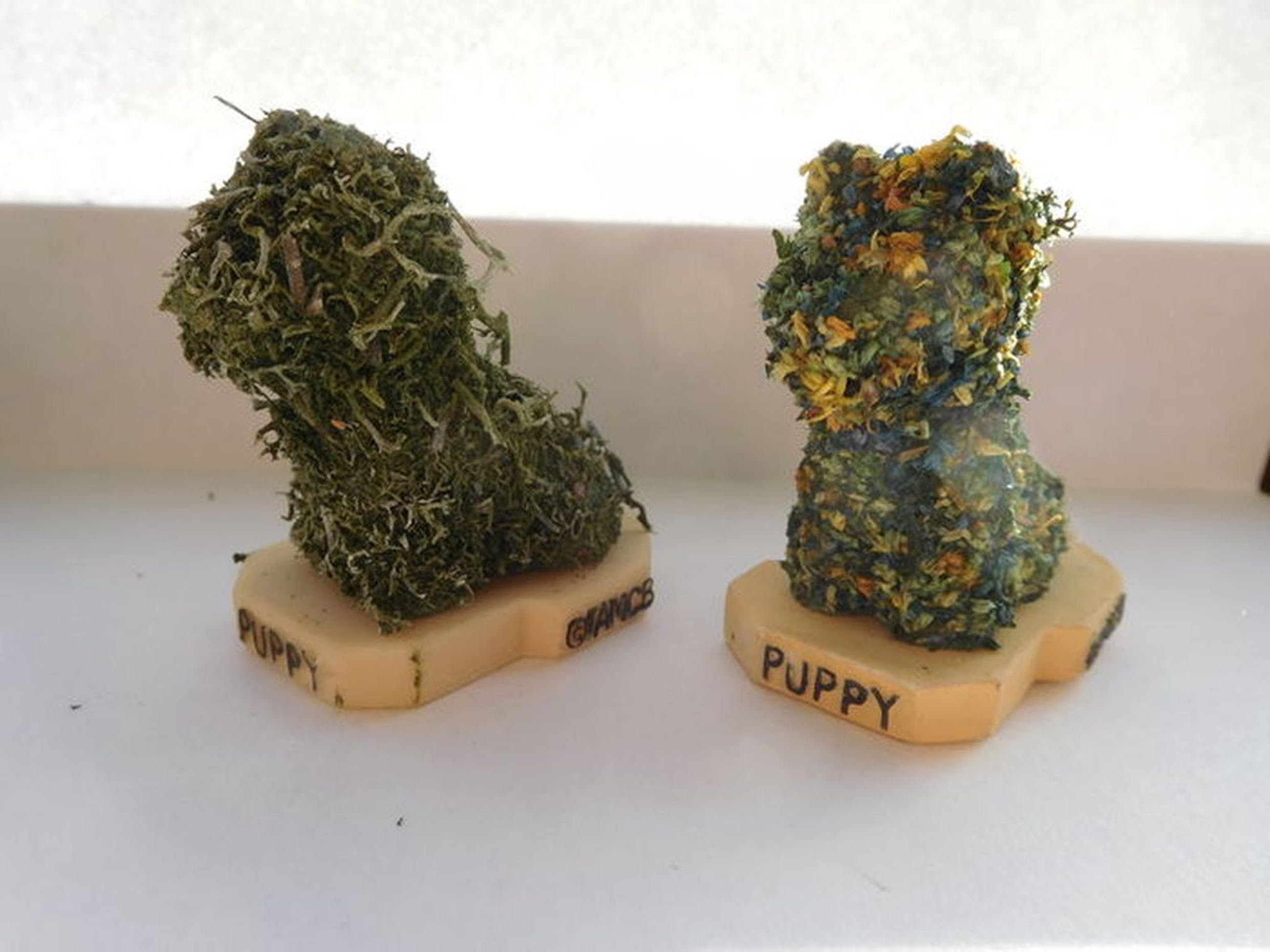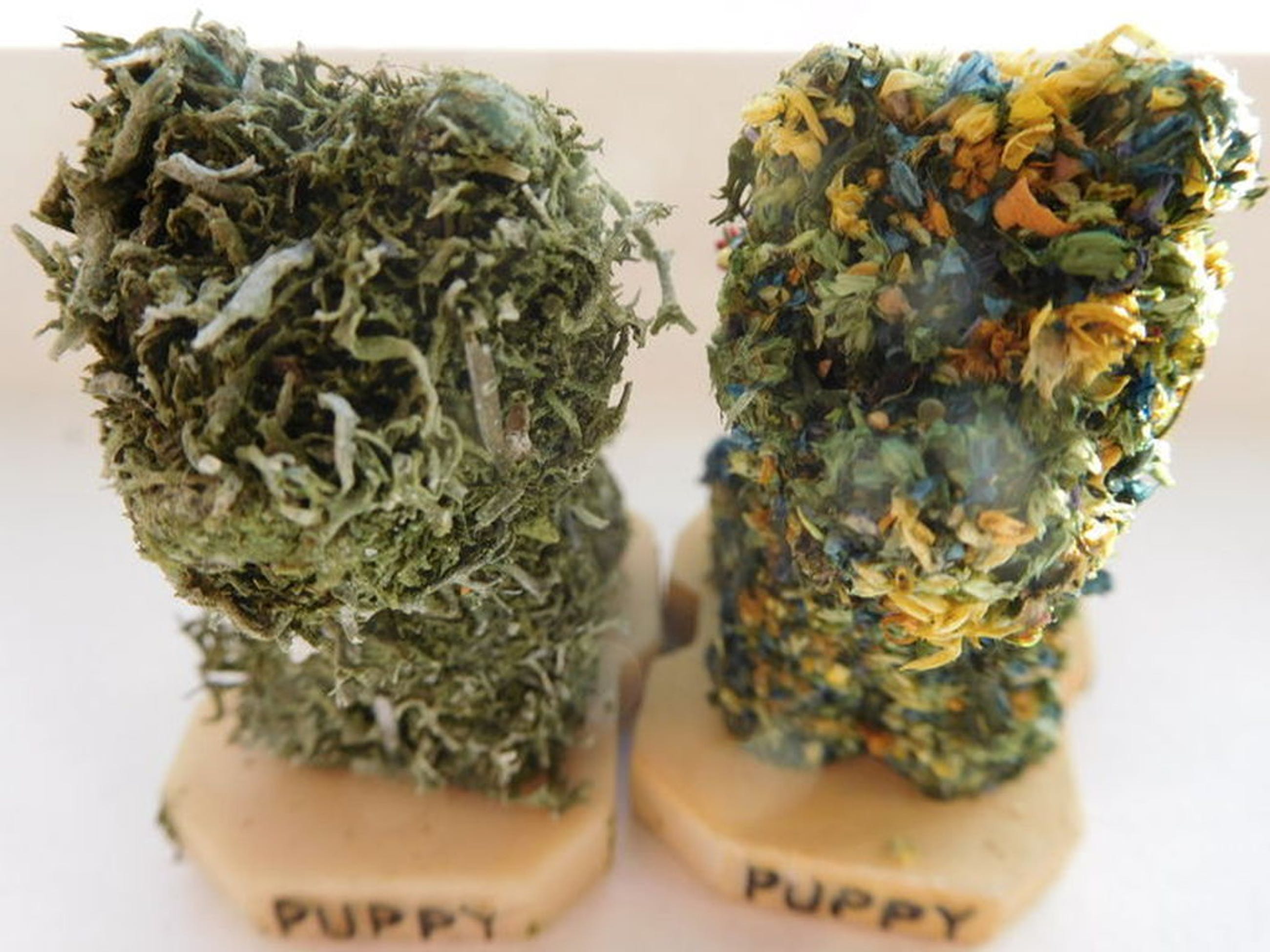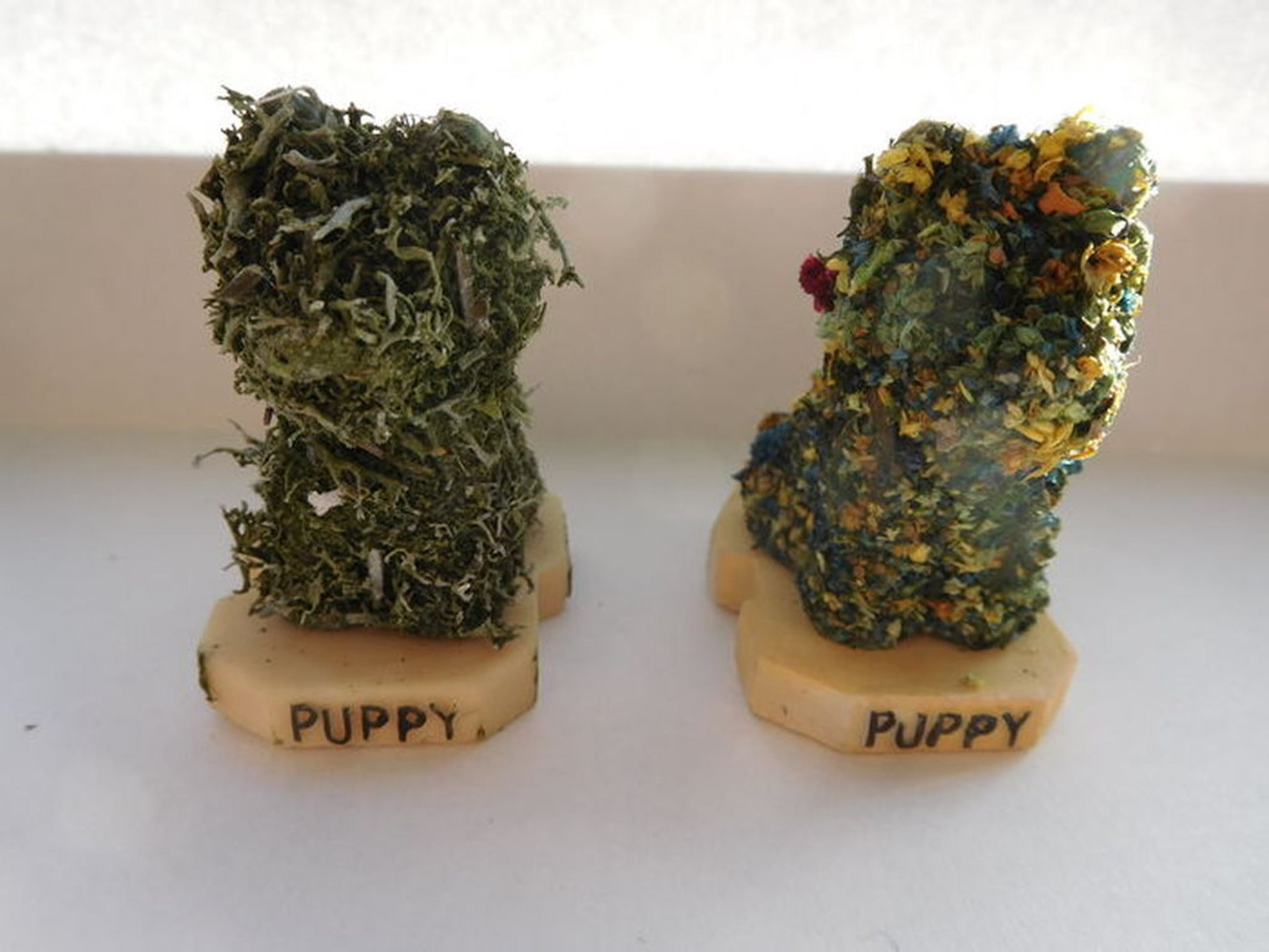 Twee met de hand versierde en daardoor unieke mini Puppy's met droogbloemetjes (1 is geel, blauw groen en 1 met groen rendiermos) naar oorspronkelijk kunstwerk van Jeff Koons.