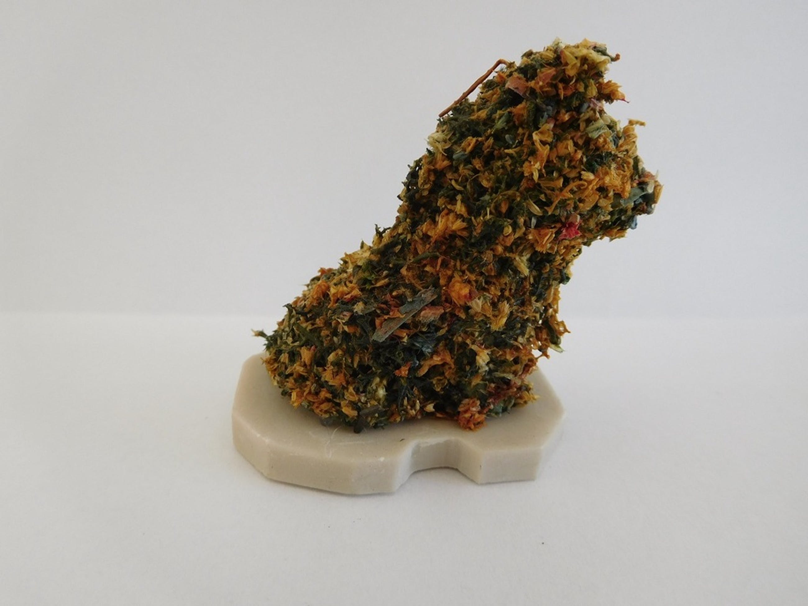 Dit leuke oranje kleine exemplaar is met de hand versierd met droogbloemen en is een kleine versie van het grote exemplaar, op een sokkeltje met het opschrift "c. TAMCB en "Puppy". Met oranje droogbloemetjes. Het werk van Koons brengt topprijzen op !
