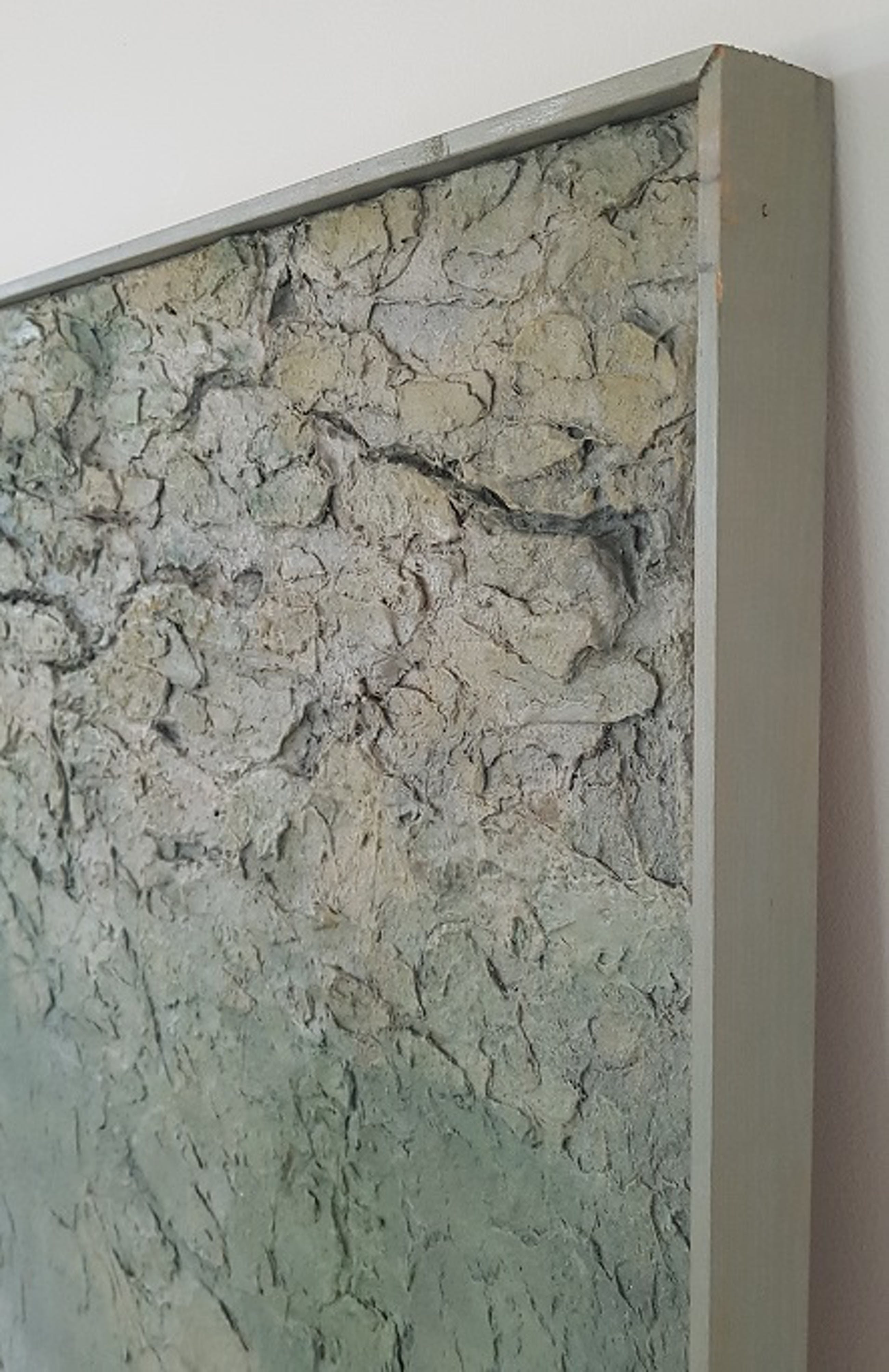 Inspiratiebron is de Waddenkust waar land ontstaat door aanslibbing. In de pasteuse verf is slik verwerkt uit de Waddenzee en deze pasta is aangebracht in een ca 7 mm dikke verflaag.