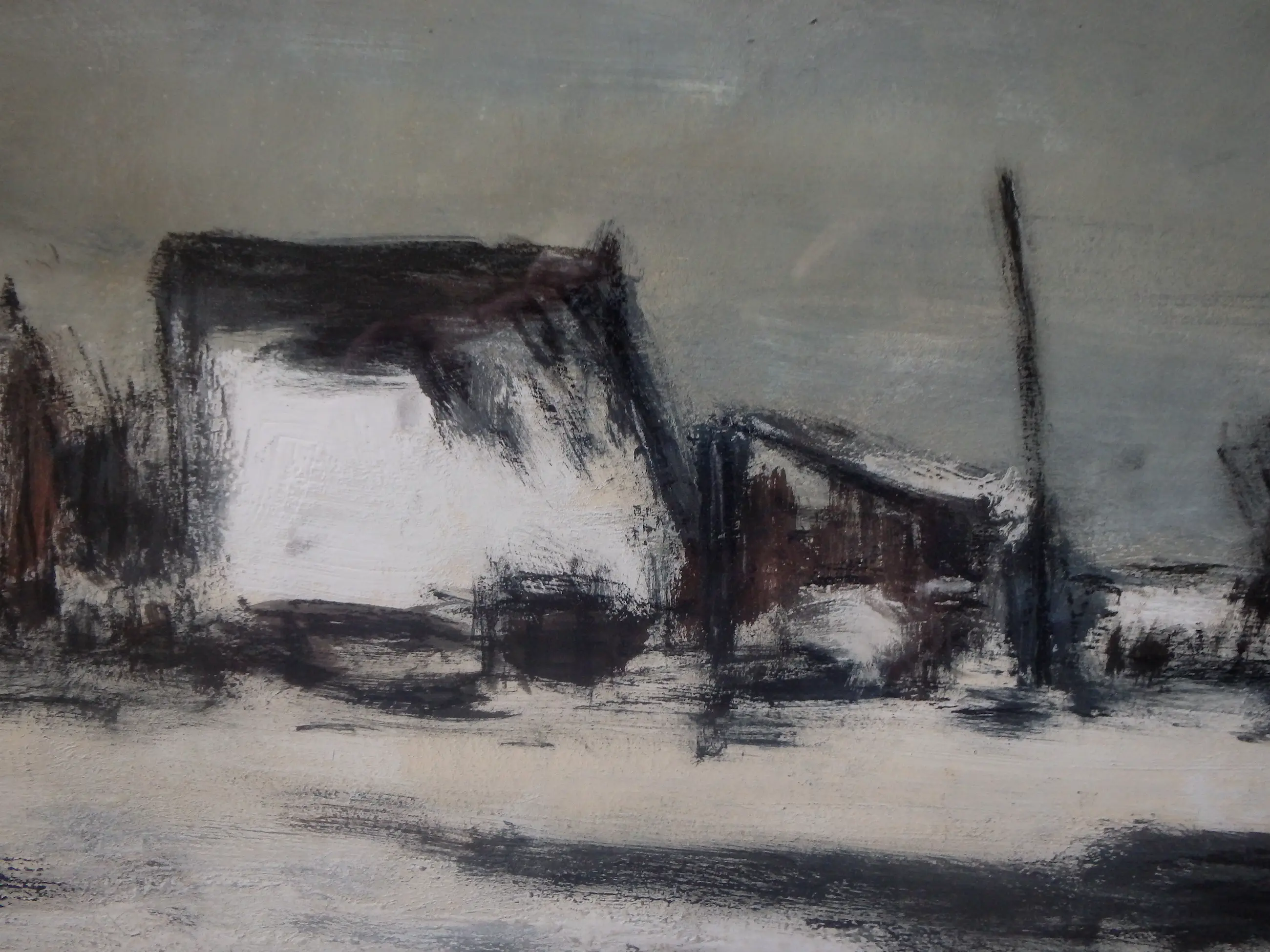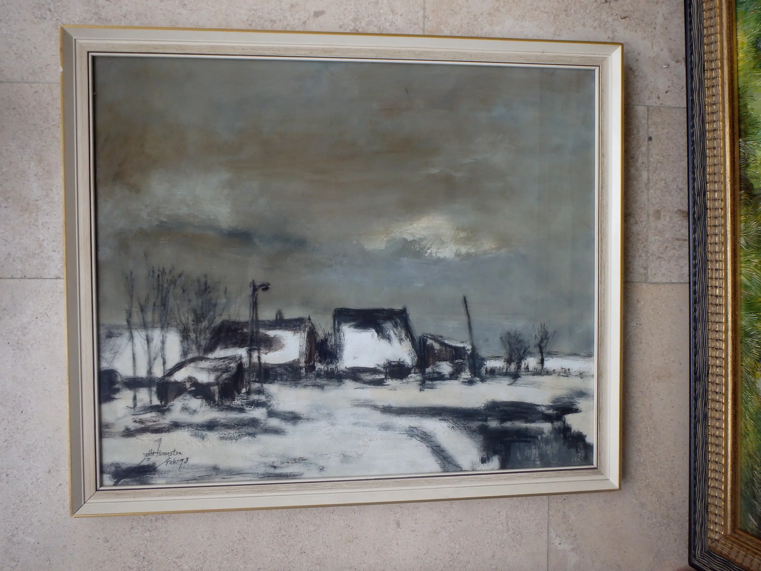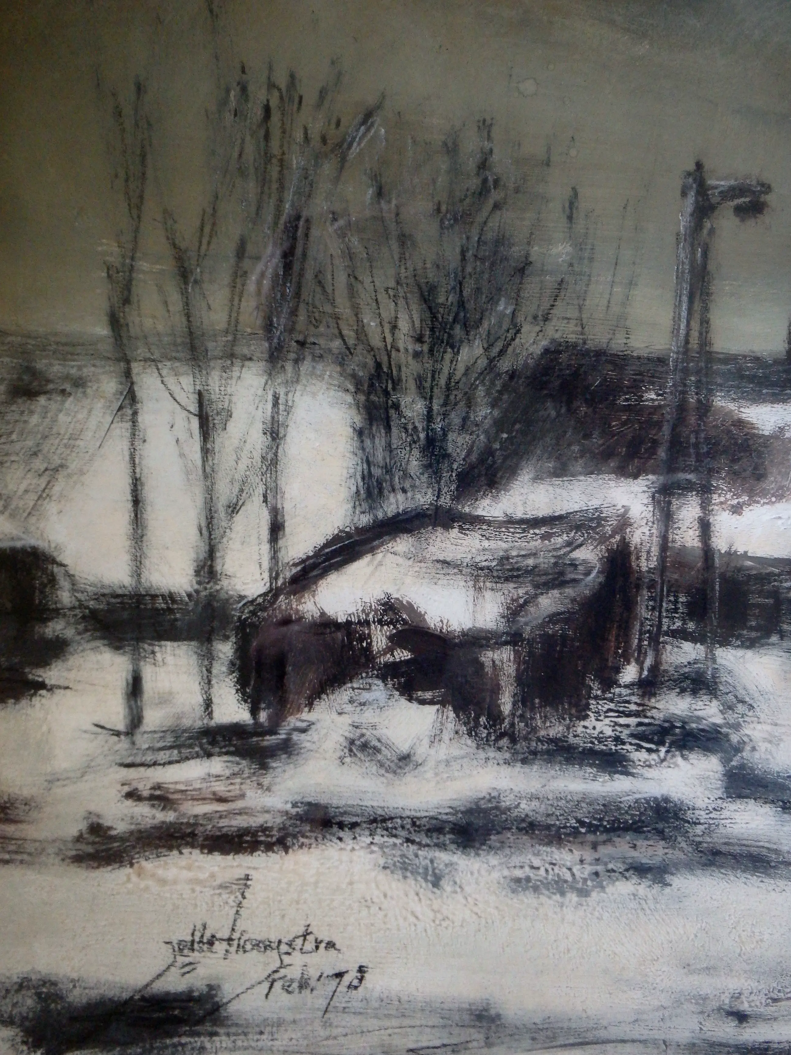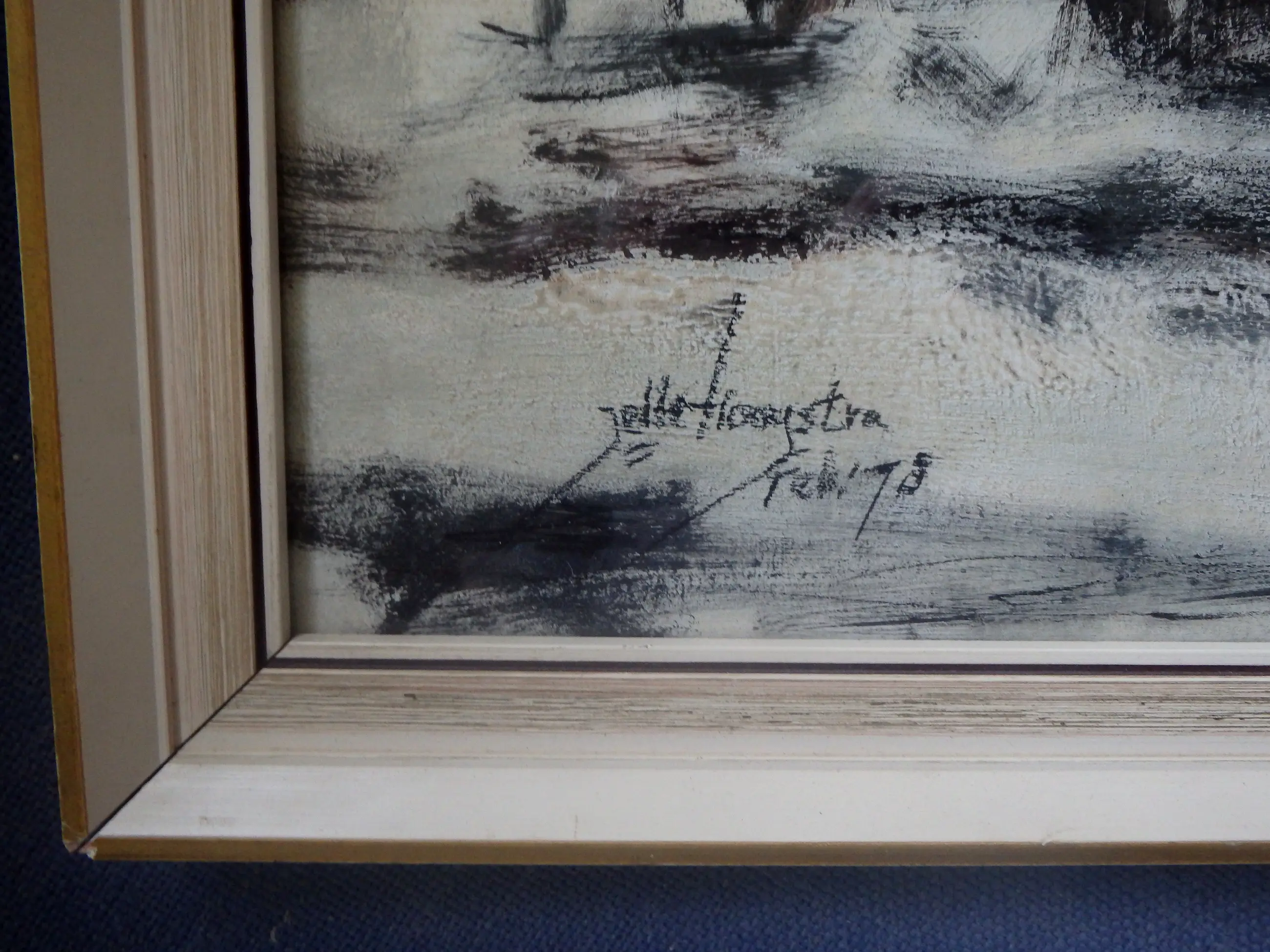 Gemengde techniek, olieverf, dekverf en houtskool 44x52 cm., linksonder gesigneerd Jelle Hoogstra en gedateerd feb. '78, netjes ingelijst achter glas.