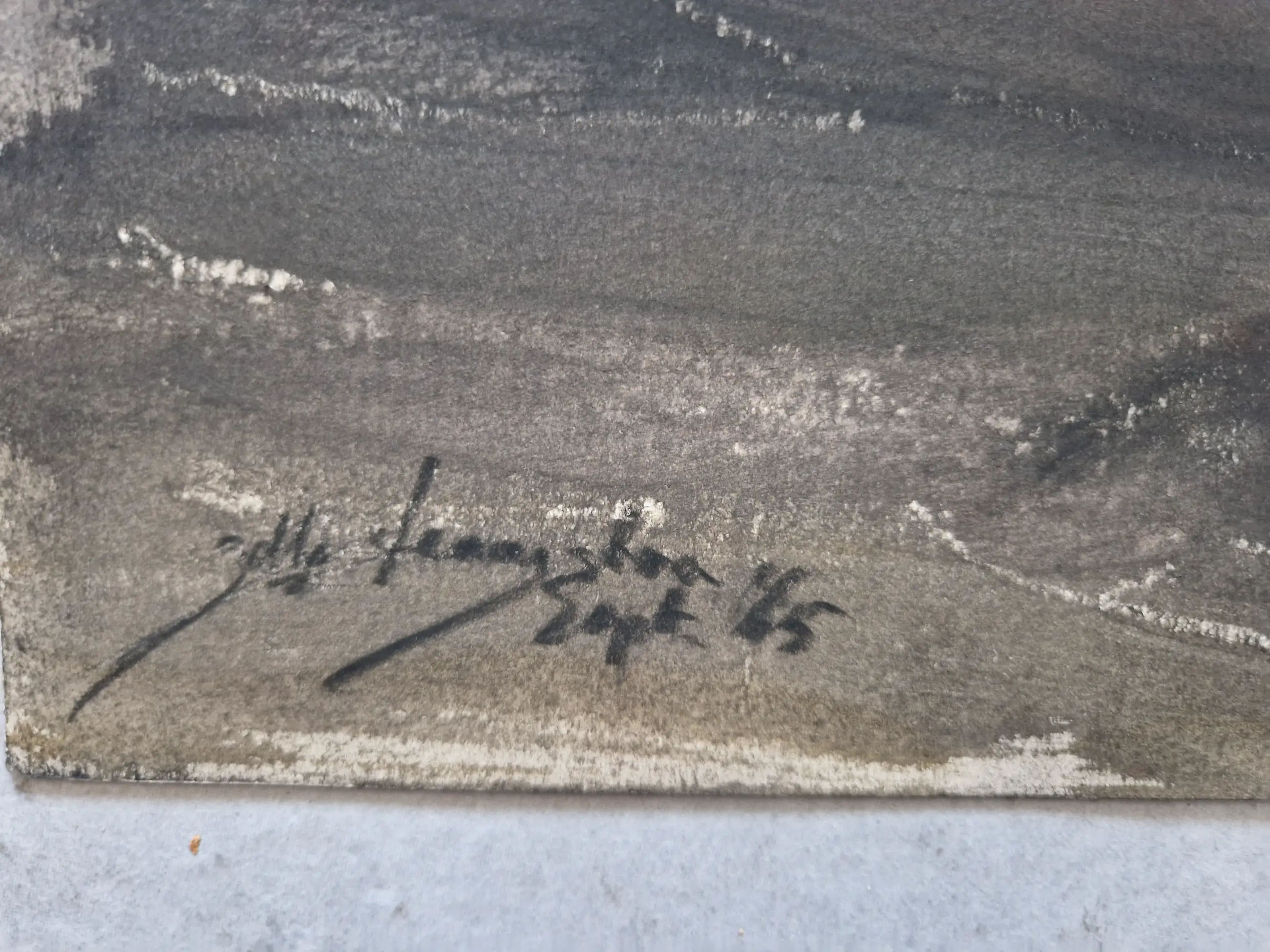 De Friese kunstenaar Jelle Hoogstra (1924-2003) begon zijn kunstenaarsopleiding, op achttienjarige leeftijd, in 1942 aan de academie “kunst-oefening “ te Arnhem. Helaas kon hij vanwege de oorlogssituatie zijn opleiding niet afmaken, maar direct na de bevrijding schreef hij zich in aan de academie van Beeldende Kunsten in Rotterdam en kon daar zijn studie voltooien. Met grote werkdrift en passie maakte hij tot op hoge leeftijd in zijn atelier gouaches, pastels en tekeningen van alles wat hem inspireerde, meestal ontsproten uit eigen fantasie. Diverse onderwerpen hadden Hoogstra’s grote aandacht, zoals landschappen, stadsgezichten, de menselijke figuur, geisha’s, dieren, stillevens en de natuur. Alhoewel hij ook veelvuldig in Frankrijk schilderde was het Hollandse landschap zijn grote inspiratiebron.