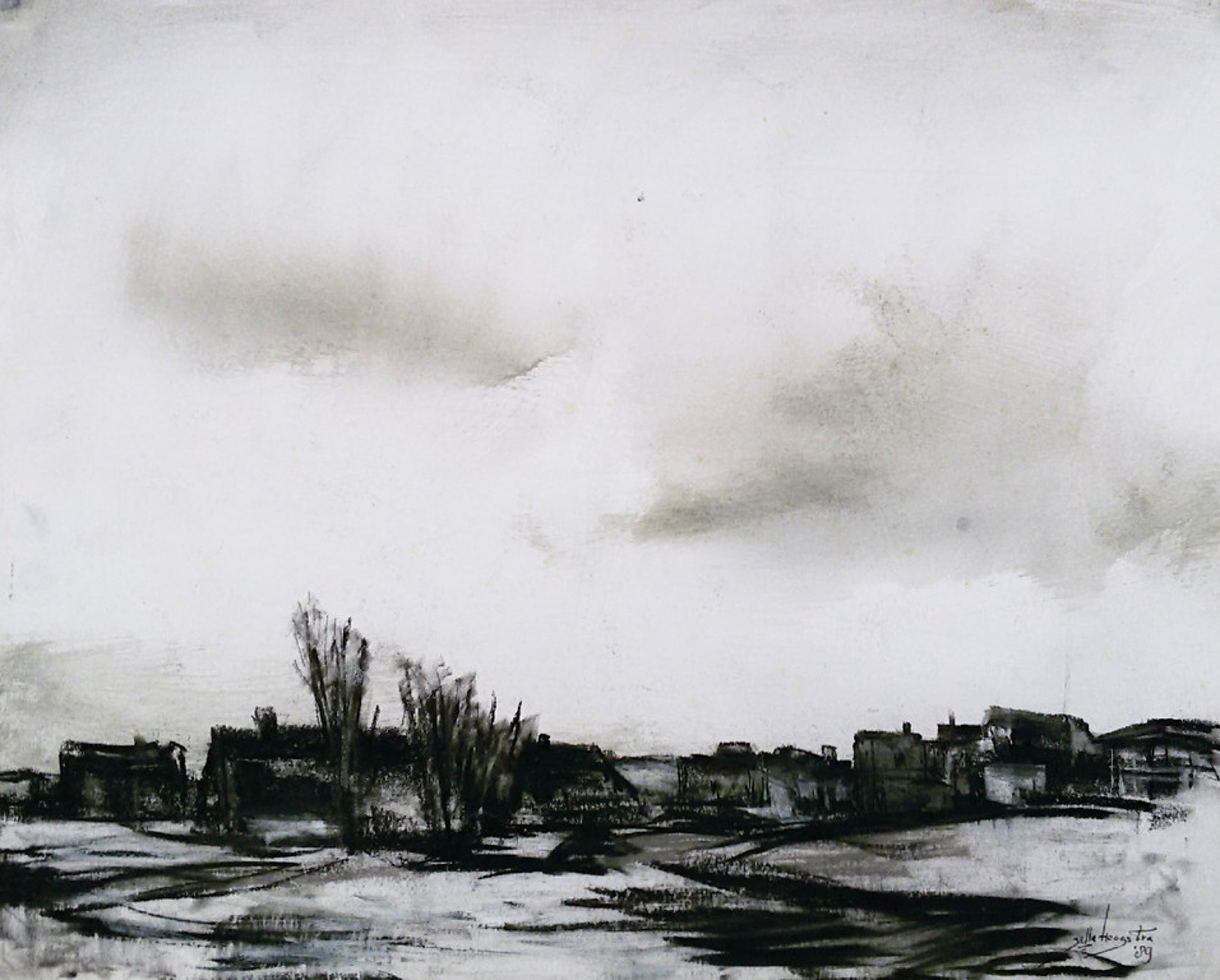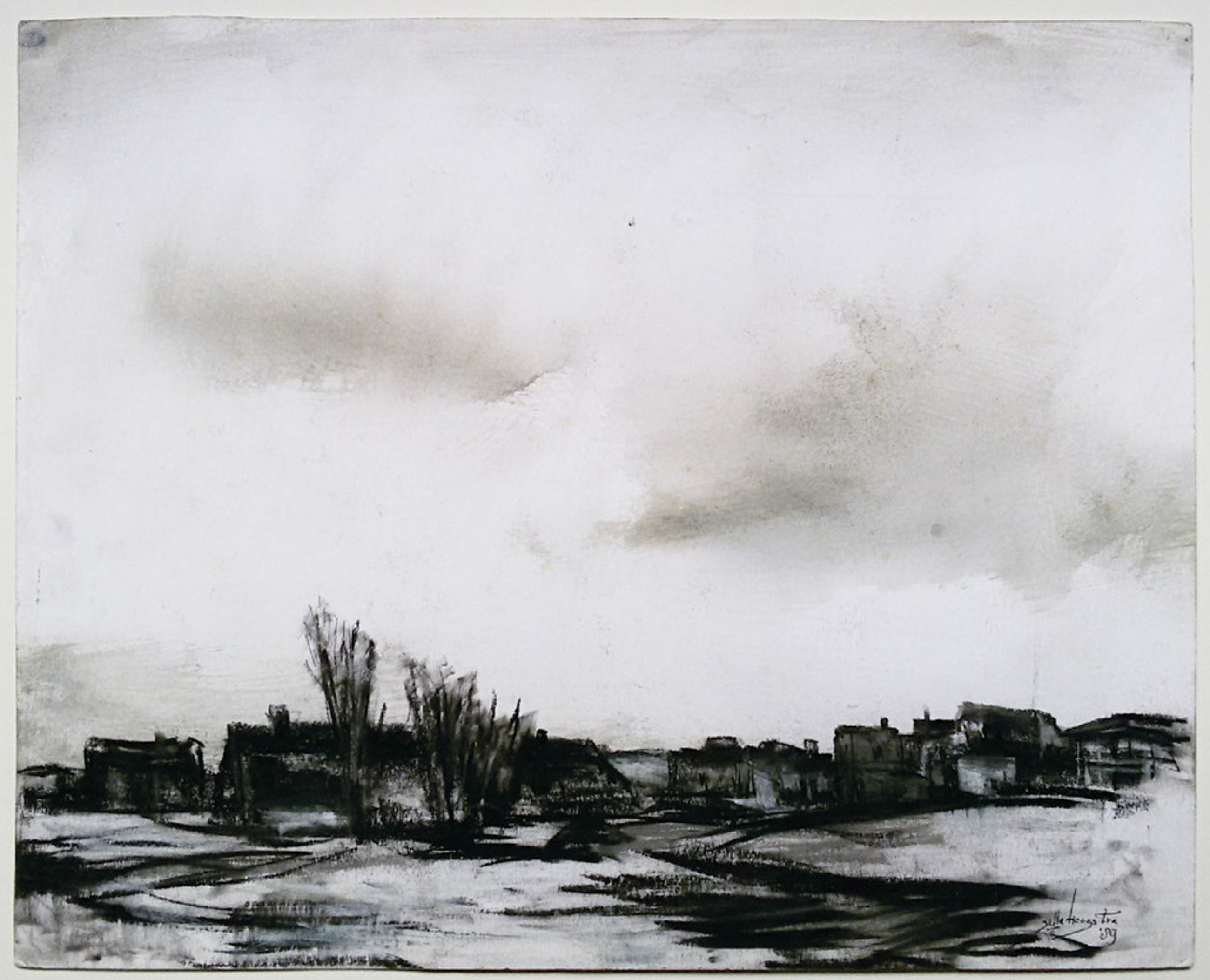 Mooi, rauw werk van Jelle Hoogstra, geboren Fries maar van zijn studie tot aan zijn dood werkzaam in Rotterdam. Gemengde techniek op dik papier, gesigneerd en gedateerd (‘89) rechtsonder. In uitstekende conditie, alleen vier punaisegaatjes in uiterste hoeken.