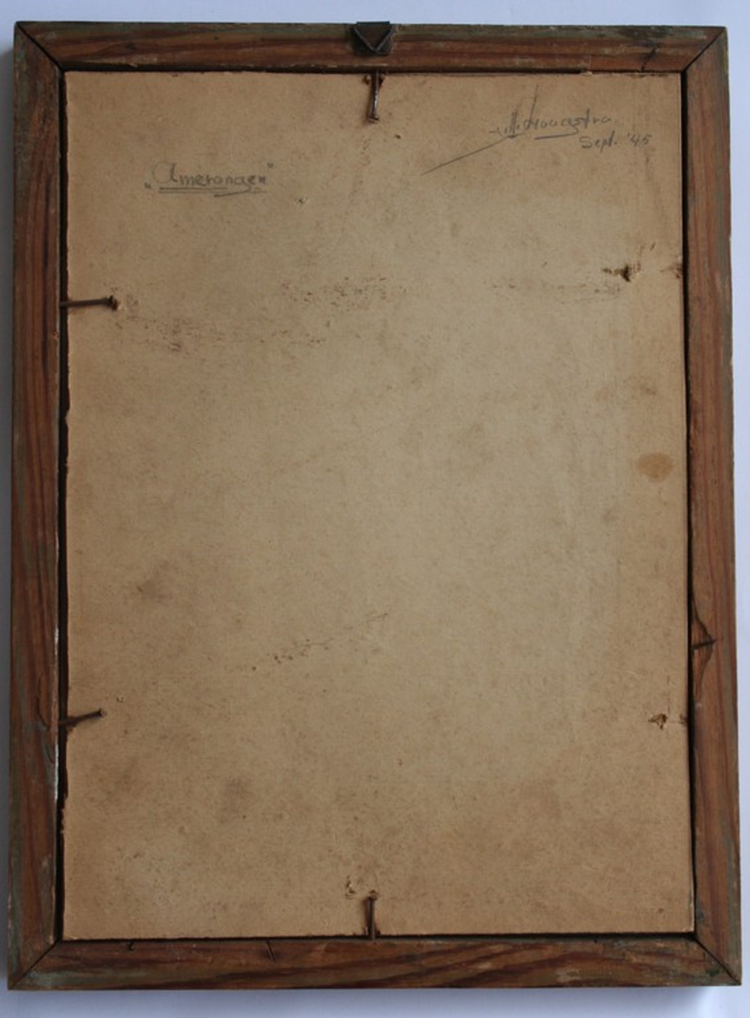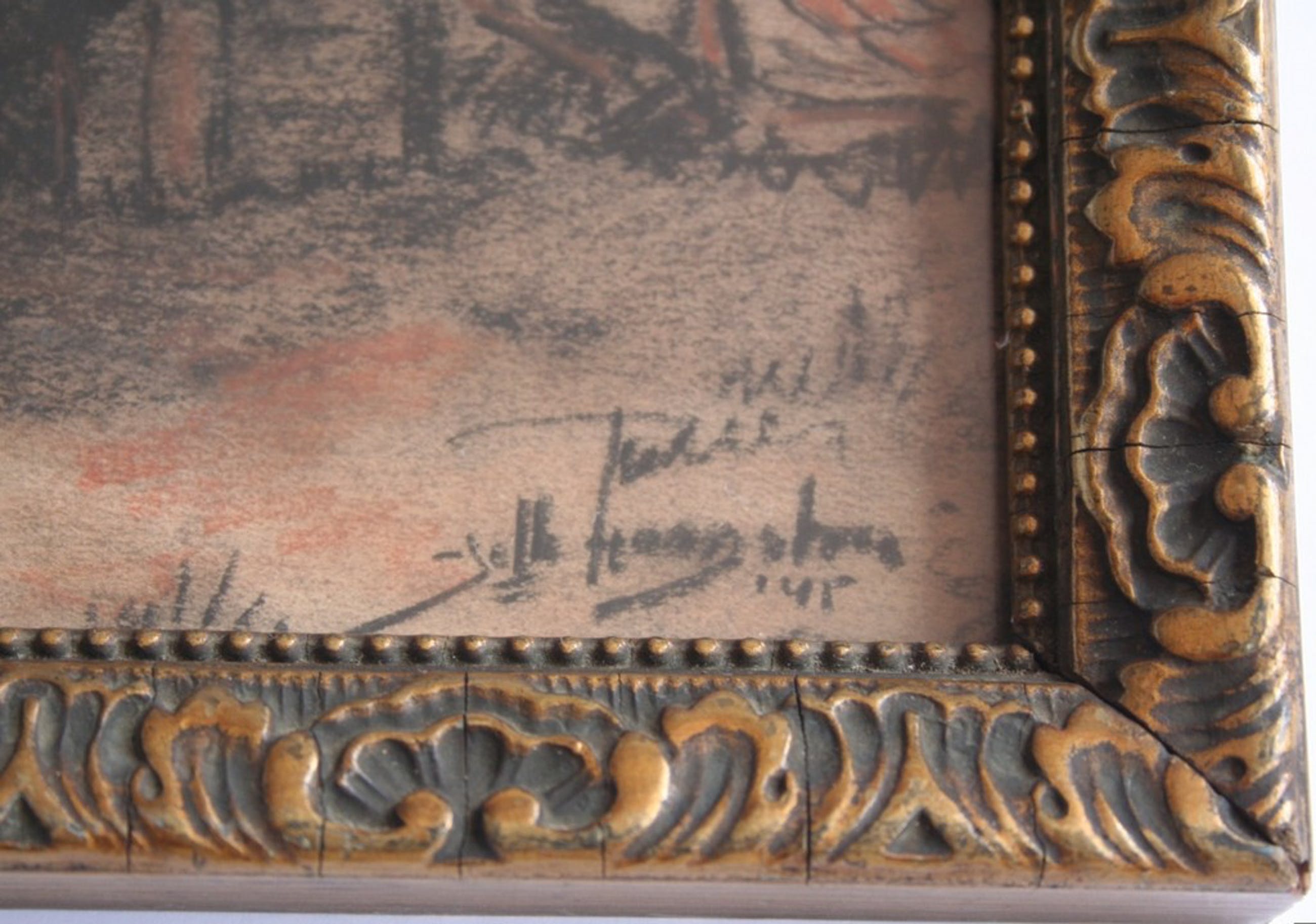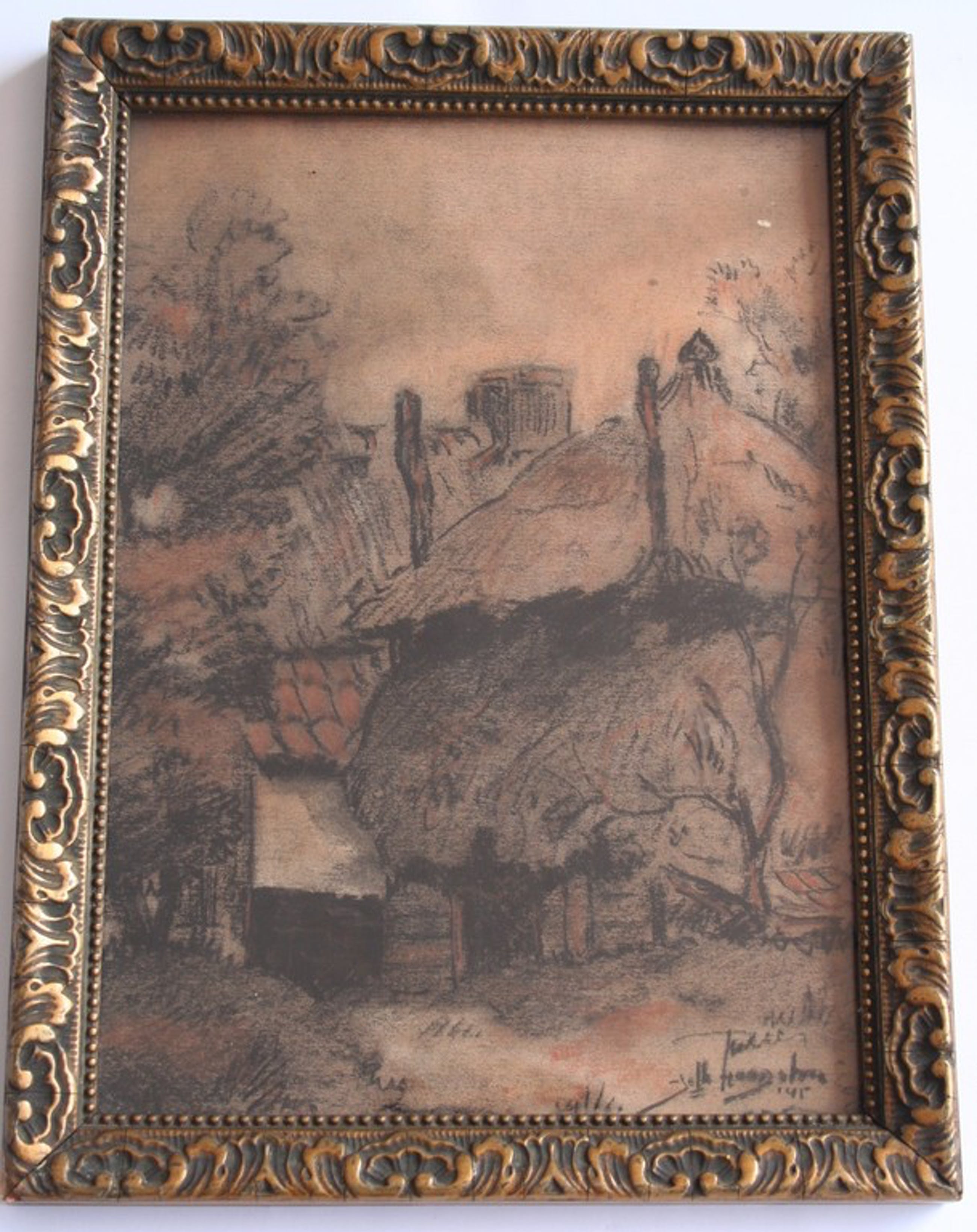 - Een afbeelding is een van een deel van een boerderij. Tekening is van houtskool met kleurpastel, gedateerd '45 en gesigneerd. Aan de achterzijde staat Amerongen en sept. '45. Afmeting is 27 x 20 cm. Lijstje is 1,5 cm breed.
