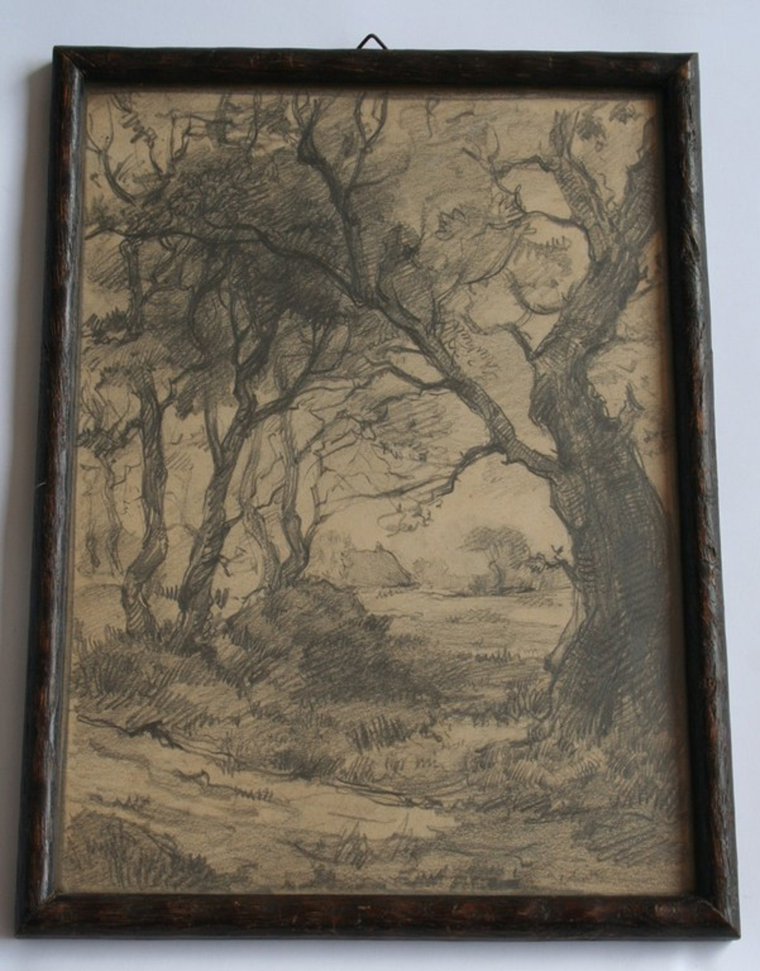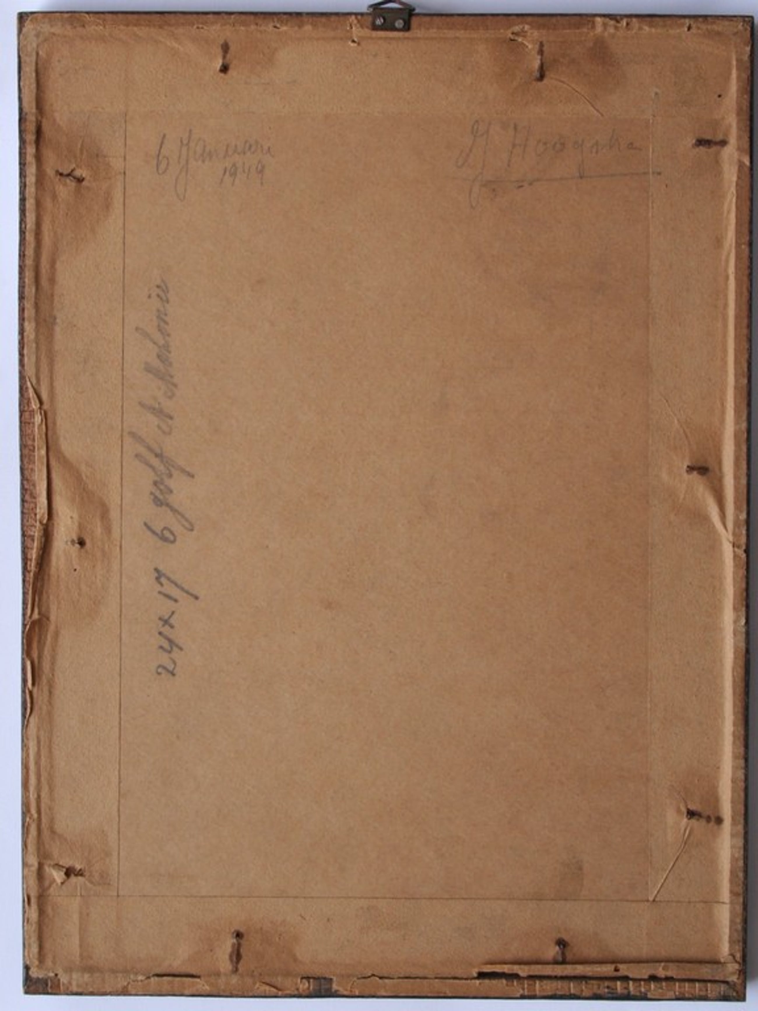 - Een afbeelding is van een groepje bomen met op de achtergrond een boerderij. Tekening is potlood. Gesigneerd aan de achterzijde door Hoogstra. Bijgeschreven datum 6 januari 1949. Afmeting is 24 x 17 en met lijstje 25.5 x 18.5 cm.