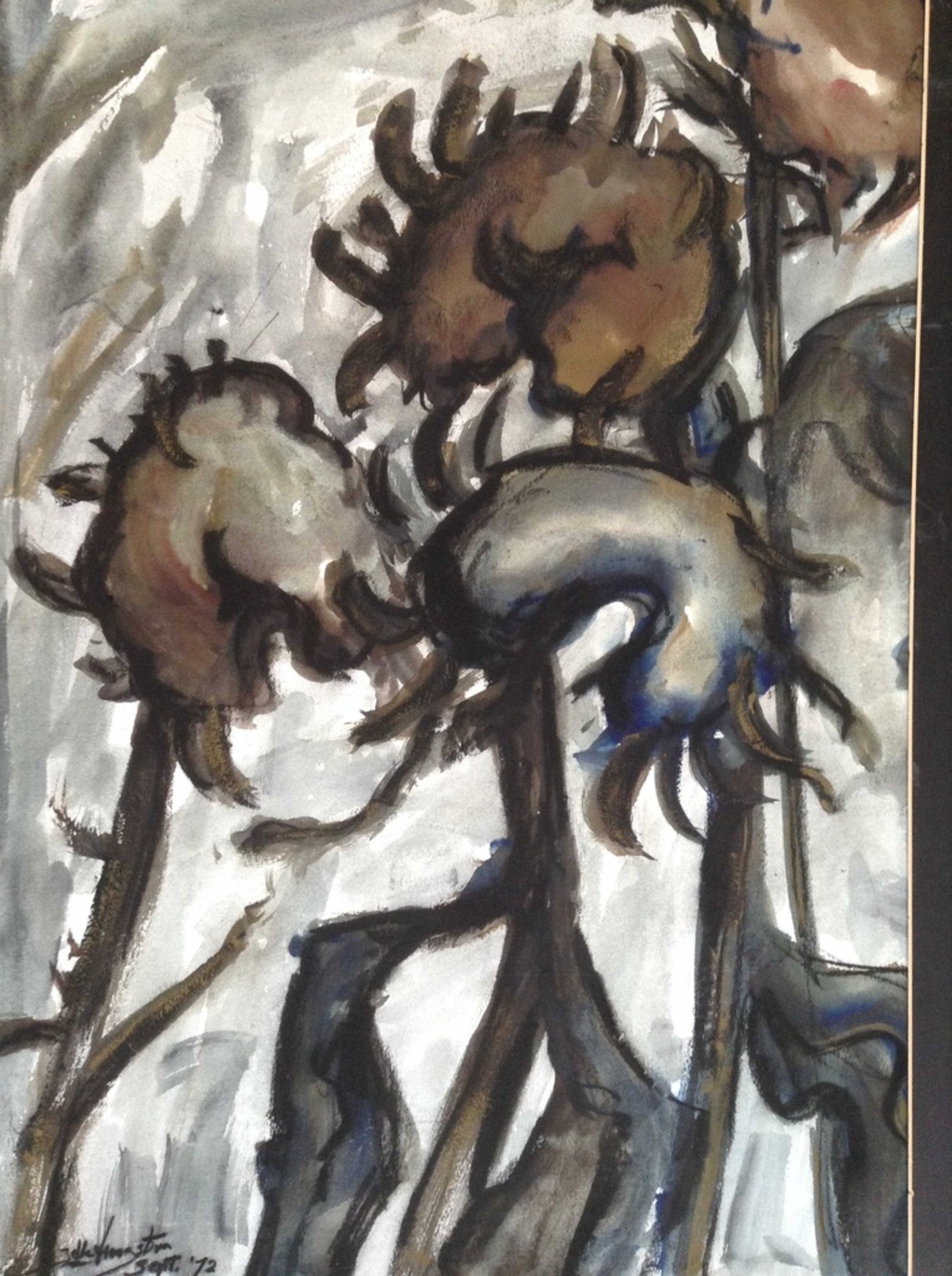 Een fraai impressionistisch stilleven met uitgebloeide zonnebloemen. Werk van uitzonderlijke kwaliteit. Is rechtsonder gesigneerd.
