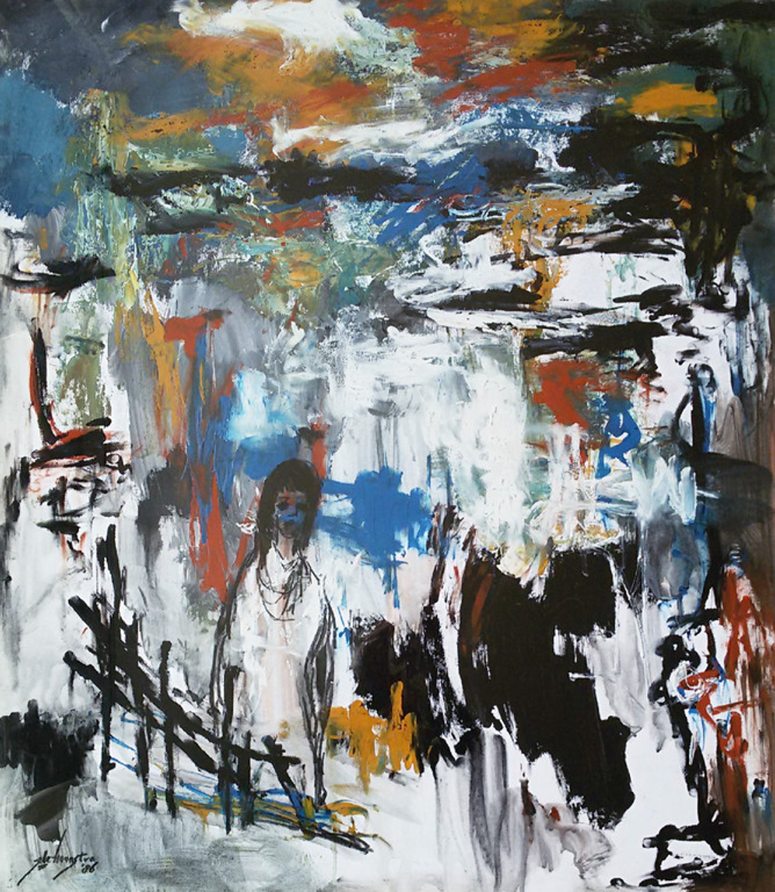 Prachtig, groot werk van de Friese kunstenaar Jelle Hoogstra. Gouache op dik papier, gesigneerd en gedateerd (‘86) linksonder. In strakke, aluminium lijst, alles in zeer goede conditie.