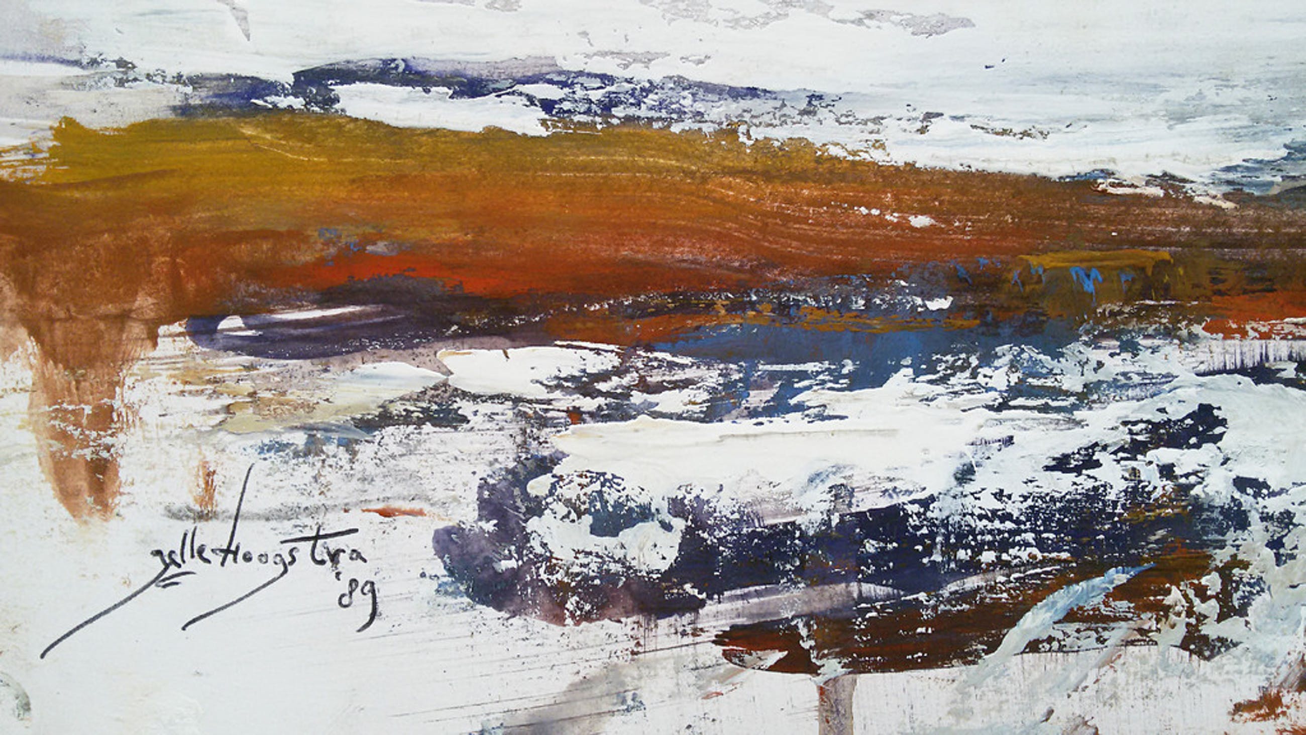 Prachtig, karakteristiek werk van de Friese kunstenaar Jelle Hoogstra. Gouache op dik papier, gesigneerd en gedateerd (‘89) linksonder. In uitstekende conditie, alleen vier punaisegaatjes in uiterste hoeken.