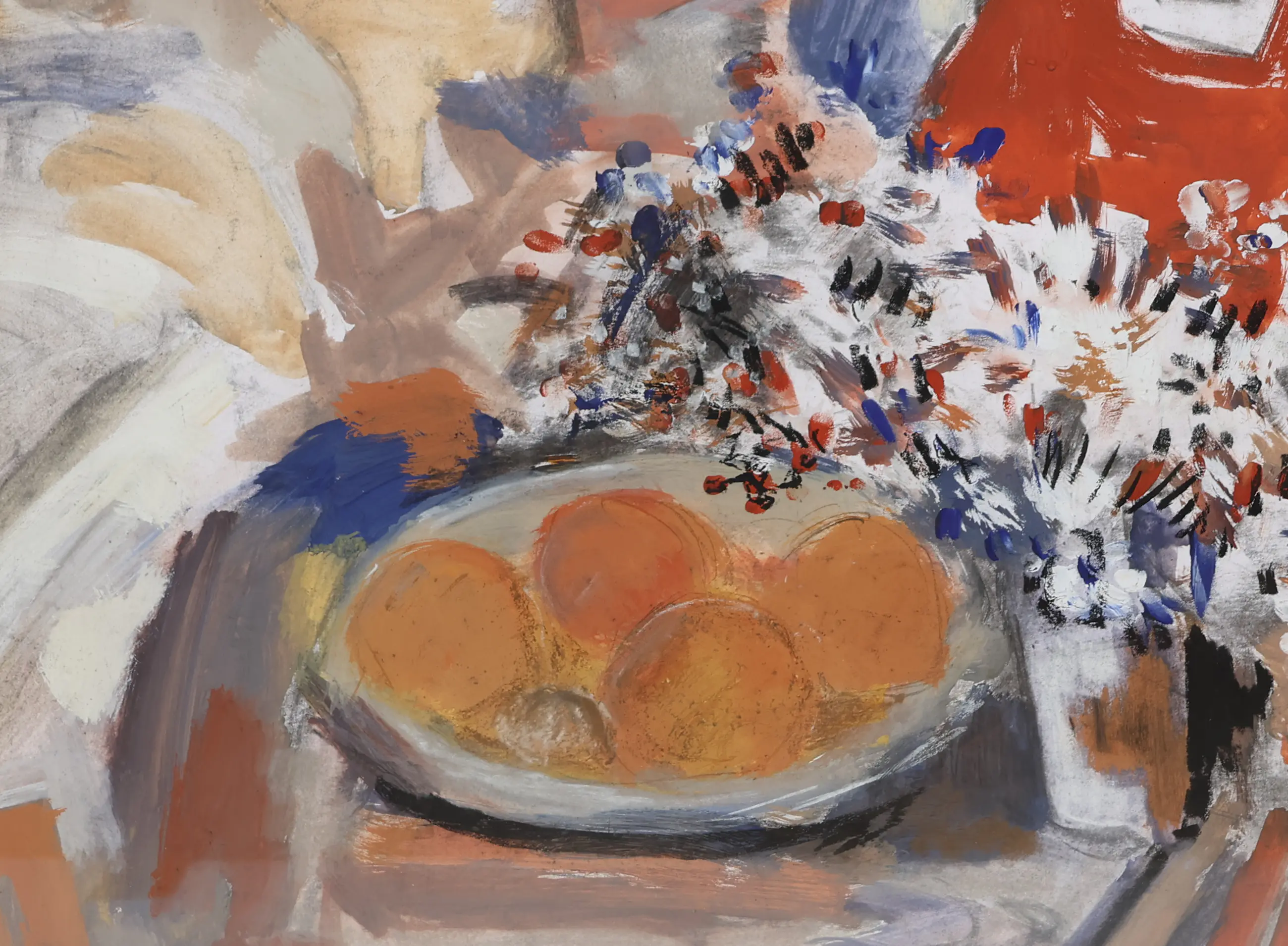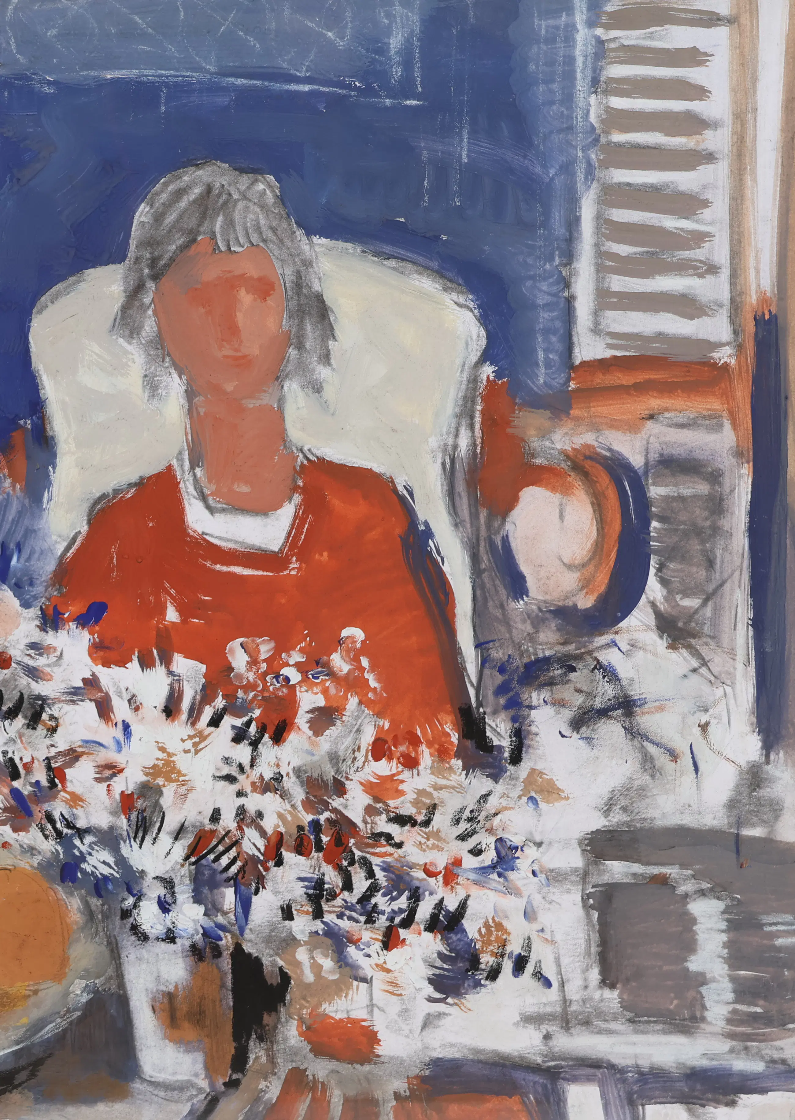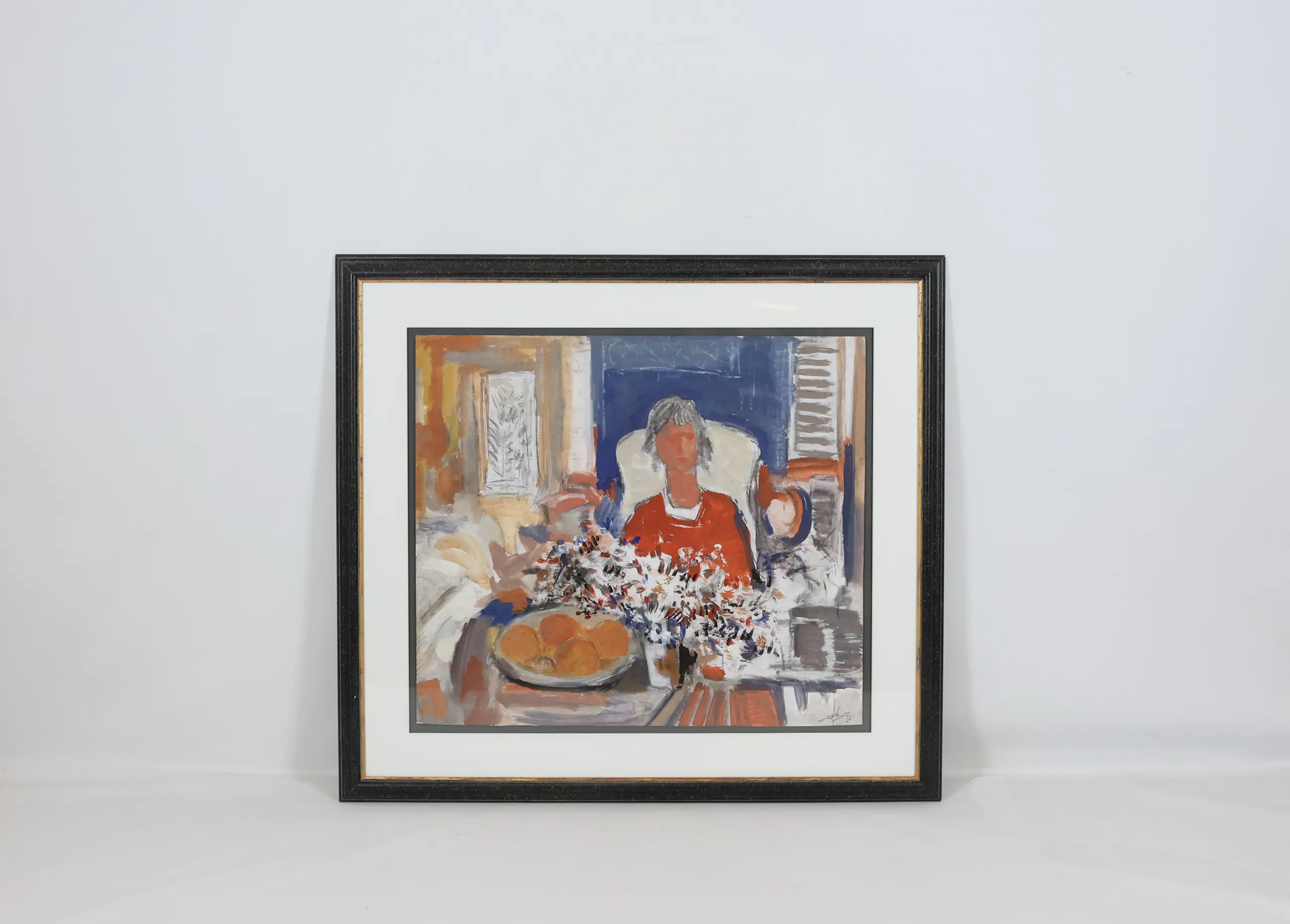Dit werk op papier, getiteld Zondagmiddag, toont een figuur die in alle rust aan tafel zit, omringd door bloemen en een schaal. Is het de verbeelding van een ideale zondagmiddag, of juist het tegenovergestelde?