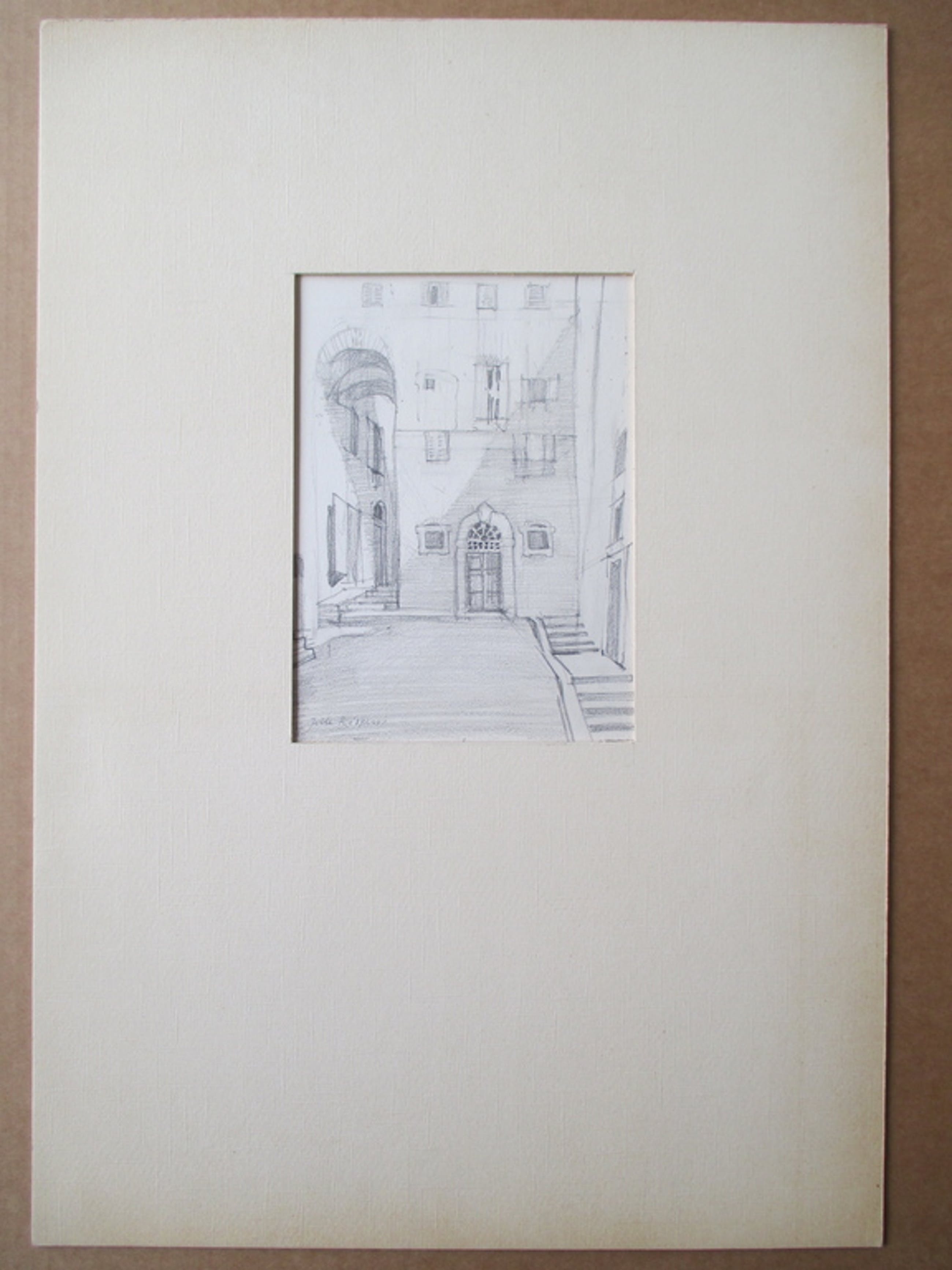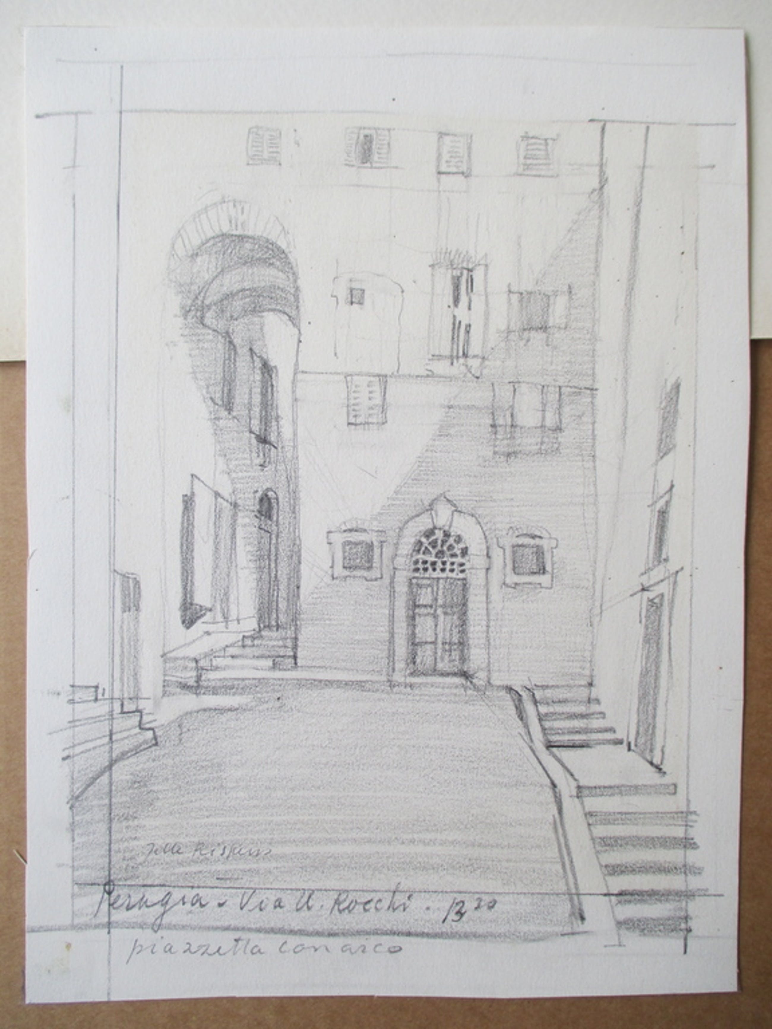Potloodtekening van Jelle Rispens, l.o gesigneerd, "Perugia- Via Il Rocchi, 13.30, Piazetta con arco". Pleintje in de schaduw. Geplaatst achter passepartout, 33,9x48,9 cm, blad 17,2x23,4.