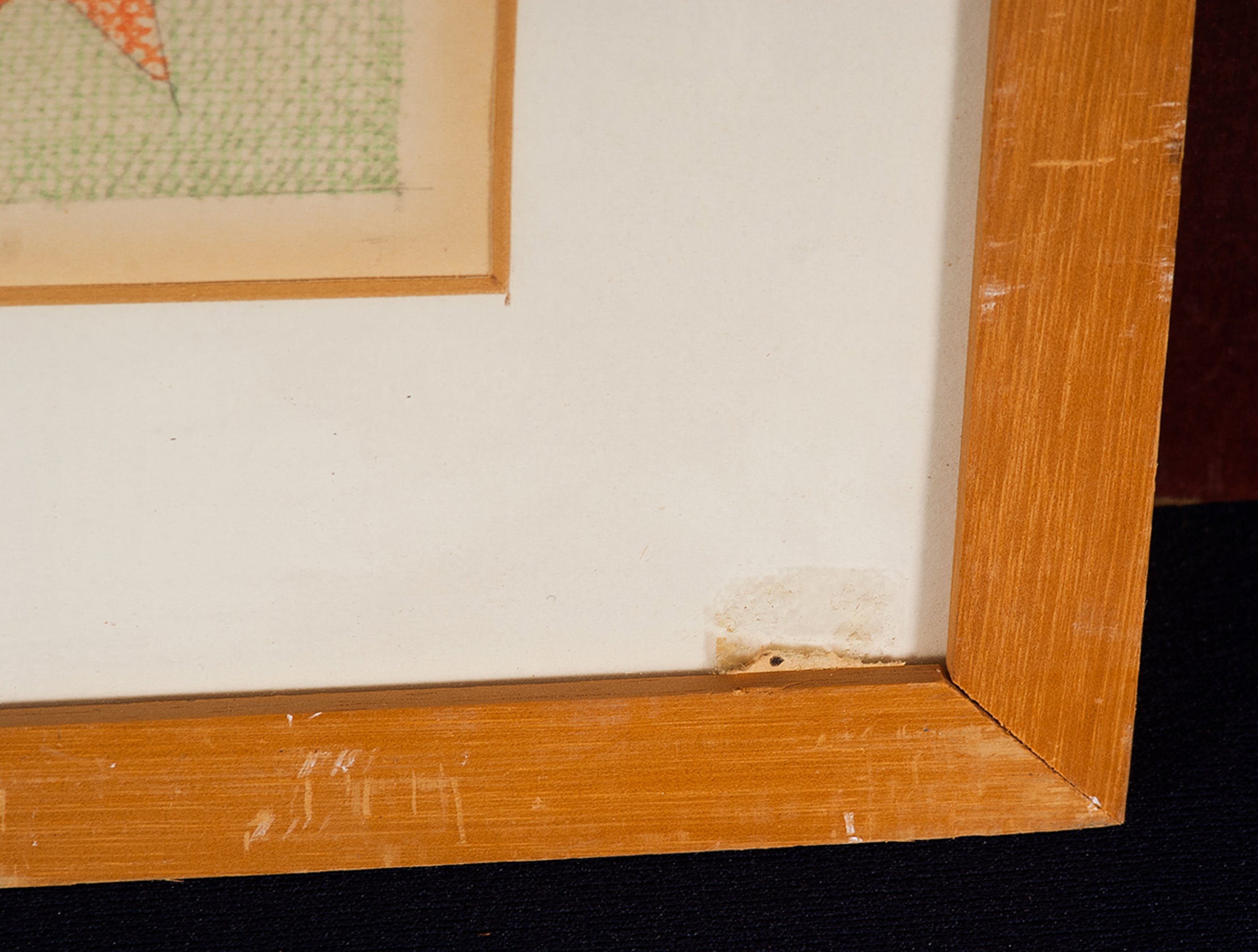 | Het blad is wat vergeeld en op de glasplaat van de lijst zijn wat resten van een sticker aanwezig. | |||