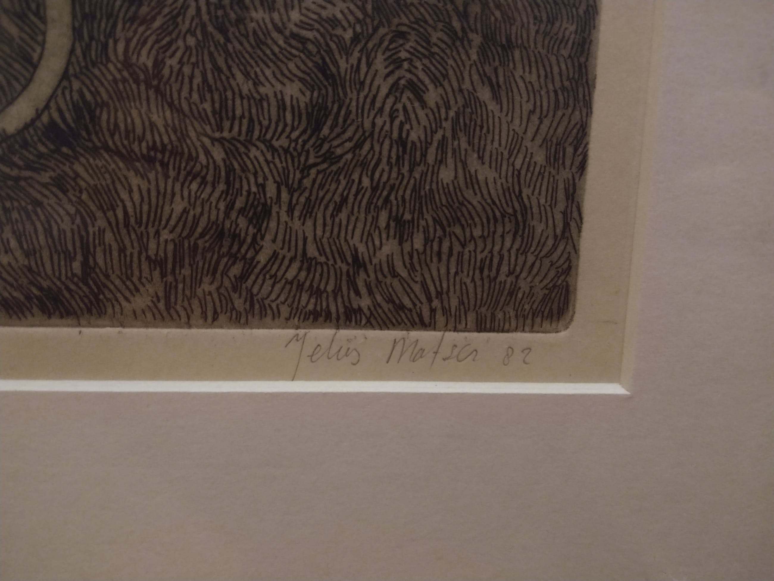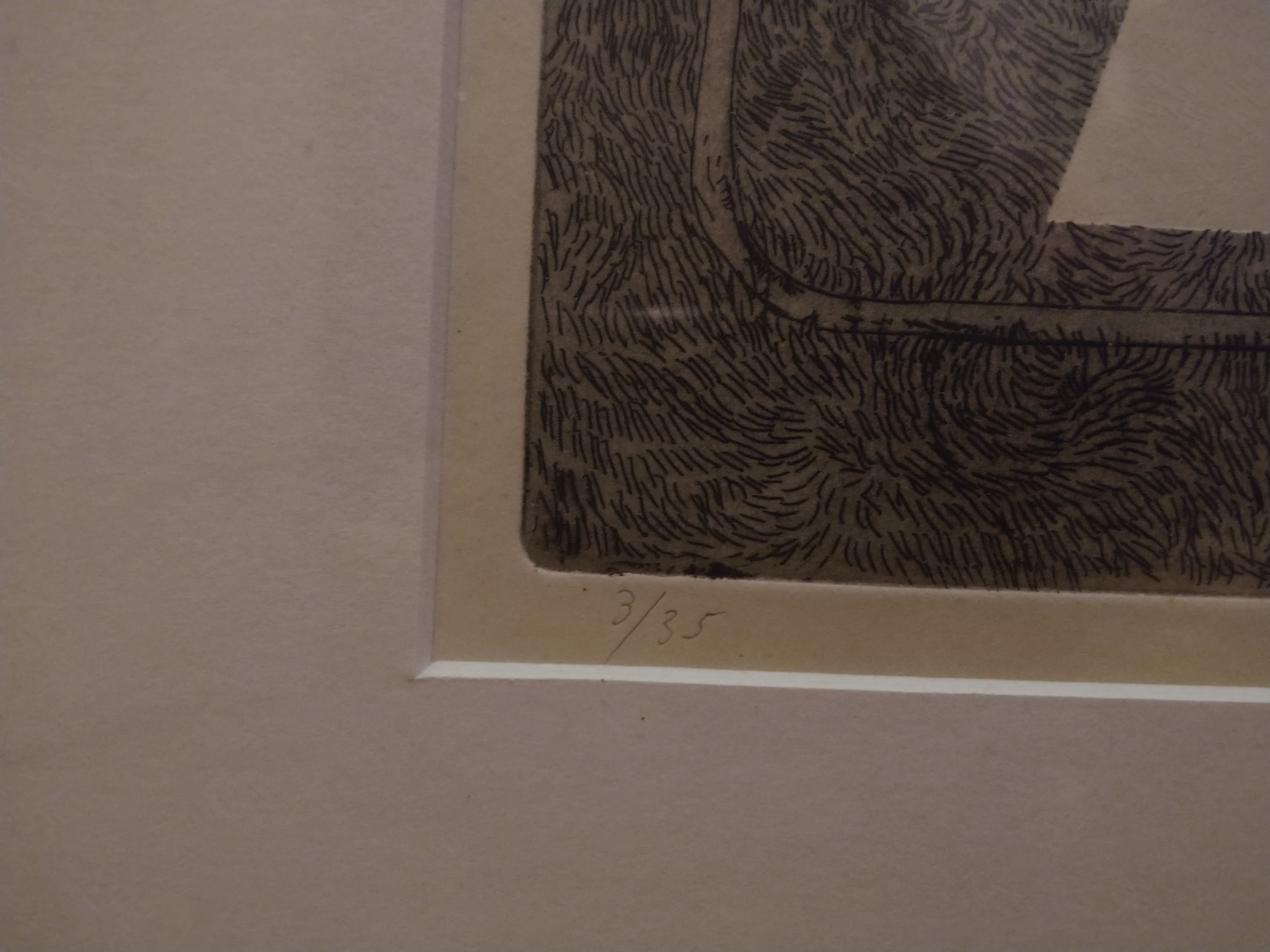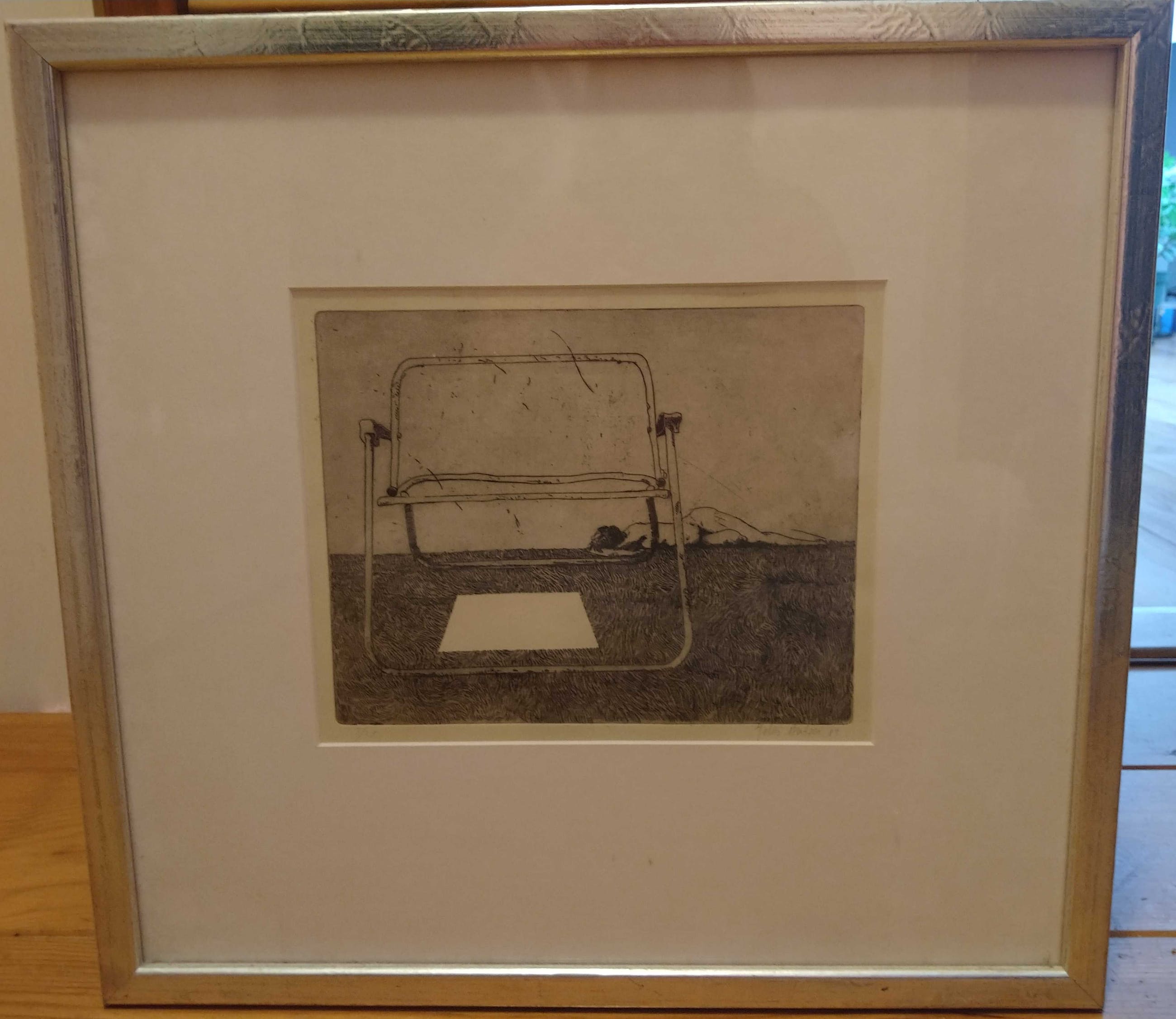 Mooi ingelijst werk van Jelus Matser. De lege stoel laat een witte schaduw achter. De naakte dame ligt op de grond achter de stoel.