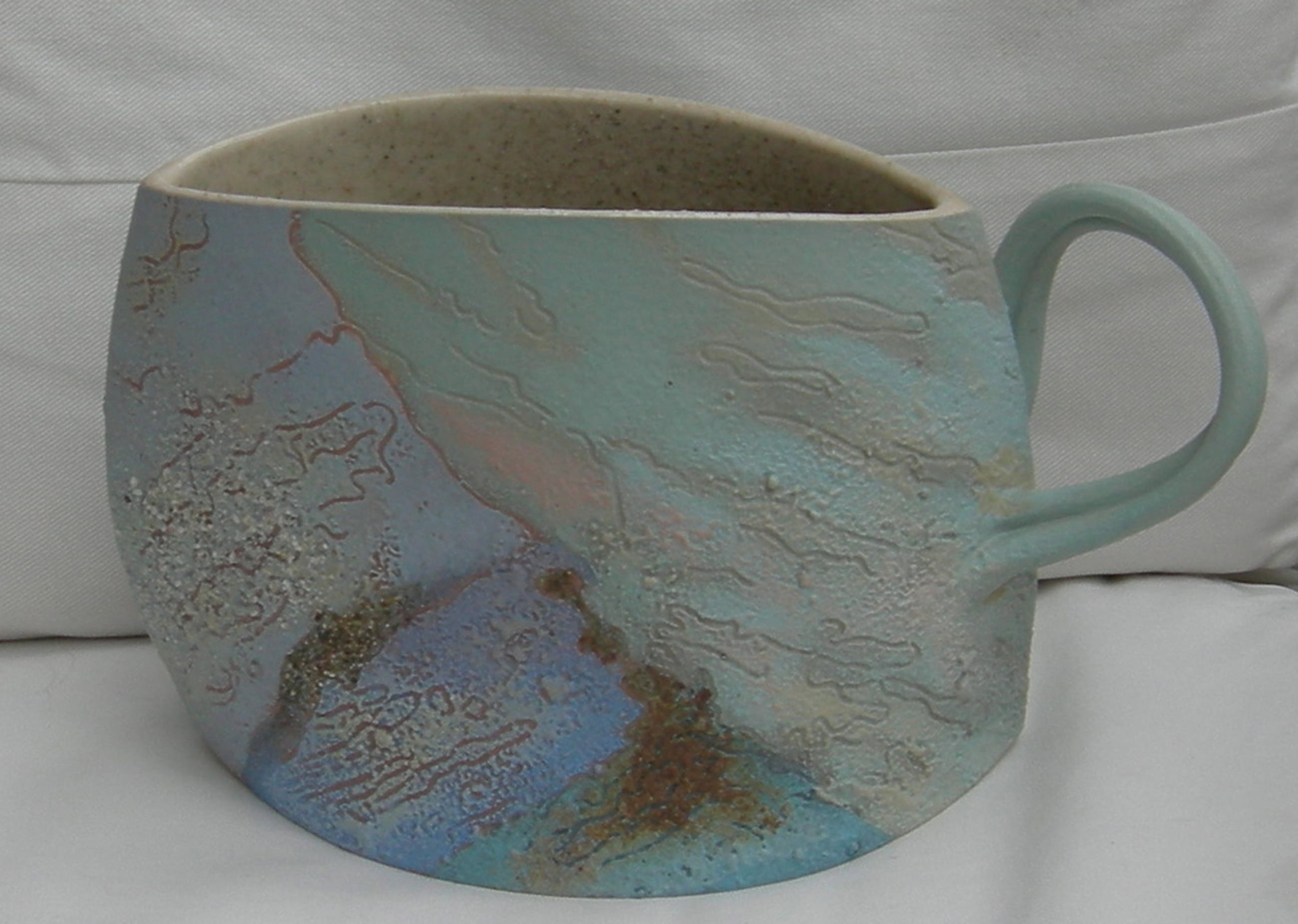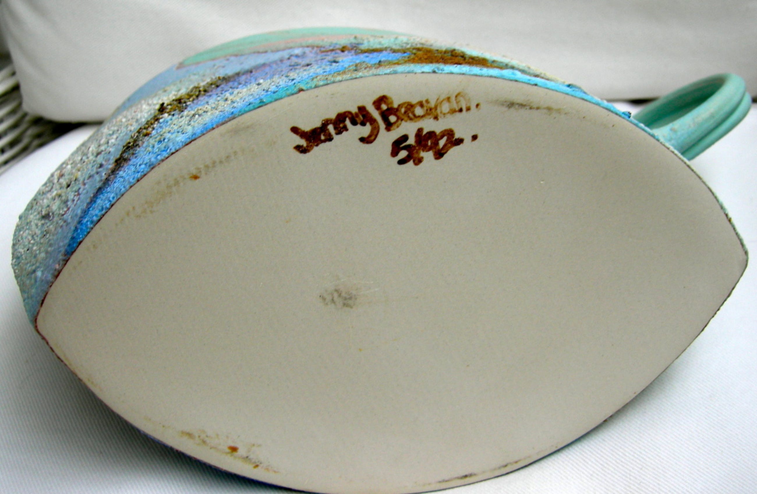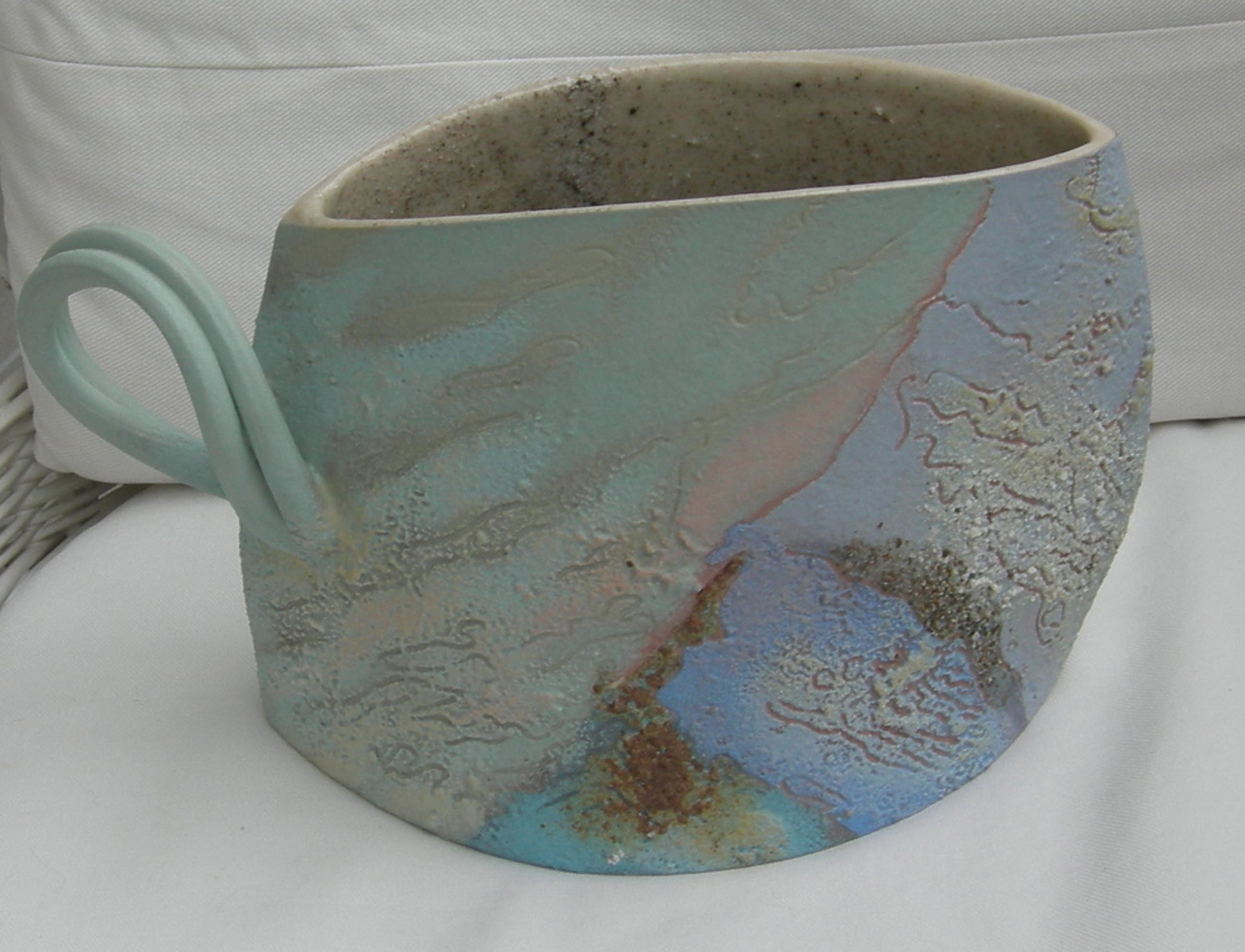 Deze kleurrijke keramische vaas met pasteltinten is door Jenny Beavan in mei 1992 gemaakt. Zij woont in Cornwall - Engeland en gebruikt buiten porcelain plaatselijke slip en zand. Deze vaas is ongeveer 14 cm. hoog en 18 cm. breed (excl. oor). Is aan de onderkant gesigneerd.