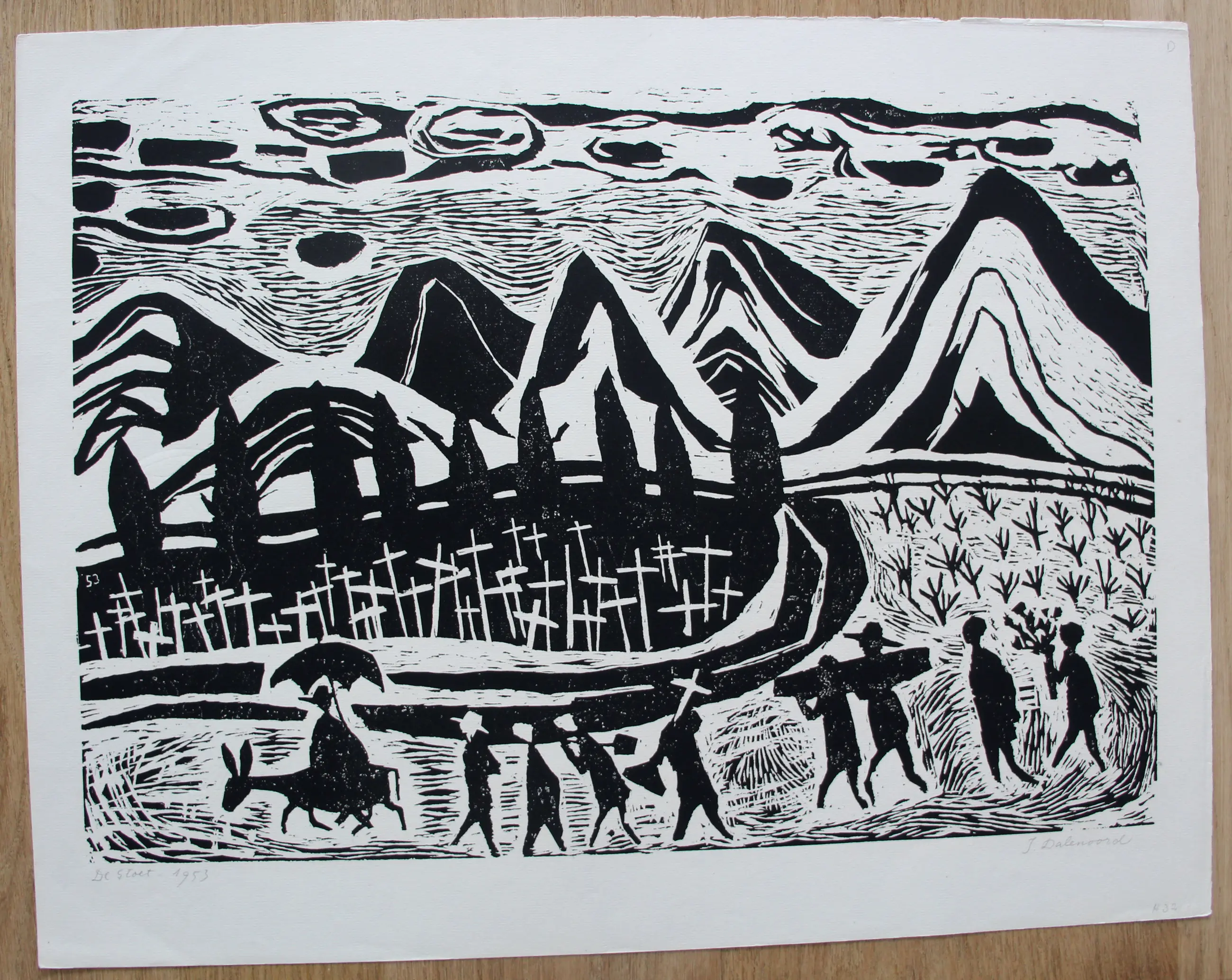 Houtsnede van Jenny Dalenoord uit 1953. Titel: De stoet. Afmetingen blad: H39 x b50.5cm. Afmetingen voorstelling: H31 x b45cm. Het werk is rechts onderaan, met potlood, gesigneerd door de kunstenares. De authenticiteit van het aangeboden werk wordt volledig gegarandeerd. Een certificaat van echtheid kan, op aanvraag, worden gegarandeerd.