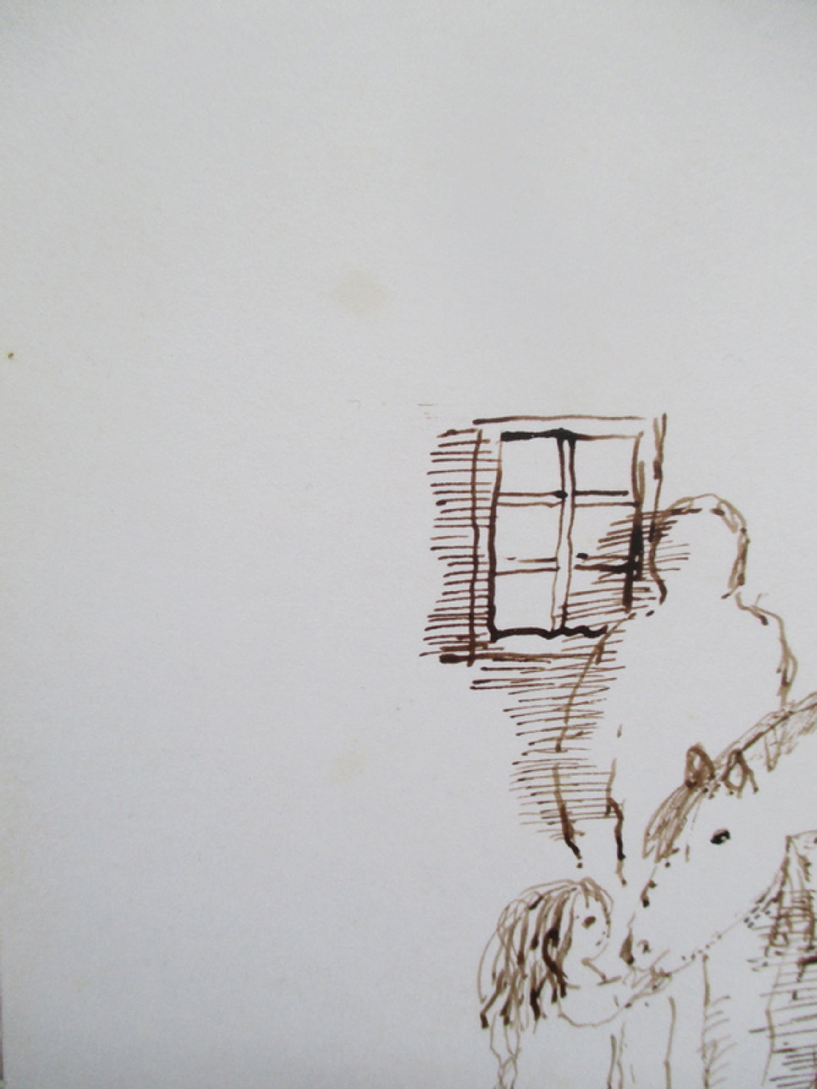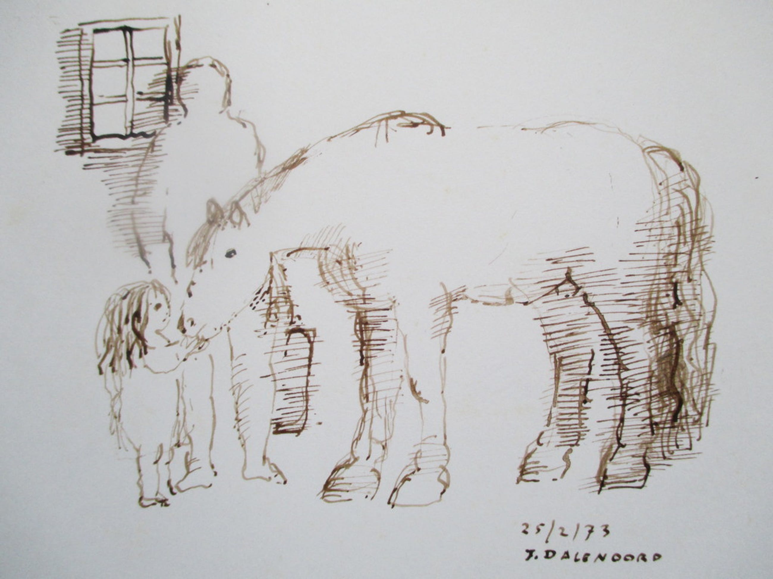 Pentekening op stevig papier van Jenny Dalenoord (1918-2013). Gesigneerd rechtsonder en gedateerd 25/2/73. Blad 20 x 25.5 cm. Afbeelding ongeveer 13.5 x 10.5. De tekening verkeert in uitstekende staat op twee lichte roestplekjes na linksonder en linksboven het raam (zie foto's). Deze vallen echter buiten de afbeelding, en zijn dus niet te zien bij plaatsing in een passepartout. Niet ingelijst.