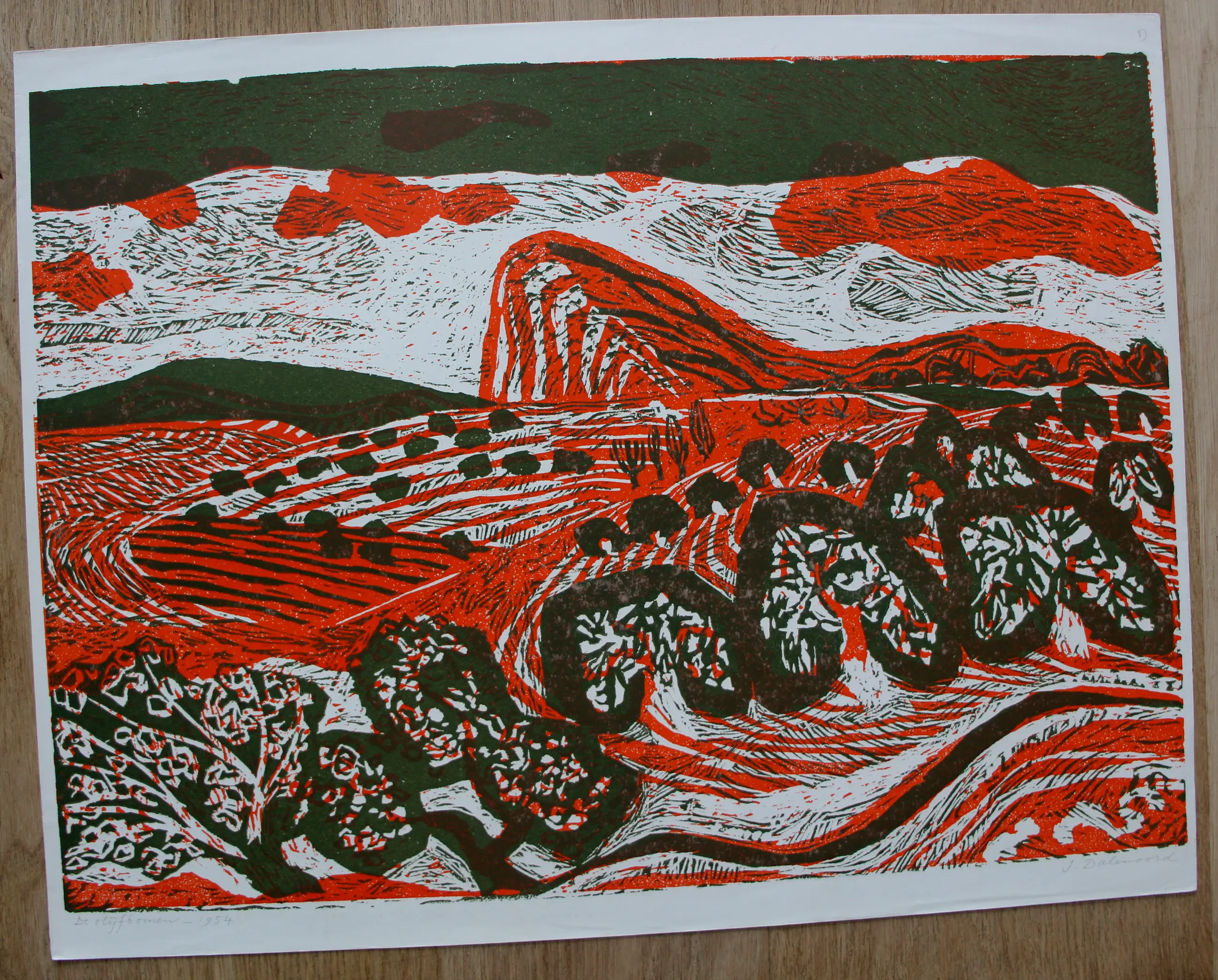 Houtsnede van Jenny Dalenoord uit 1954. Titel: De olijfbomen. Afmetingen blad: H38.5 x b50cm. Afmetingen voorstelling: H34.5 x b48.5cm. Het werk is rechts onderaan, met potlood, gesigneerd door de kunstenares. De authenticiteit van het aangeboden werk wordt volledig gegarandeerd. Een certificaat van echtheid kan, op aanvraag, worden gegarandeerd.