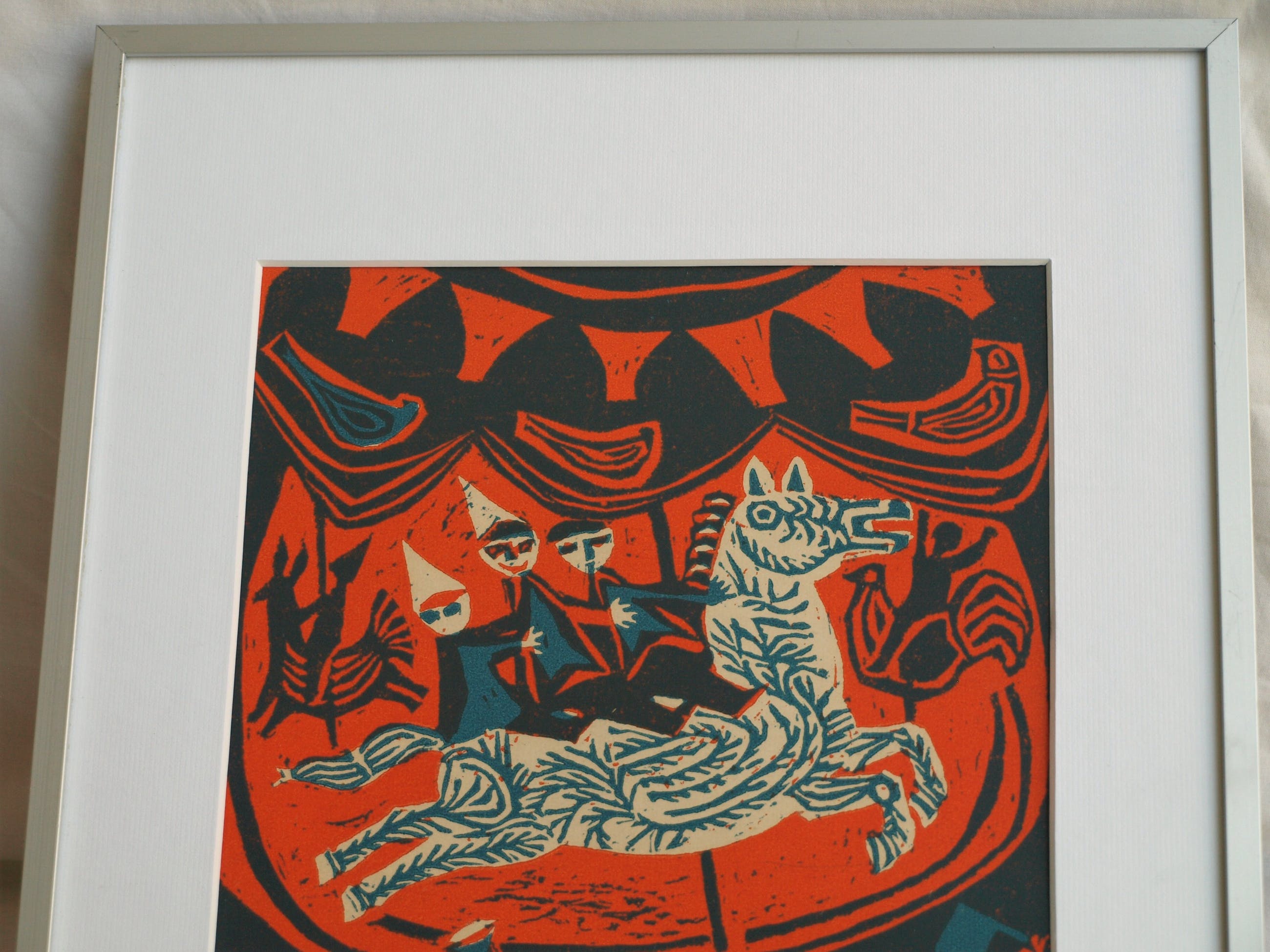 -De ingelijste linosnede kan afgehaald worden in Amsterdam.
