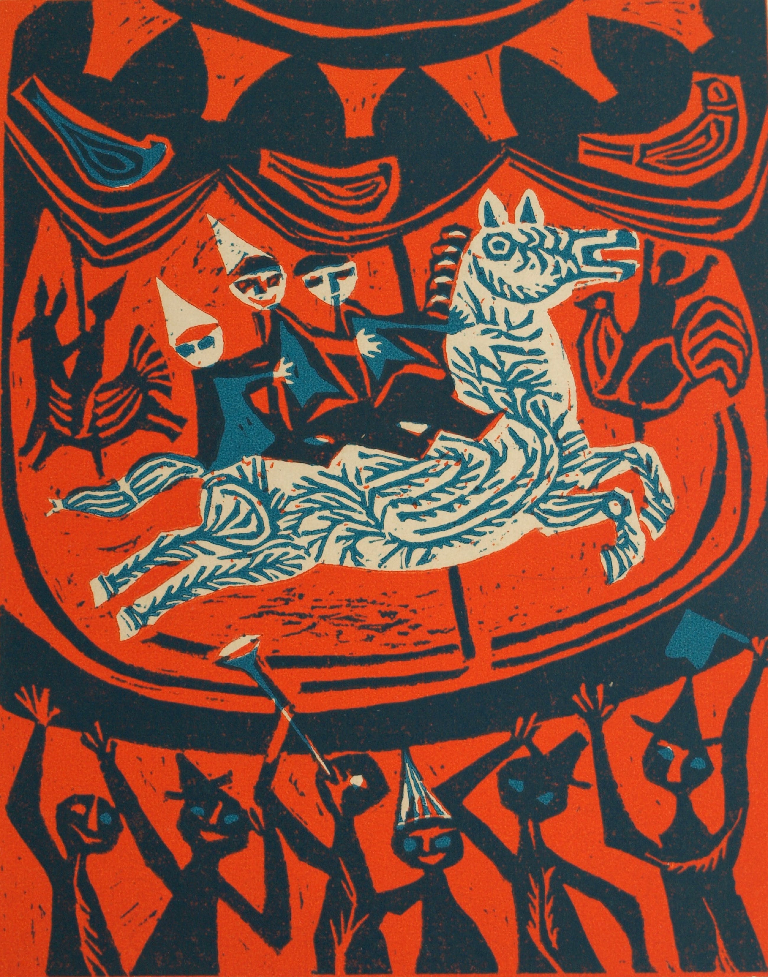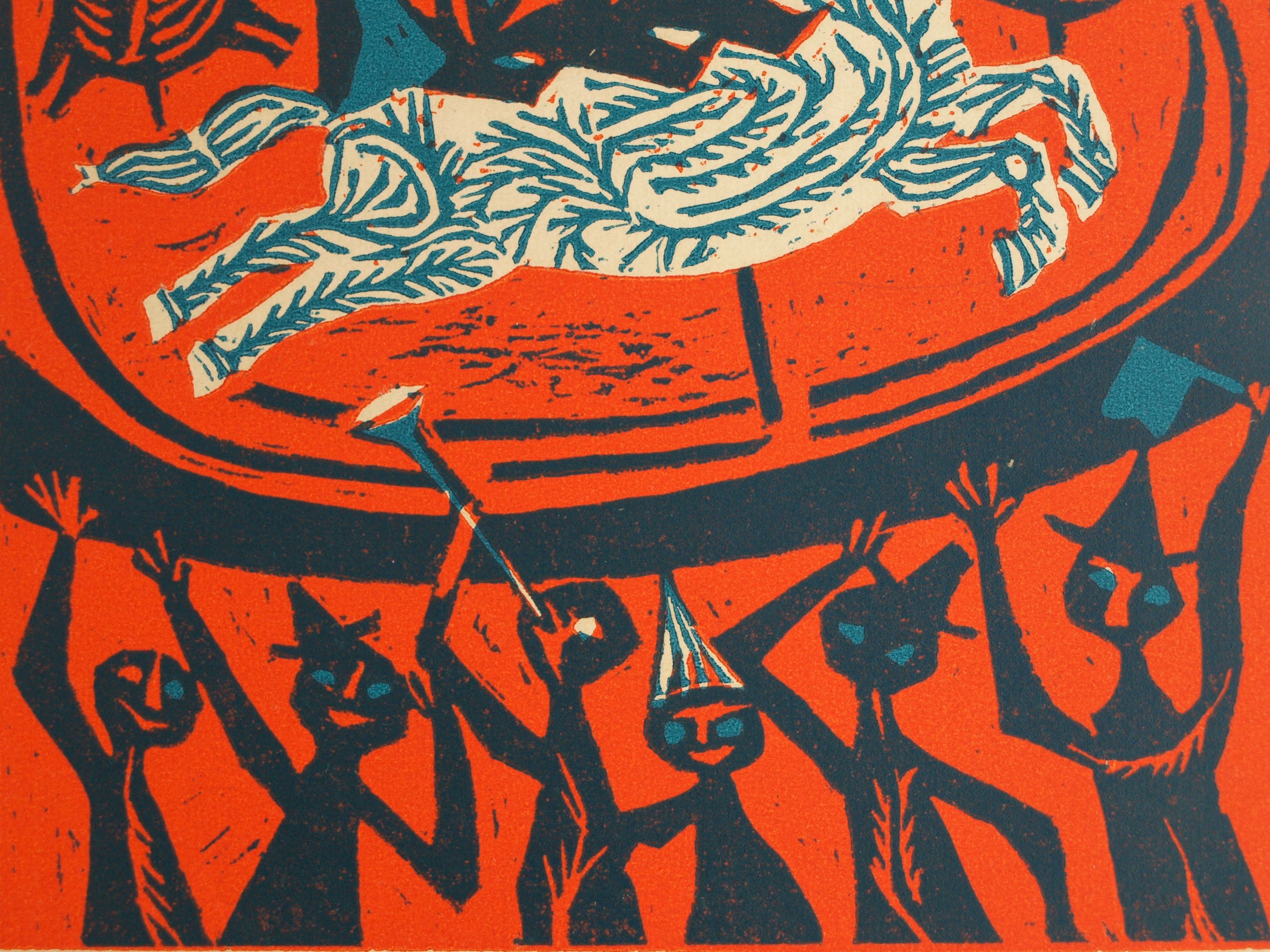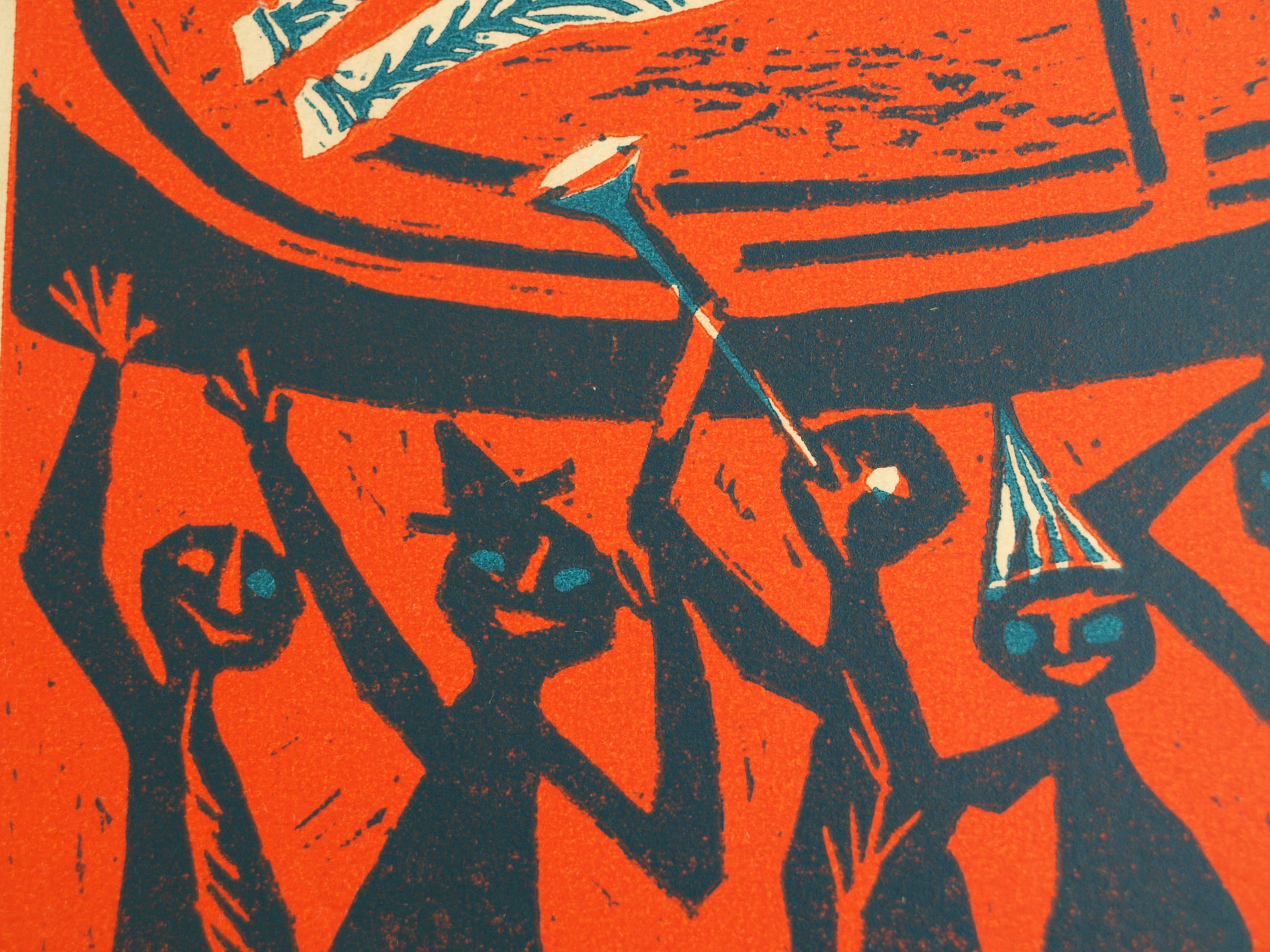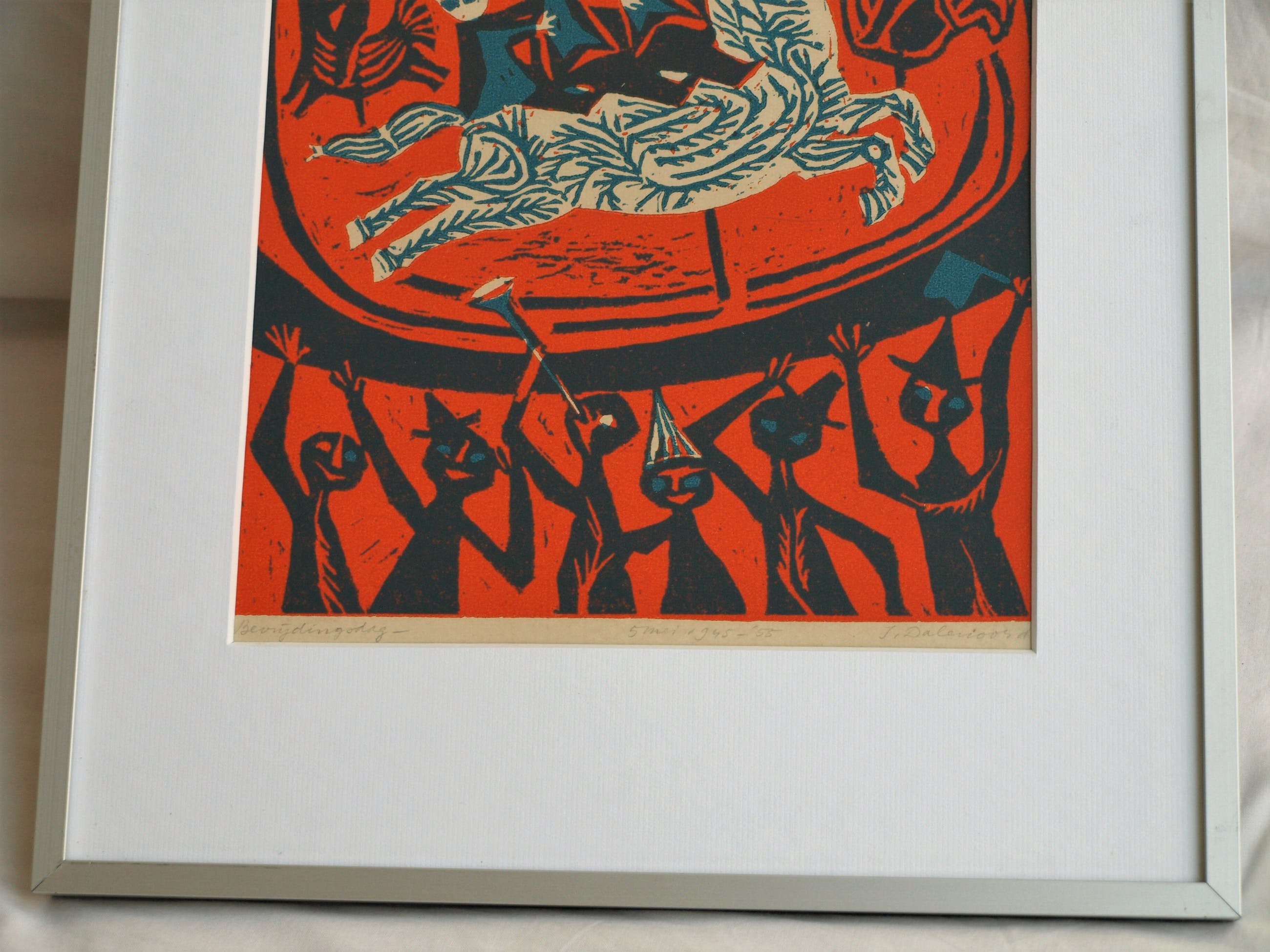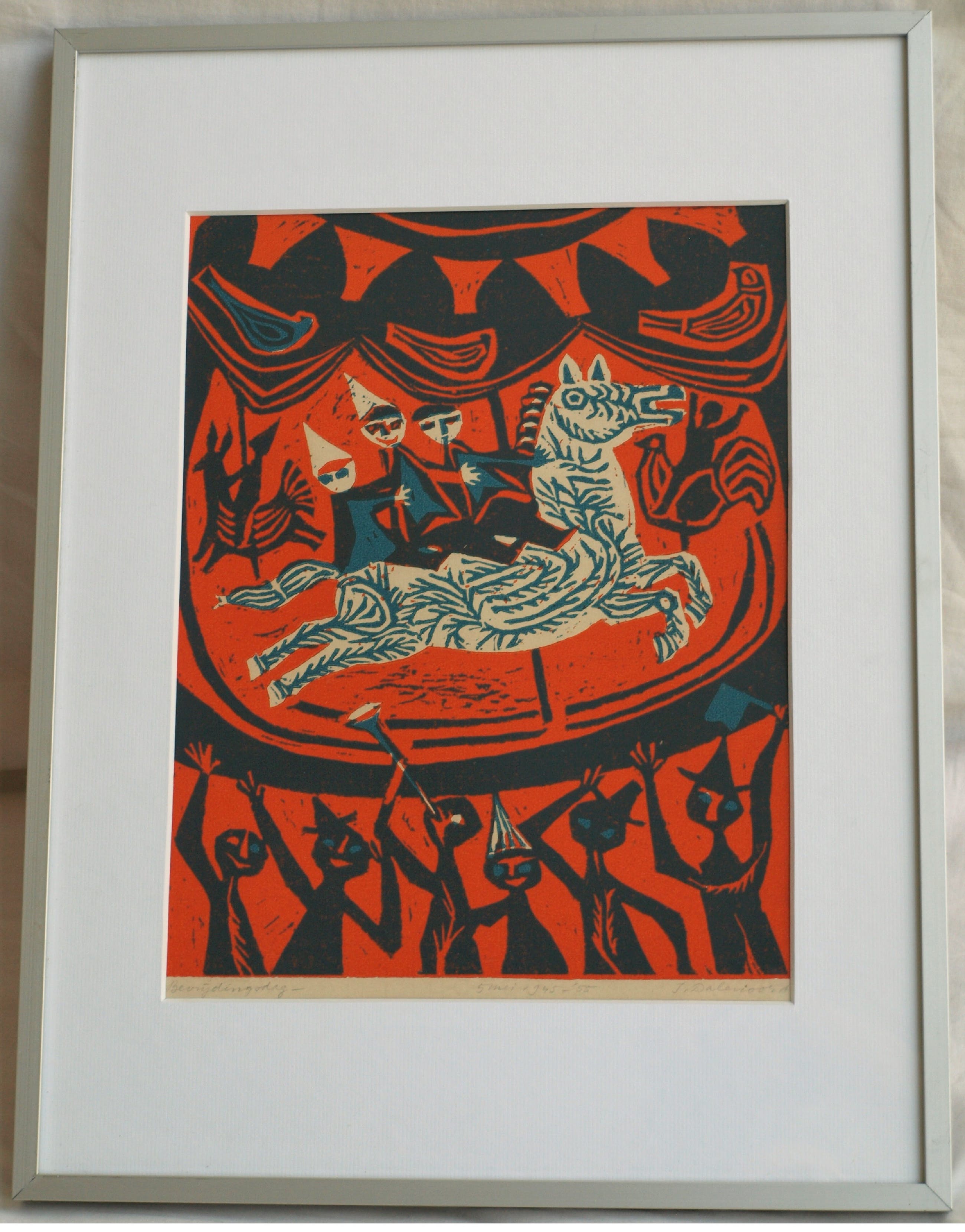 Een linosnede uit 1955 van de Nederlandse kunstenares Jenny Dalenoord (1918-2013), gemaakt ter gelegenheid van de 10-jarige viering van Bevrijdingsdag.