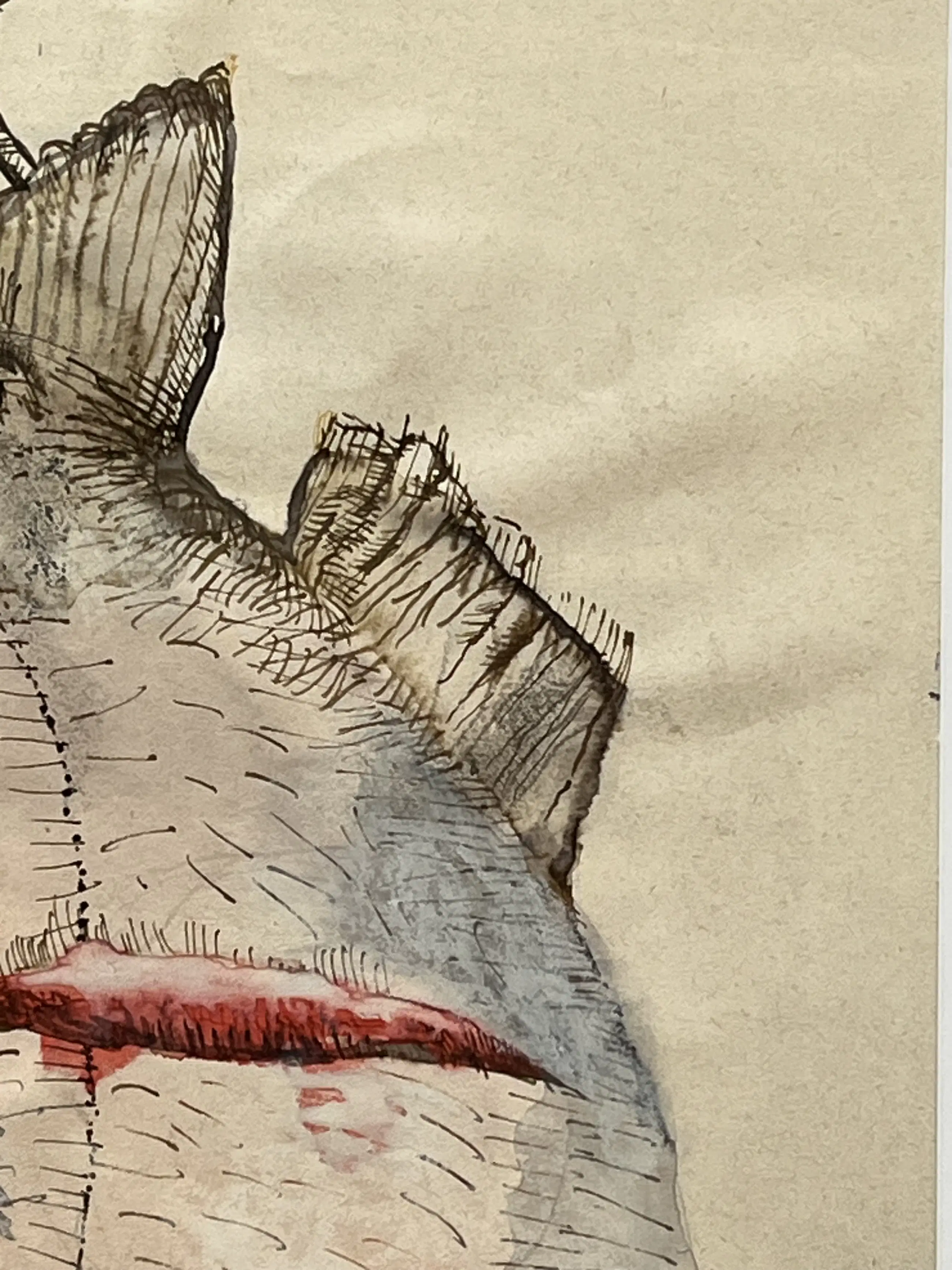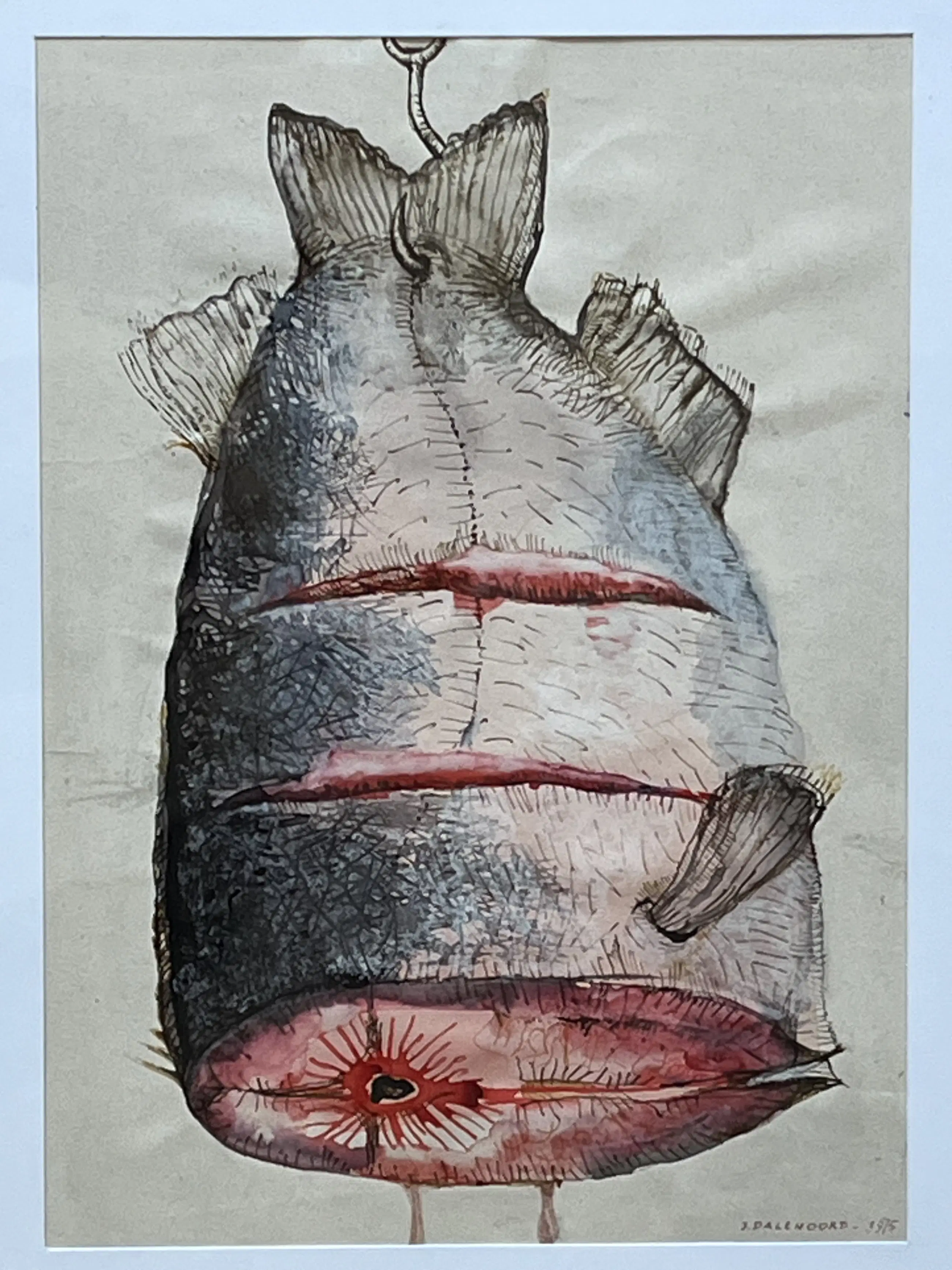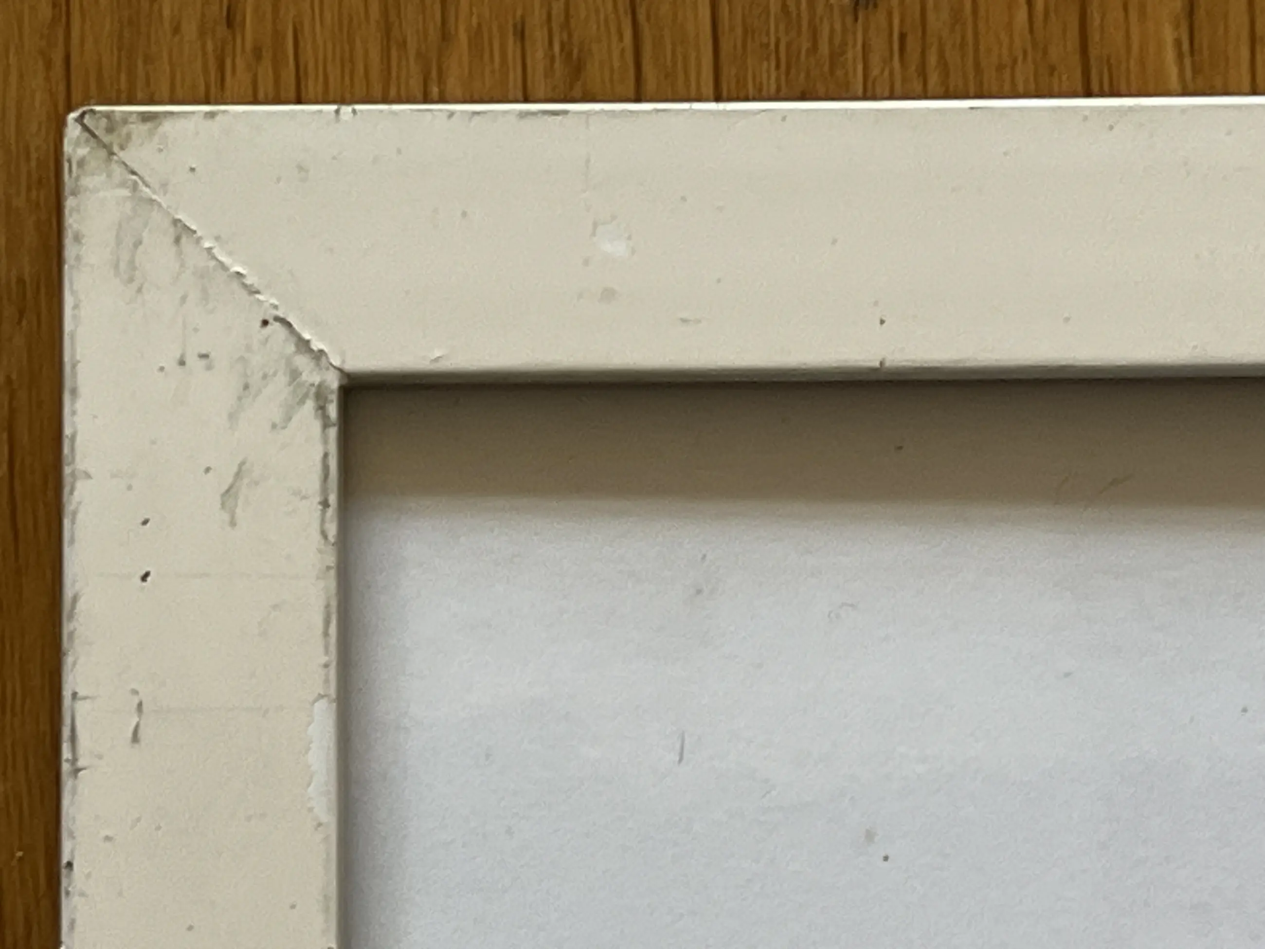 Gemengde techniek uit 1975. Blad is wat gebobbeld (detailfoto). Gelijst in witte kunststoffen lijst met zichtbare gebruikssporen. Afmeting afbeelding 30 x 21 cm. Inclusief lijst 54 x 41,5 cm.