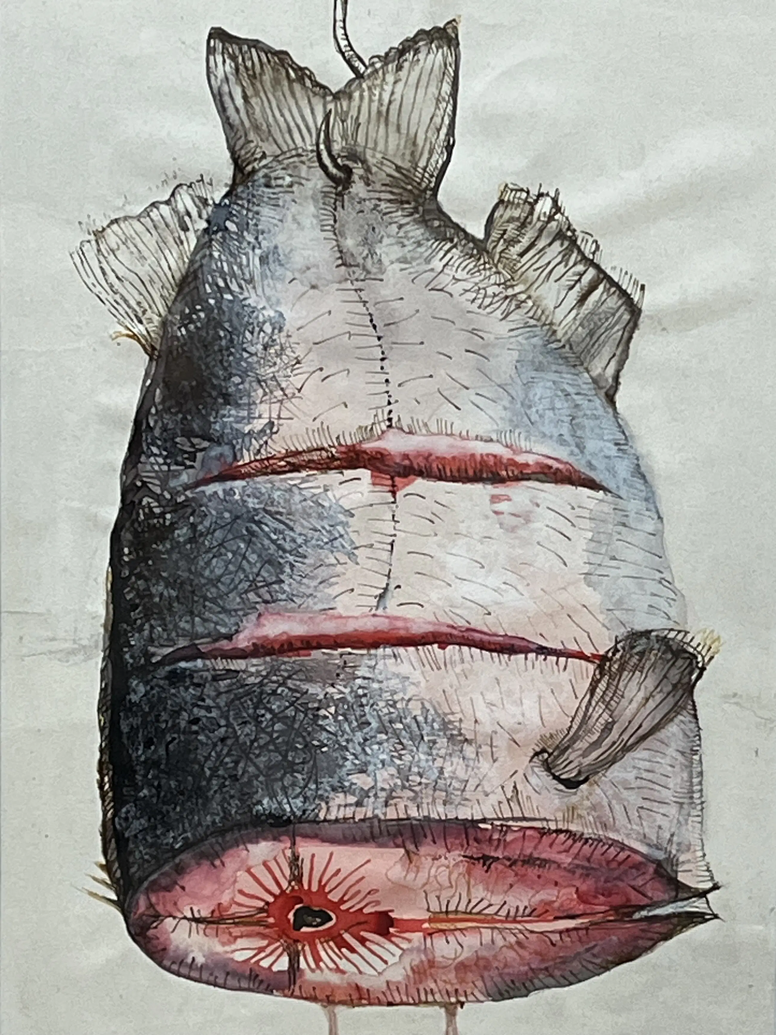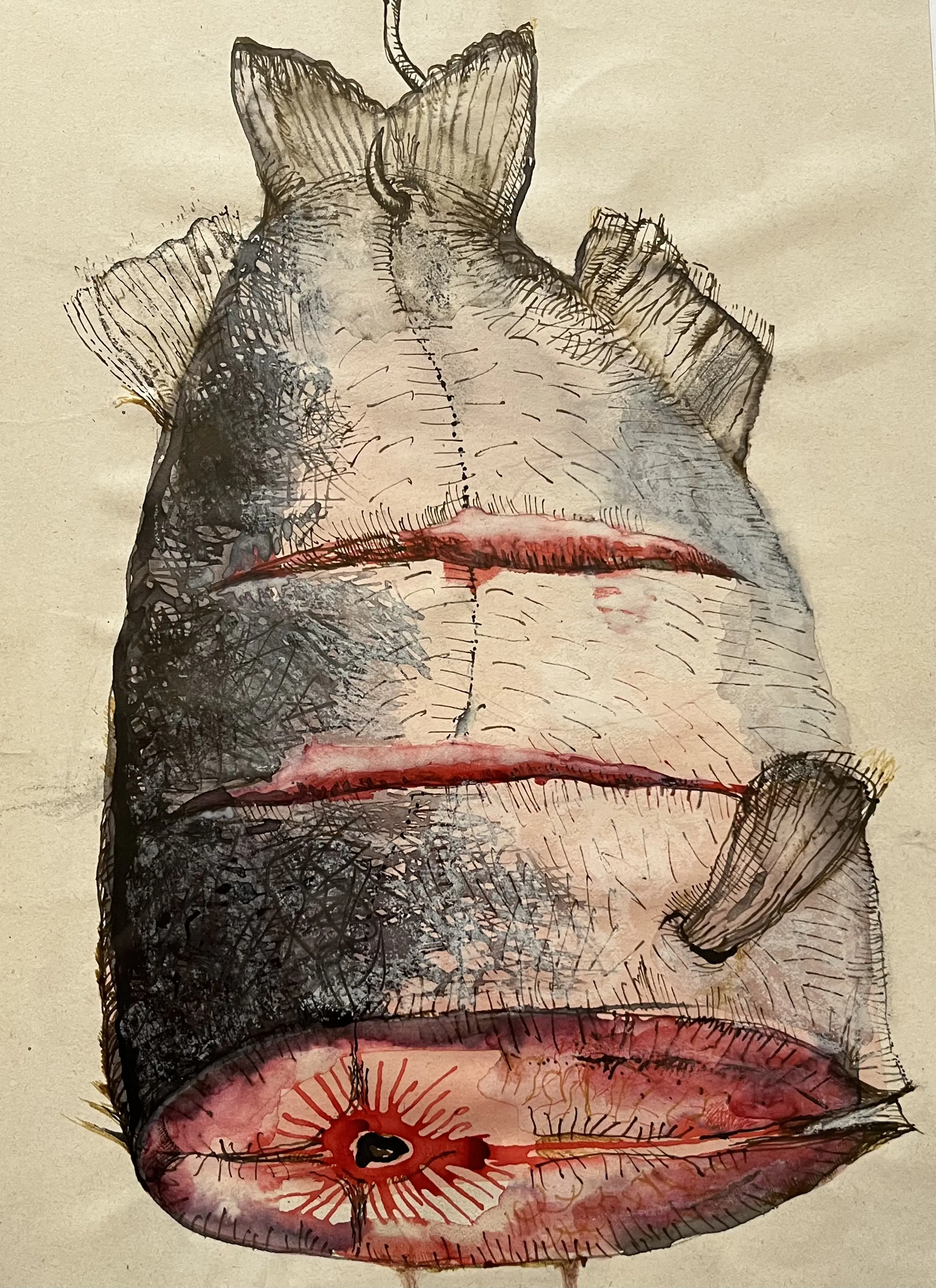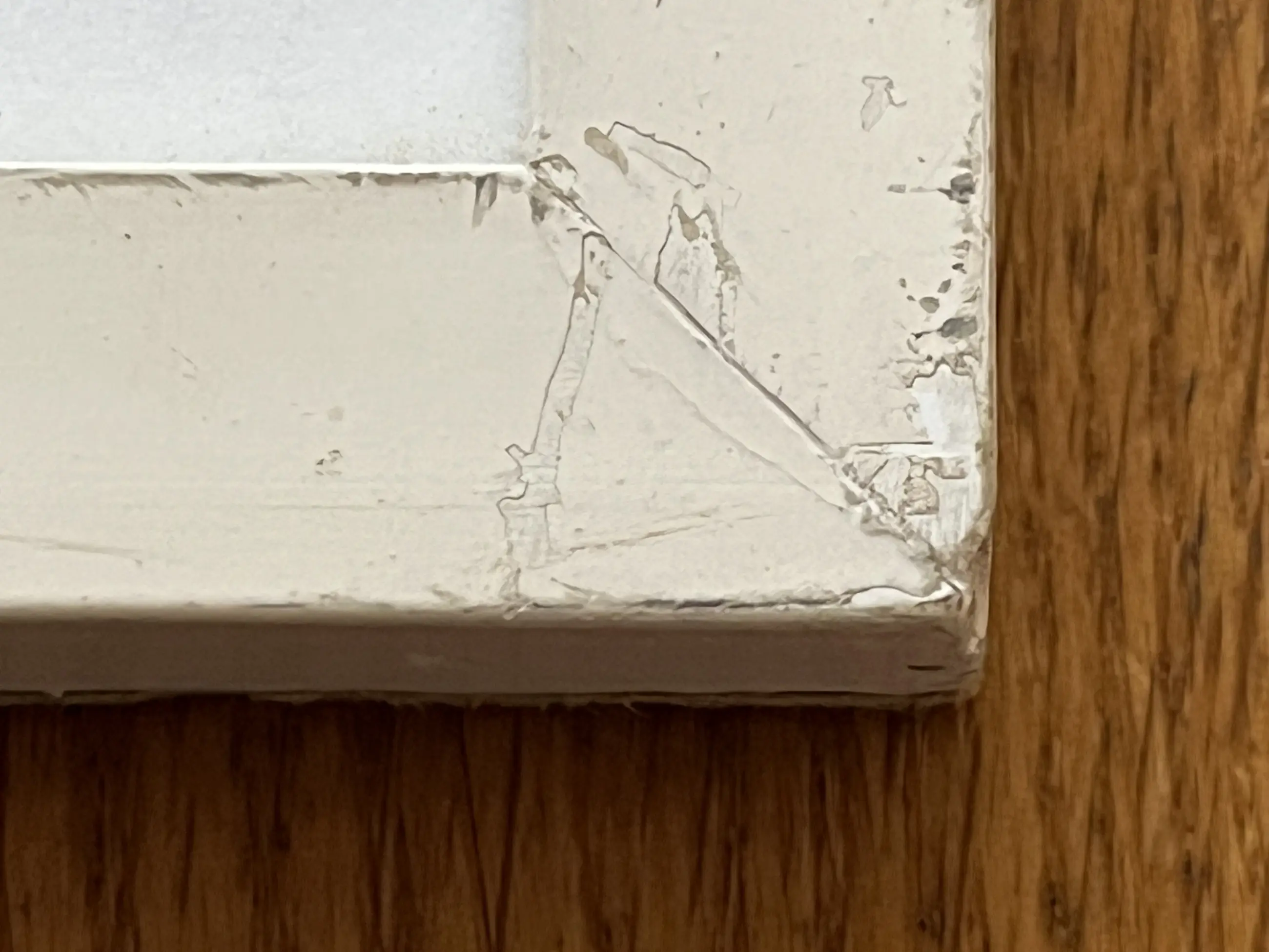 Gemengde techniek uit 1975. Blad is wat gebobbeld (detailfoto). Gelijst in witte kunststoffen lijst met zichtbare gebruikssporen. Afmeting afbeelding 30 x 21 cm. Inclusief lijst 54 x 41,5 cm.