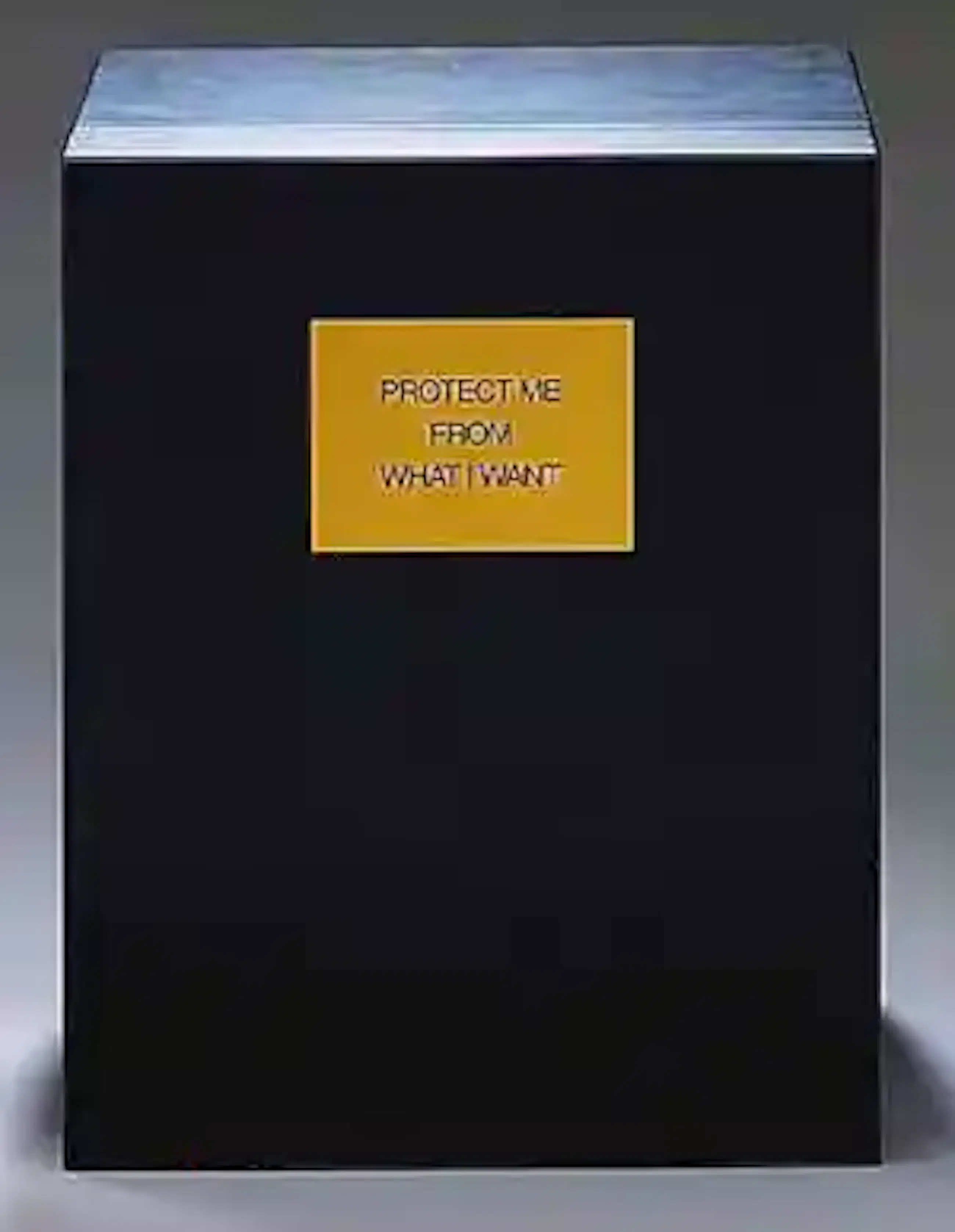 Zwart houten doos van de editie Protect me from what I want. Speciaal als object ontworpen door Jenny Holzer Let op; DE DOOS IS LEEG. Het betreft hier alleen de doos. Wel bedoeld als zelfstandig item met geel emaille plaatje op de deksel