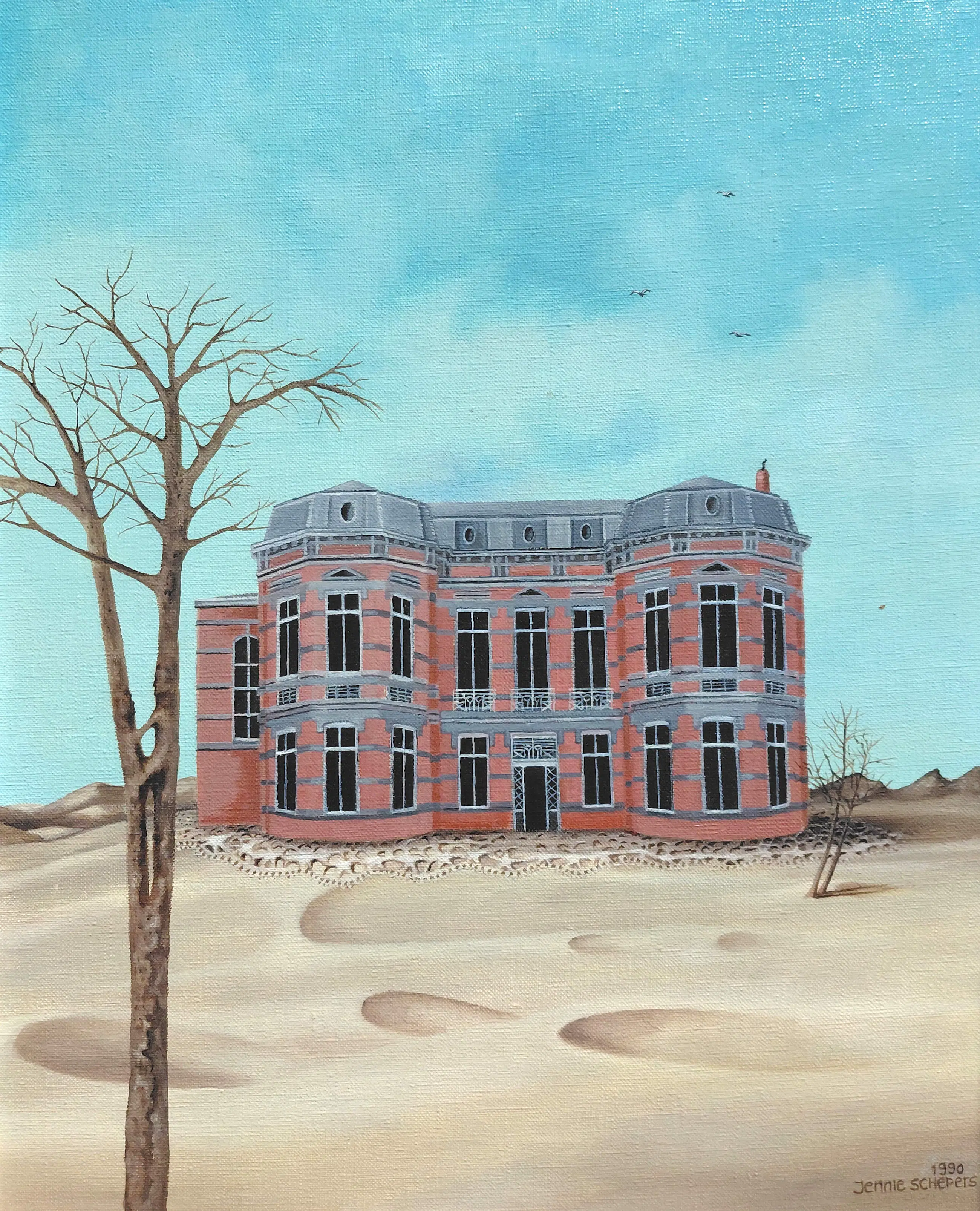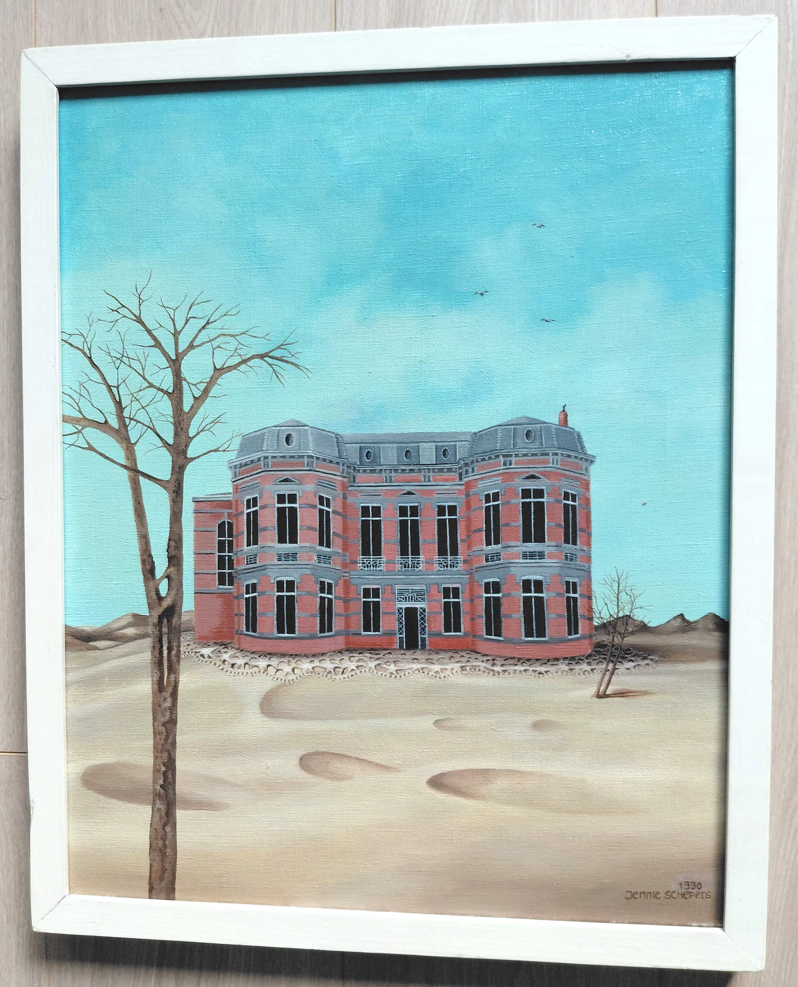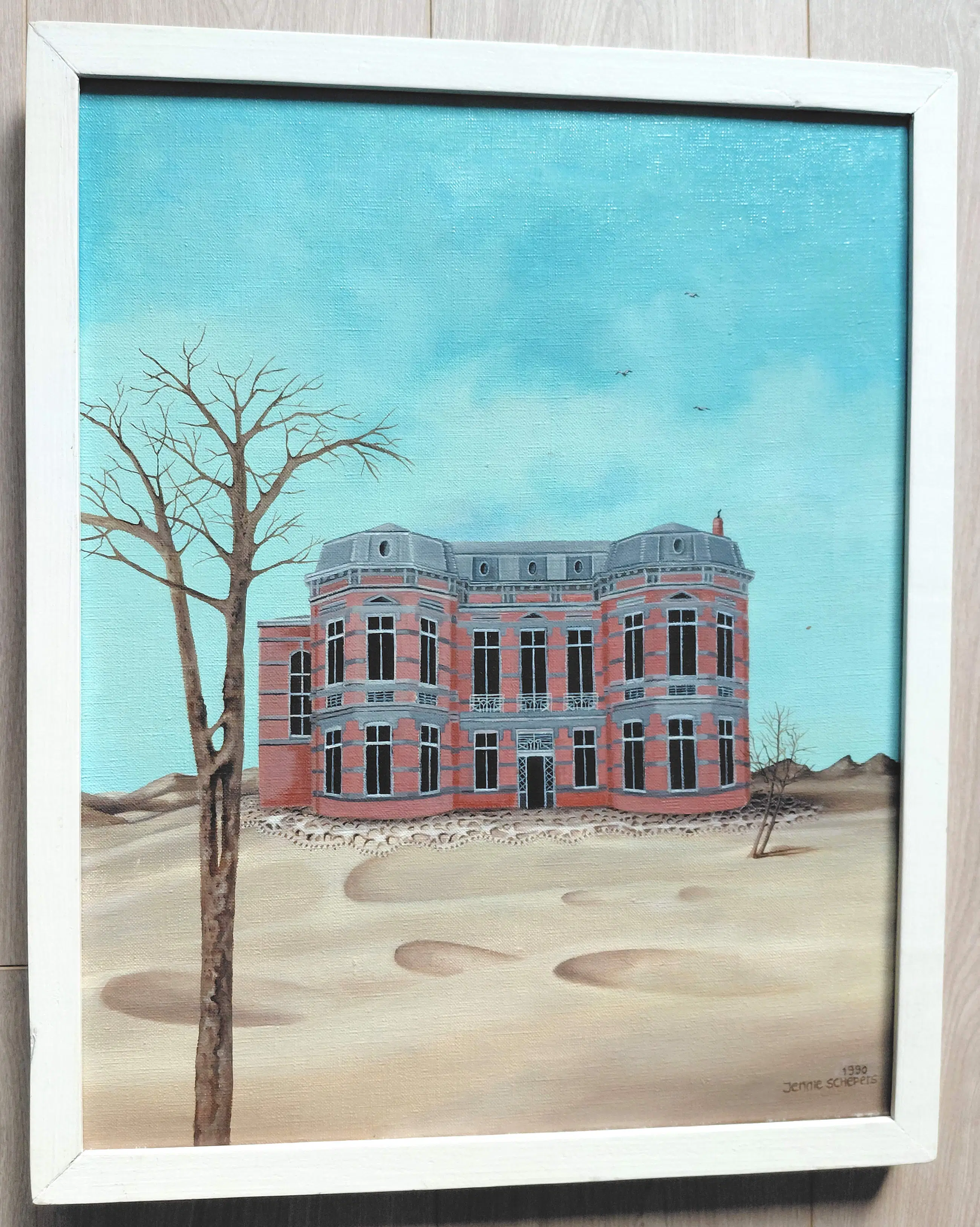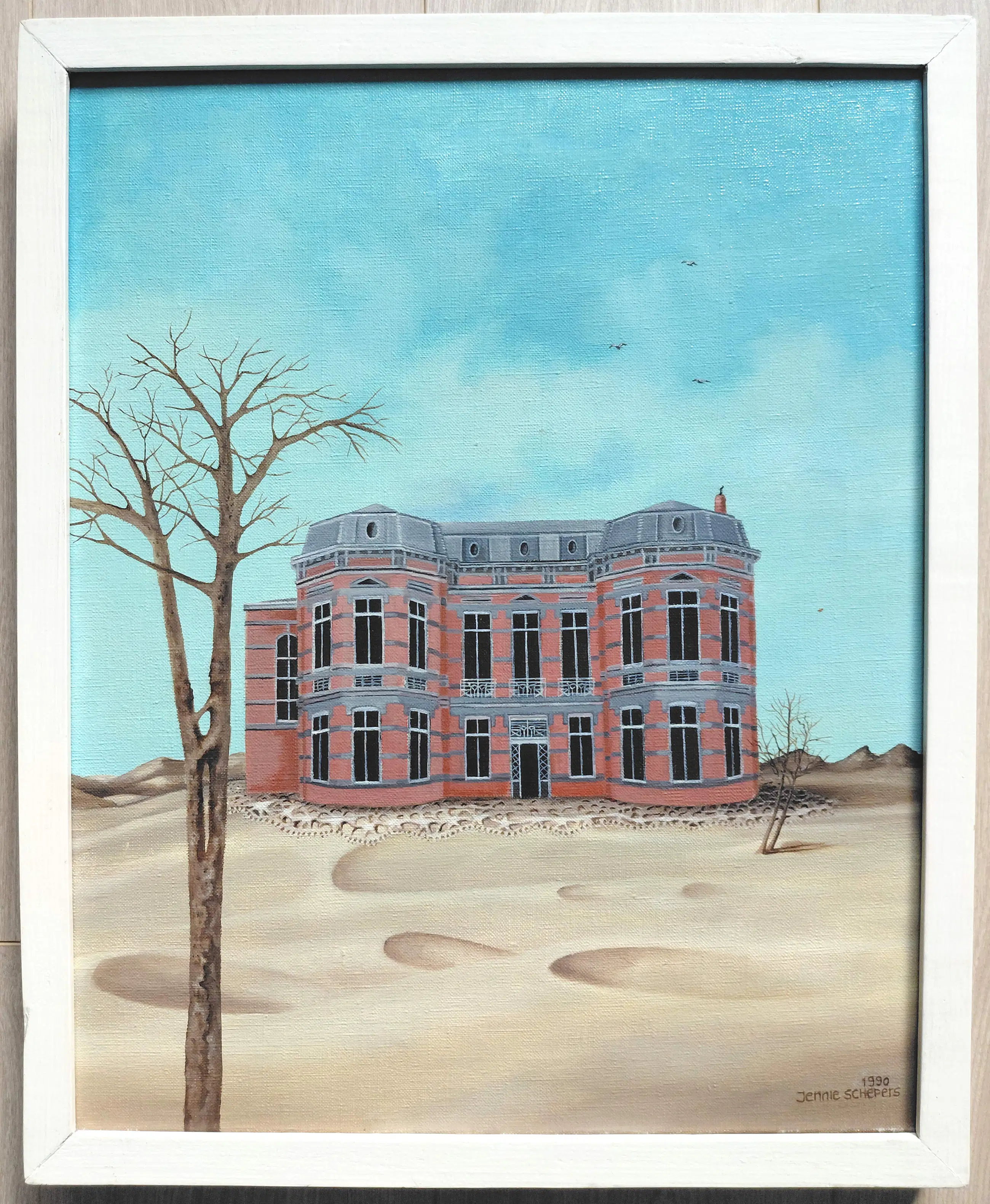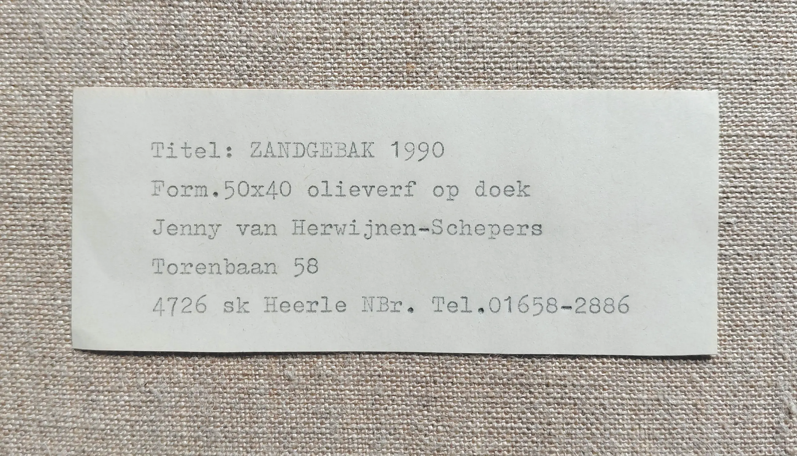 Leuk werk van Jenny van Herwijnen (née Schepers) getiteld Zandgebak. Olieverf op doek, gesigneerd en gedateerd (’90) rechtsonder, in nette houten lijst. In zeer goede conditie.