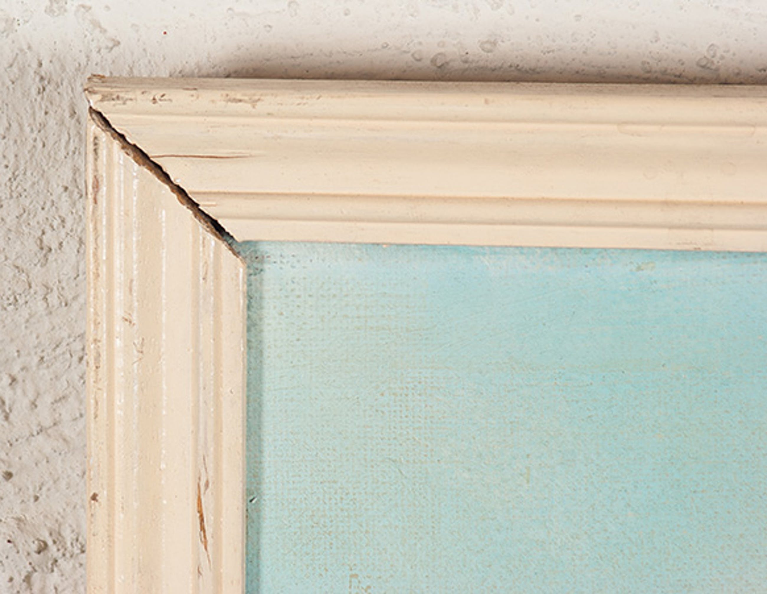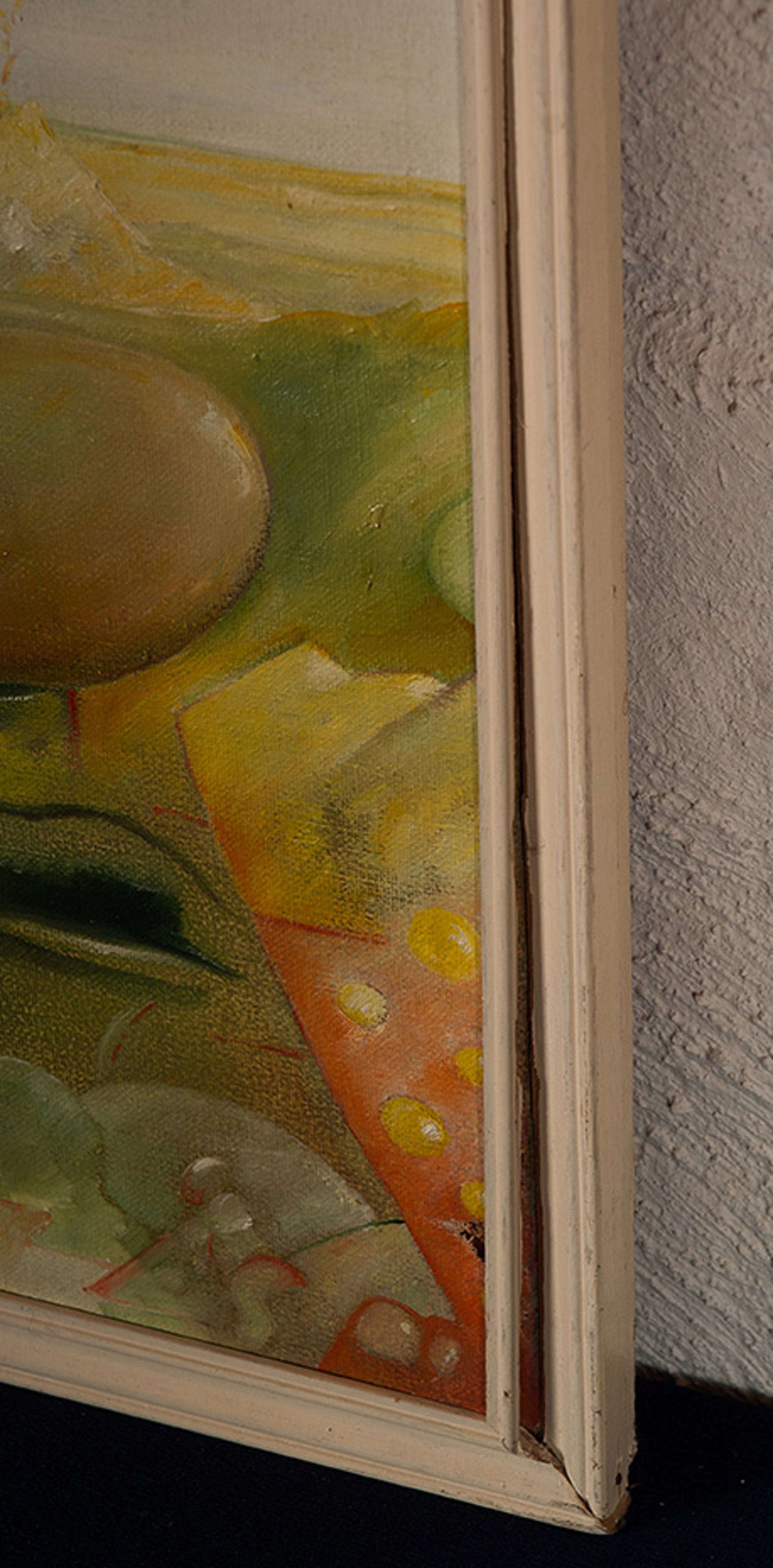 | Er is een L-vormige bruine afdruk linksboven. Verder zijn er verschillende beschadigingen aan de lijst en een scheur in het doek in de rechter onderhoek. | |