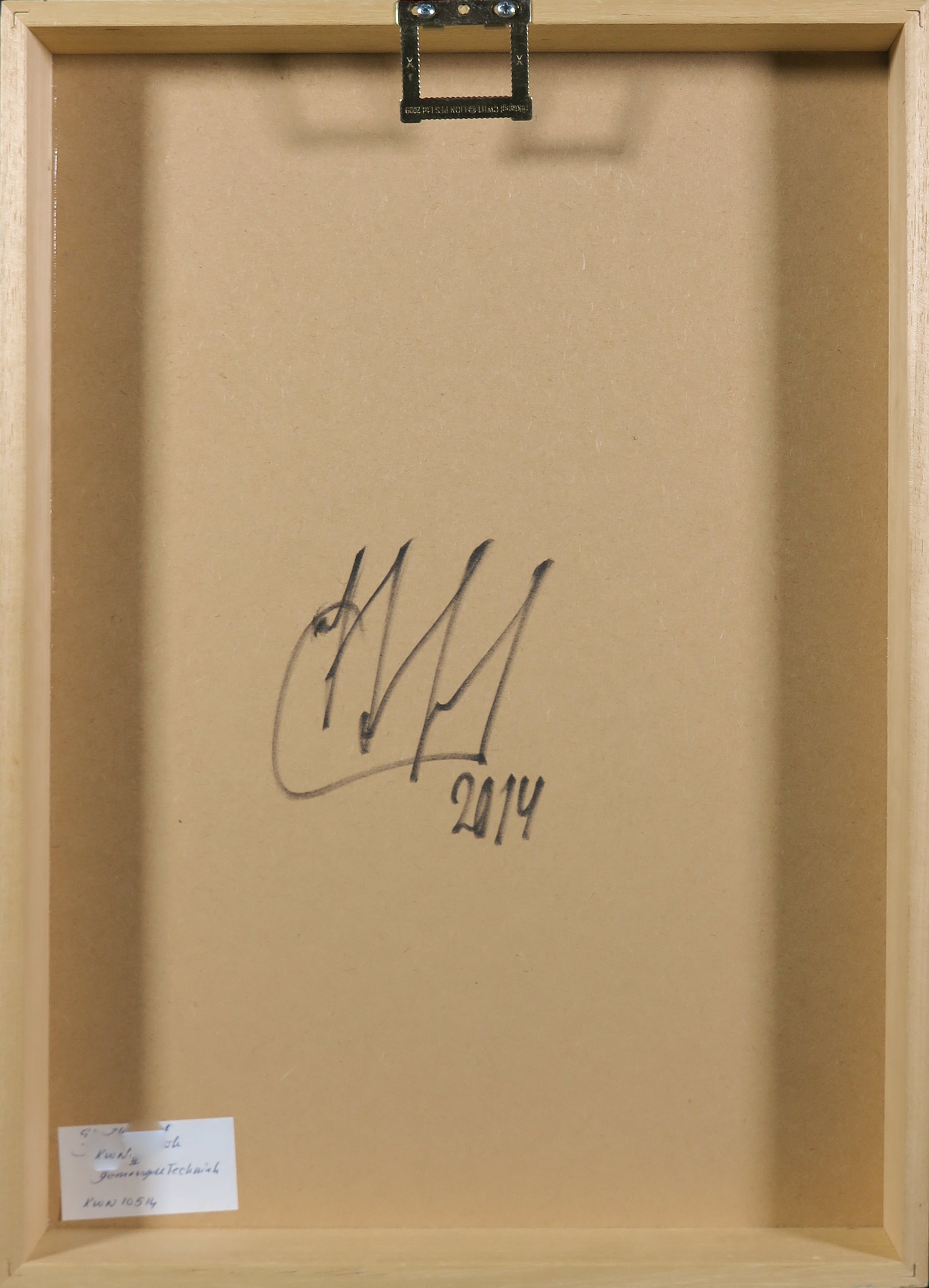 Gemengde techniek op karton, bevestigd op MDF. Met ophangsysteem.
