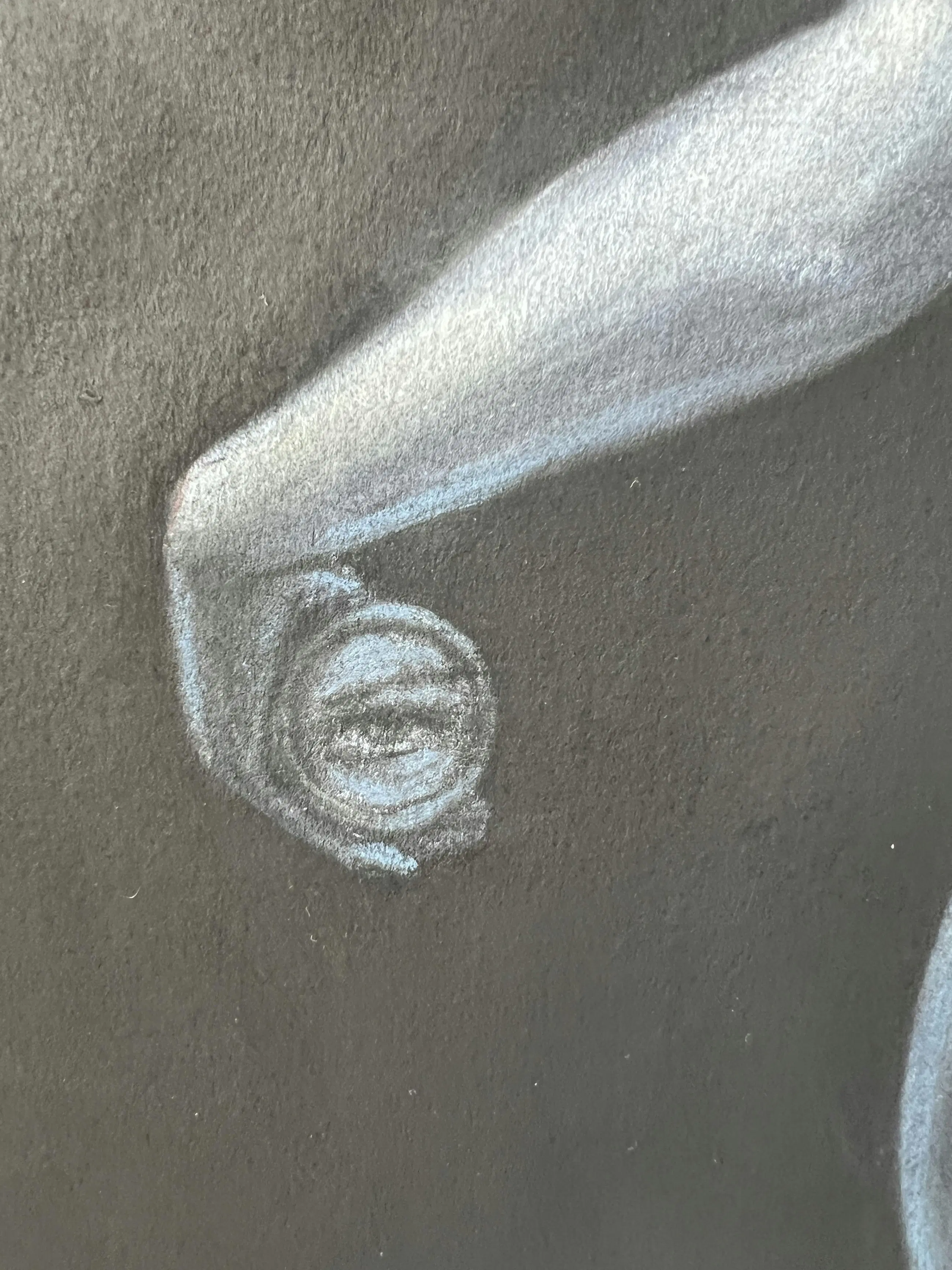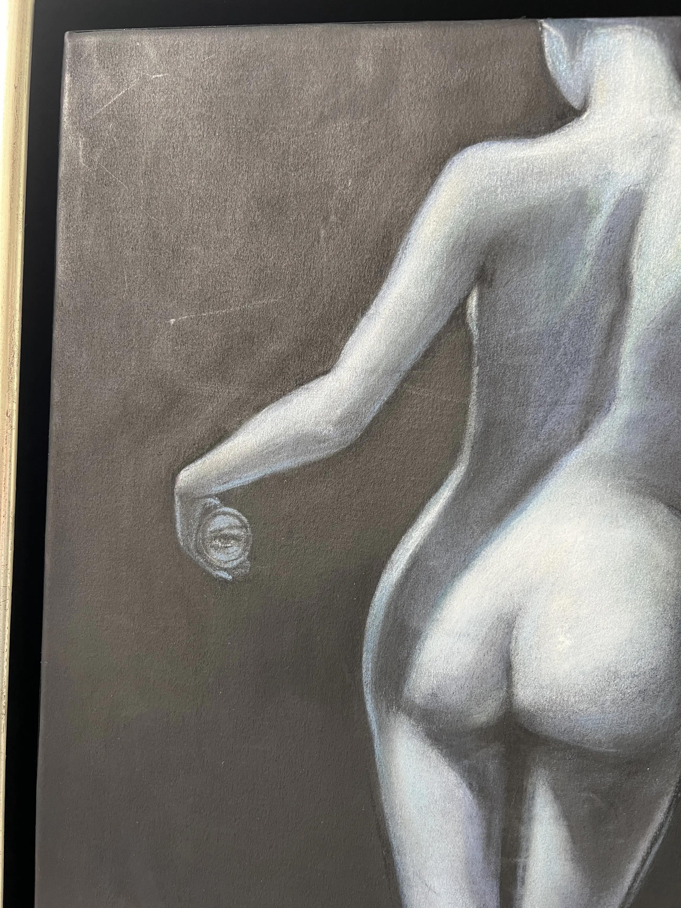 Olie pastel op papier gemonteerd op canvas. Baklijst heeft een kleine beschadiging aan de rechterkant (zie foto).