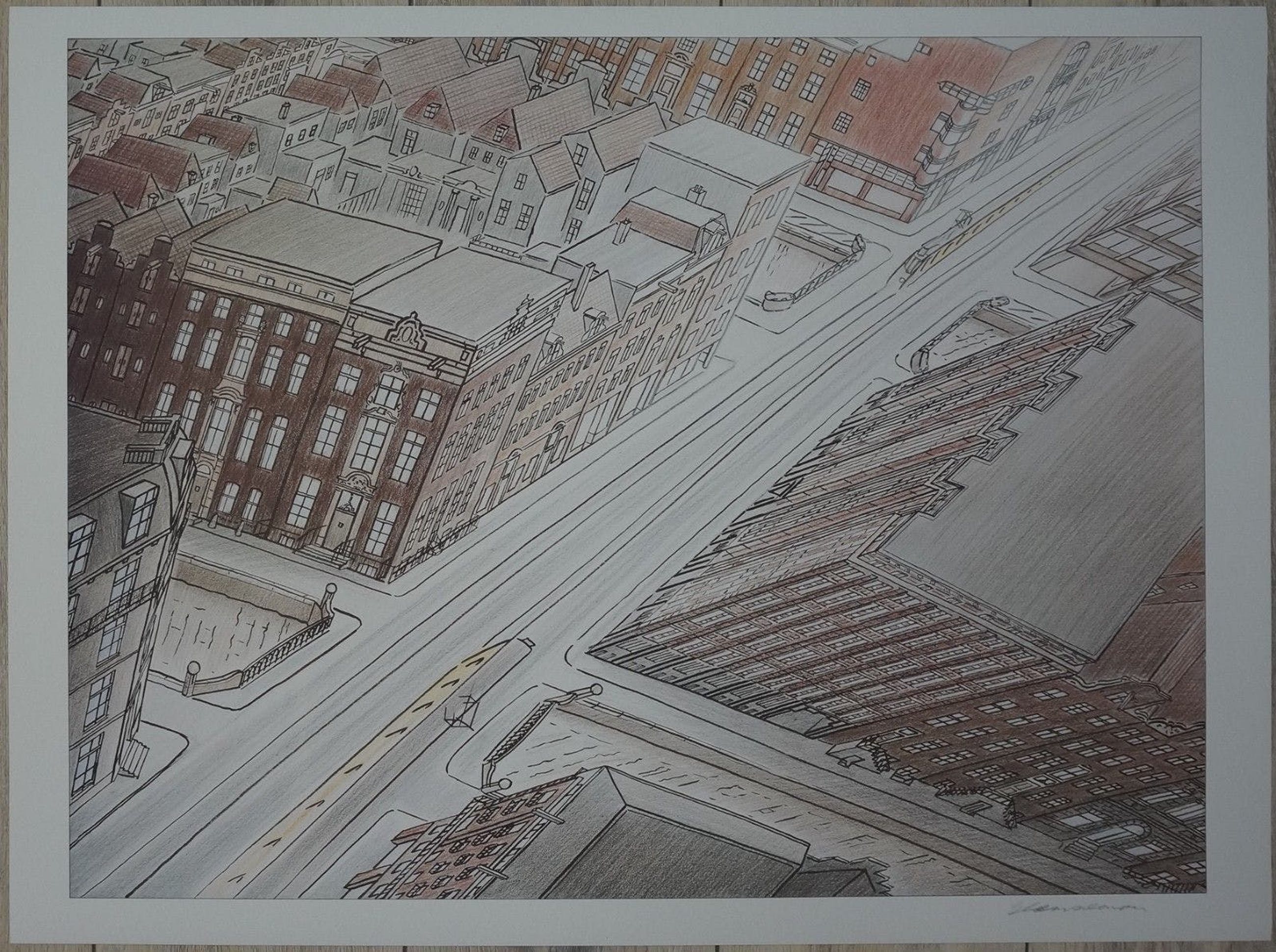 Jeroen Henneman - "Amsterdam" Grote met potlood gesigneerde lithografie uit 1989. Maten: 59 x 79 cm. In 1989 in beperkte en ongenummerde oplage van 200 exemplaren uitgegeven als onderdeel van de series "12 European Cities".