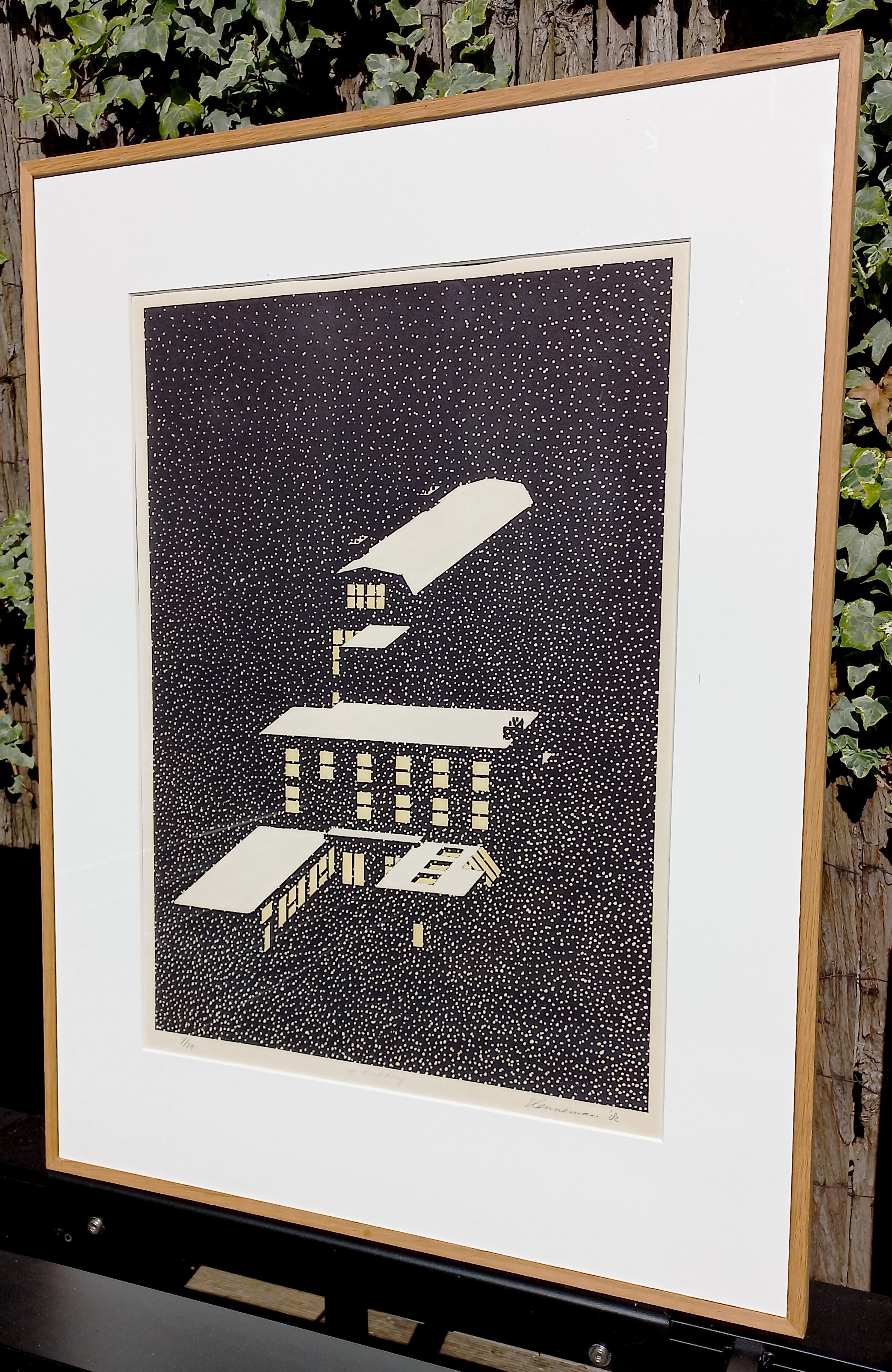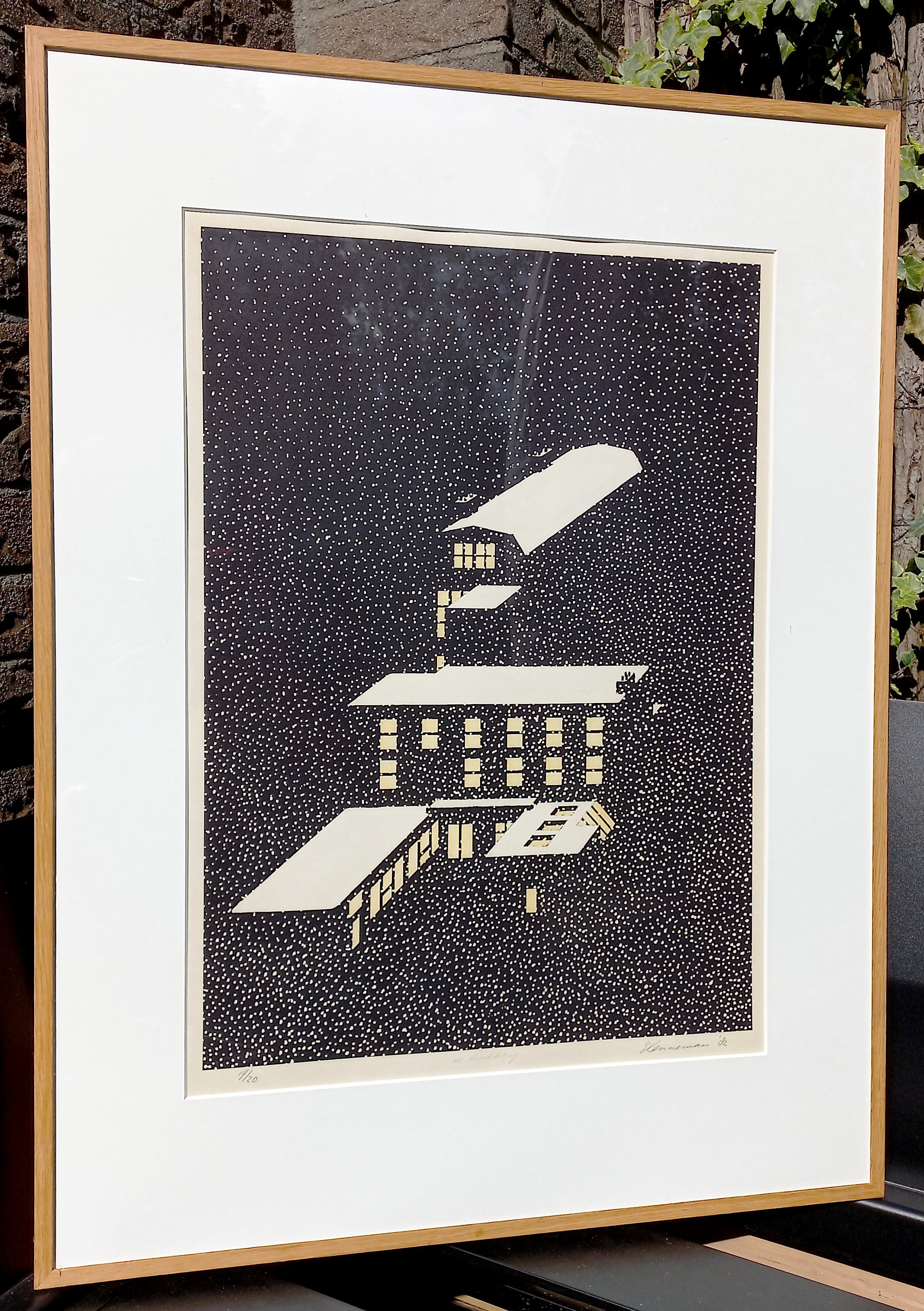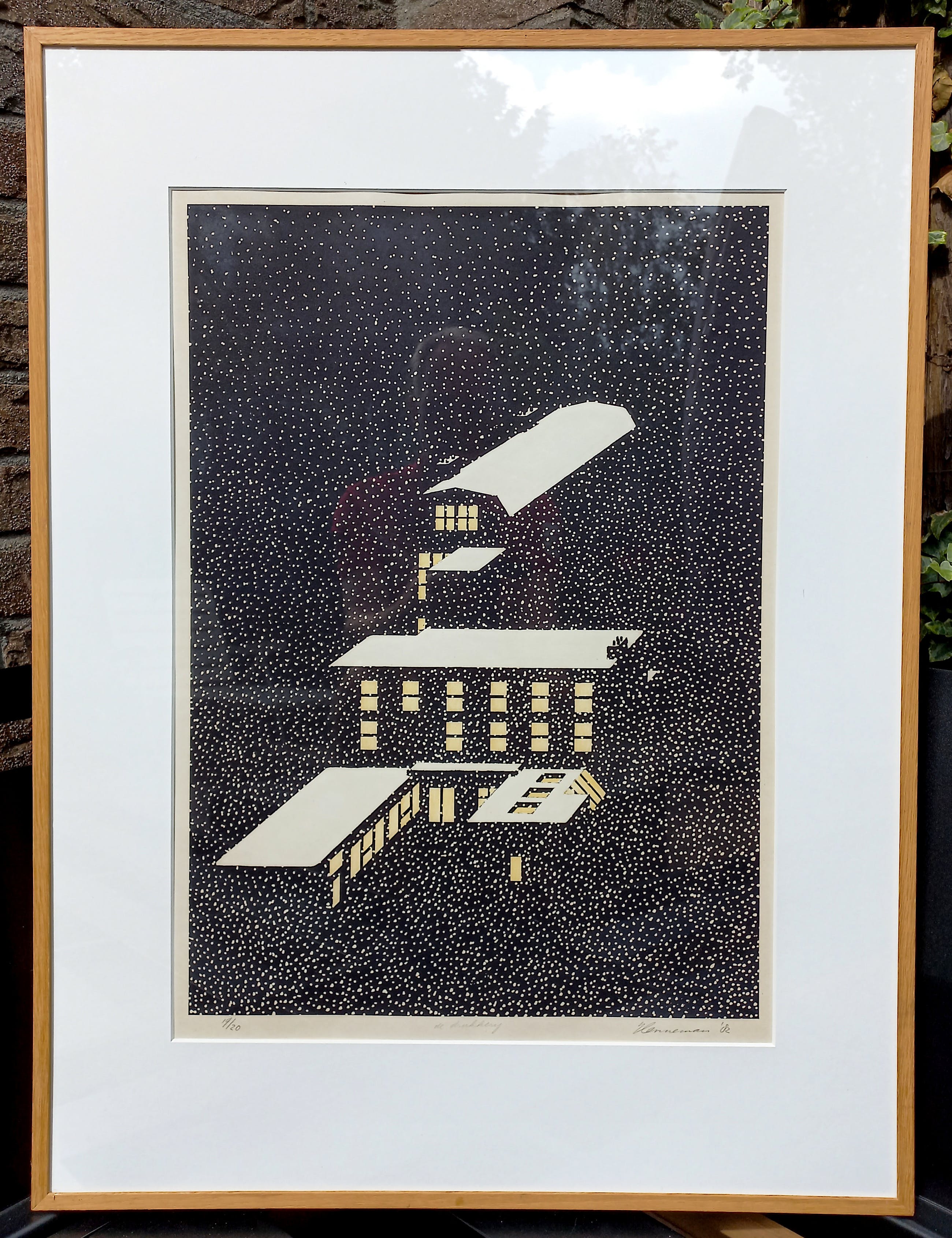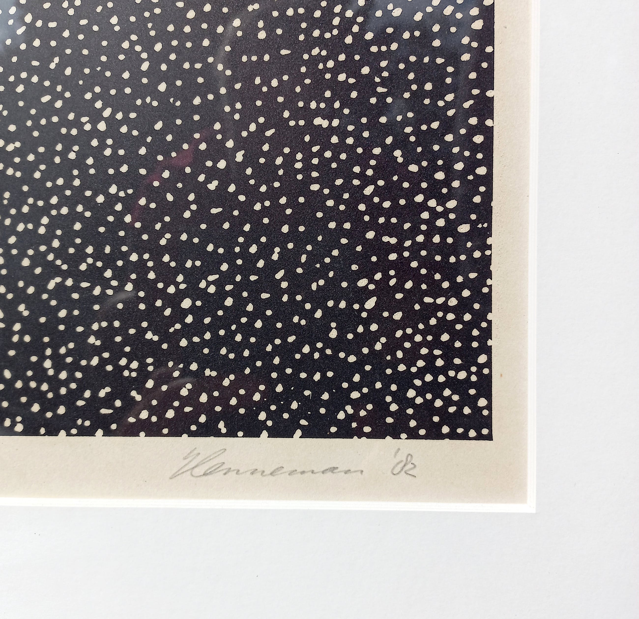 Litho op papier, met potlood gesigneerd, gedateerd (’82) en genummerd (19/20). In nette Barth lijst, achter glas en met smetteloos, zuurvrij passe-partout. Alles in uitstekende conditie. Deze litho is ook te vinden op Henneman’s website.
