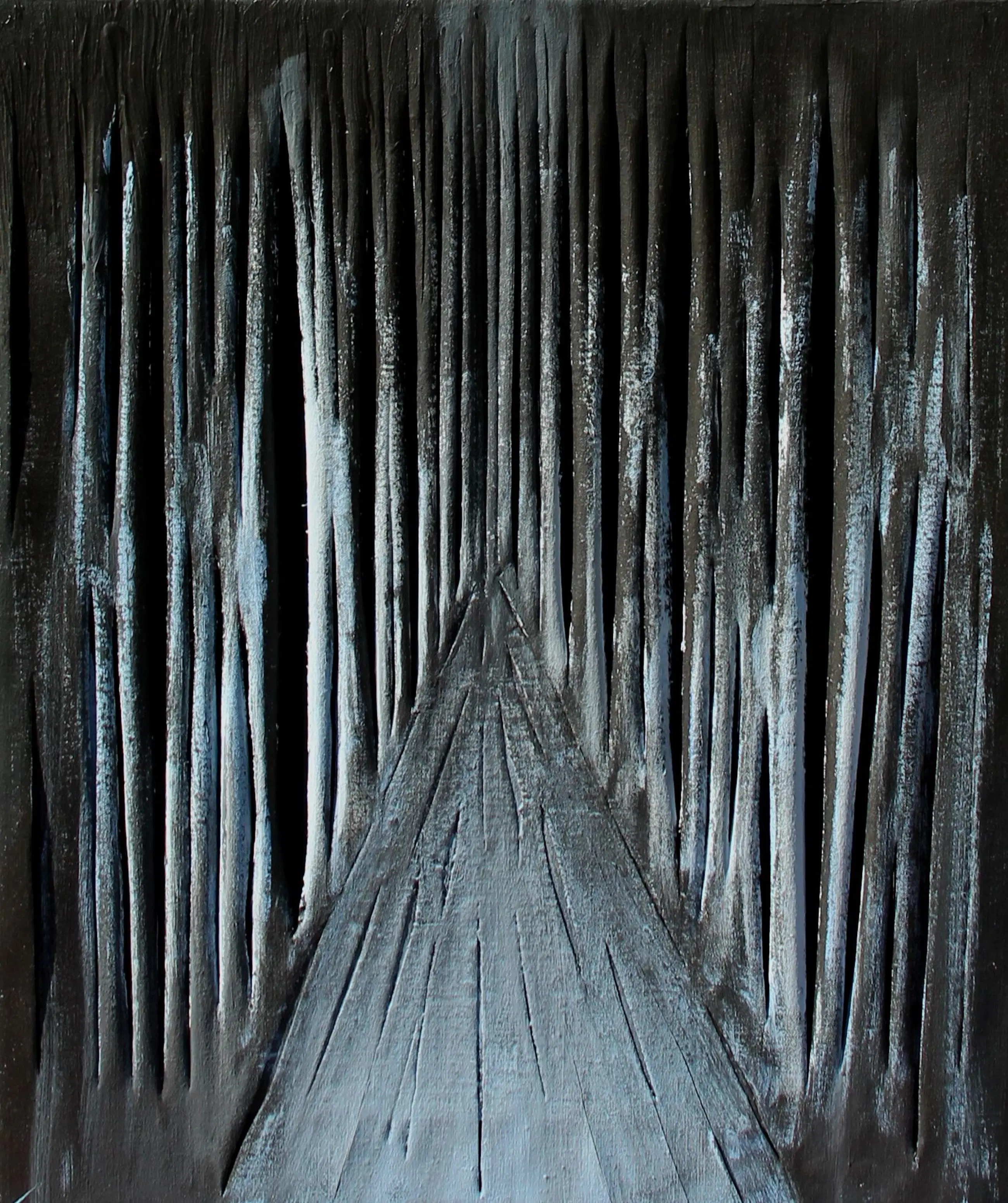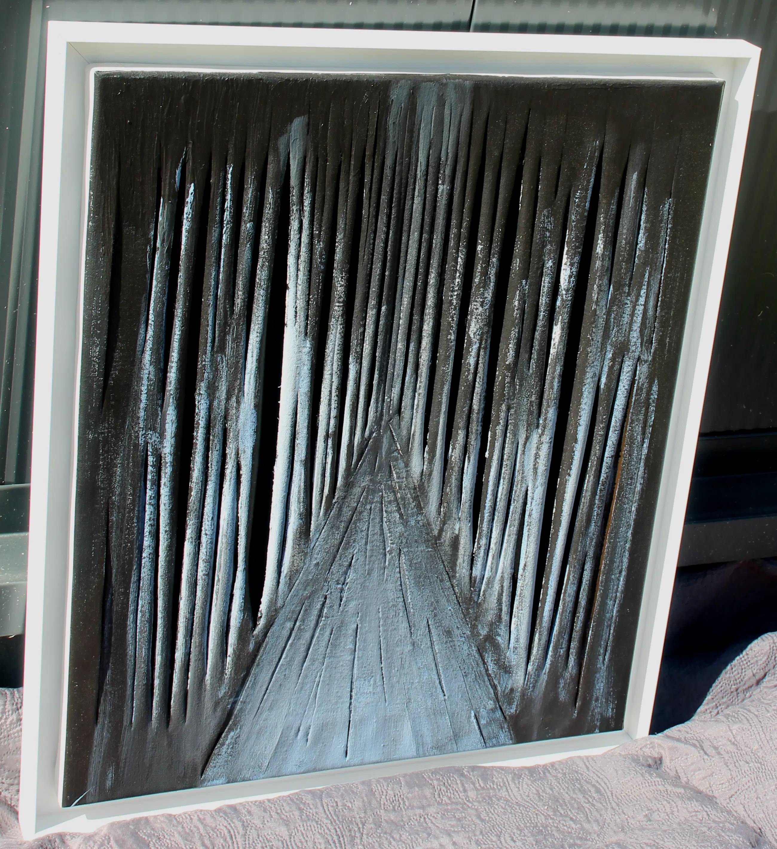 Prachtig werk van Jeroen Henneman. Door te snijden in het doek heeft hij stroken gecreerd die een twee bomenrijen naast een weg vormen.