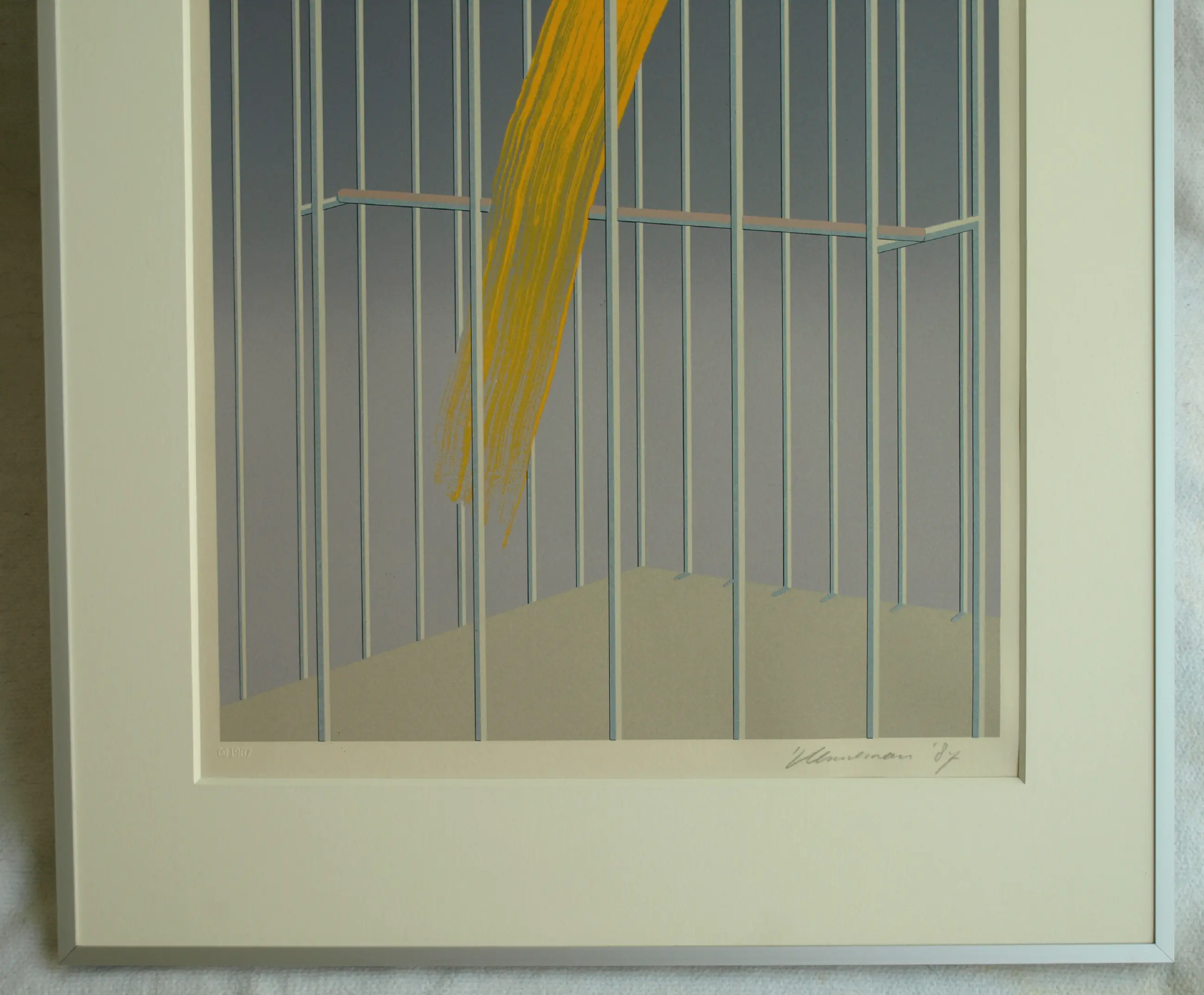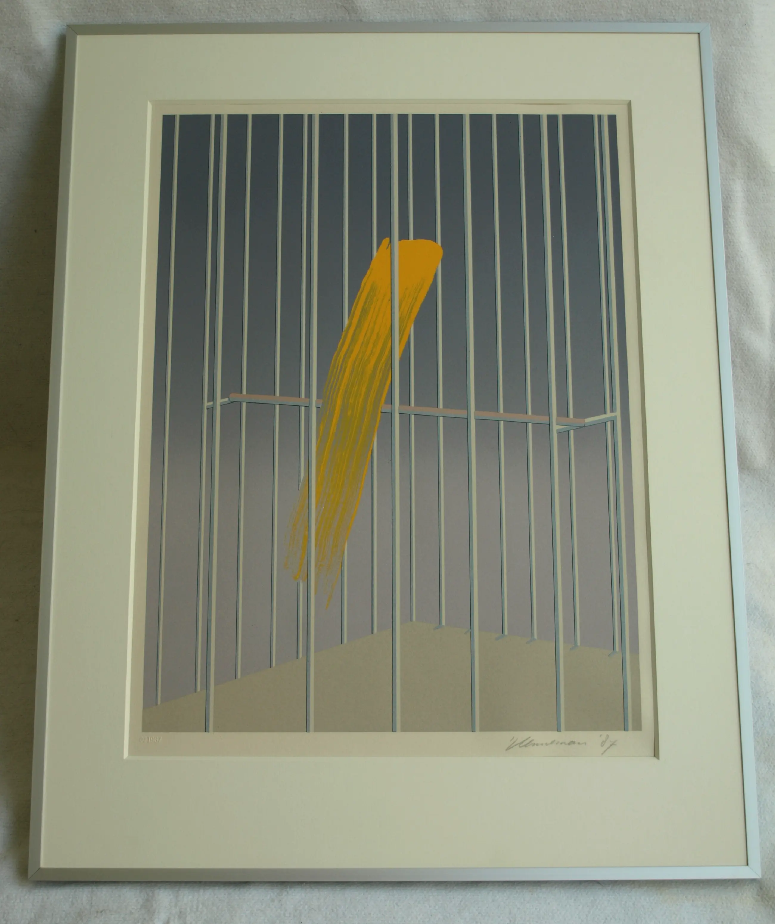 Jeroen Henneman zei over deze zeefdruk: "Als je naar een kanarie kijkt zonder bril zie je zo'n beetje een verfkloddertje in een kooitje. Ik heb een tijdje verf van heel hoog laten spatten, tot ik er eentje had die er een beetje fatsoenlijk uitzag".
