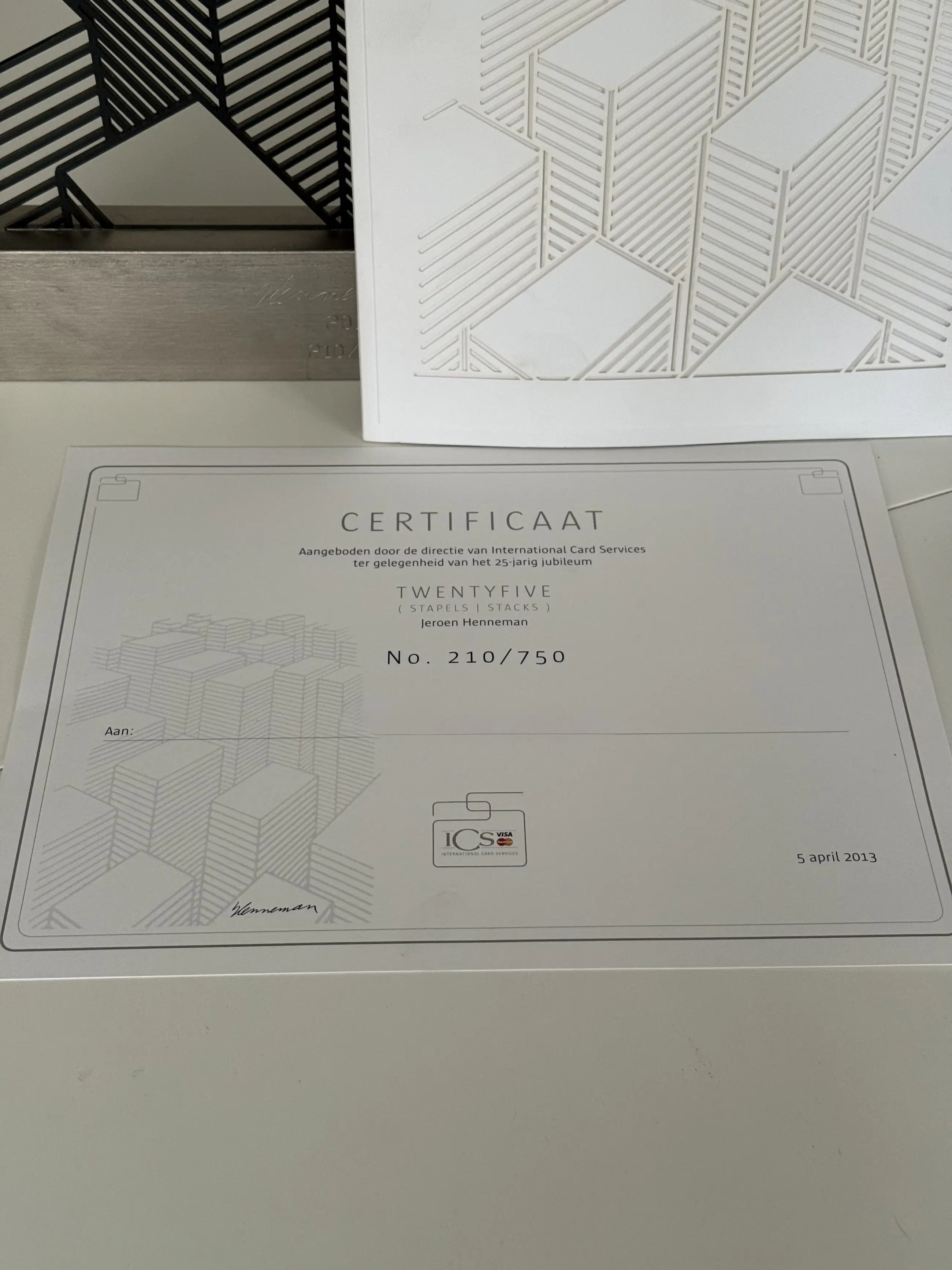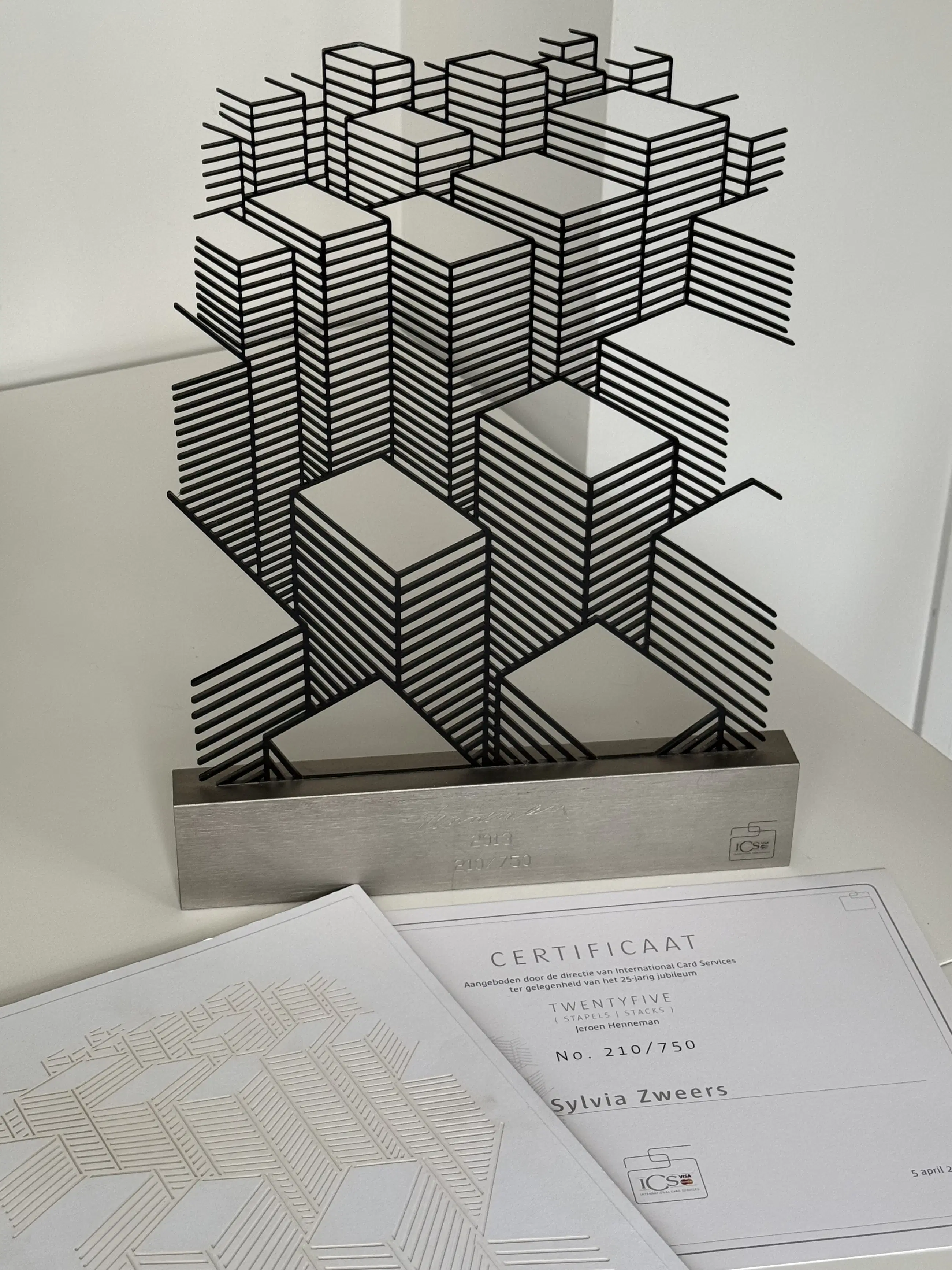 Omschrijving Een prachtig modern en speciaal beeld gemaakt door beeldend kunstenaar Jeroen Henneman. Het beeld is tussen de 35 en 40 cm hoog en is gemaakt voor het 25 jarig bestaan van ICS in 2013. Oplage 210/750