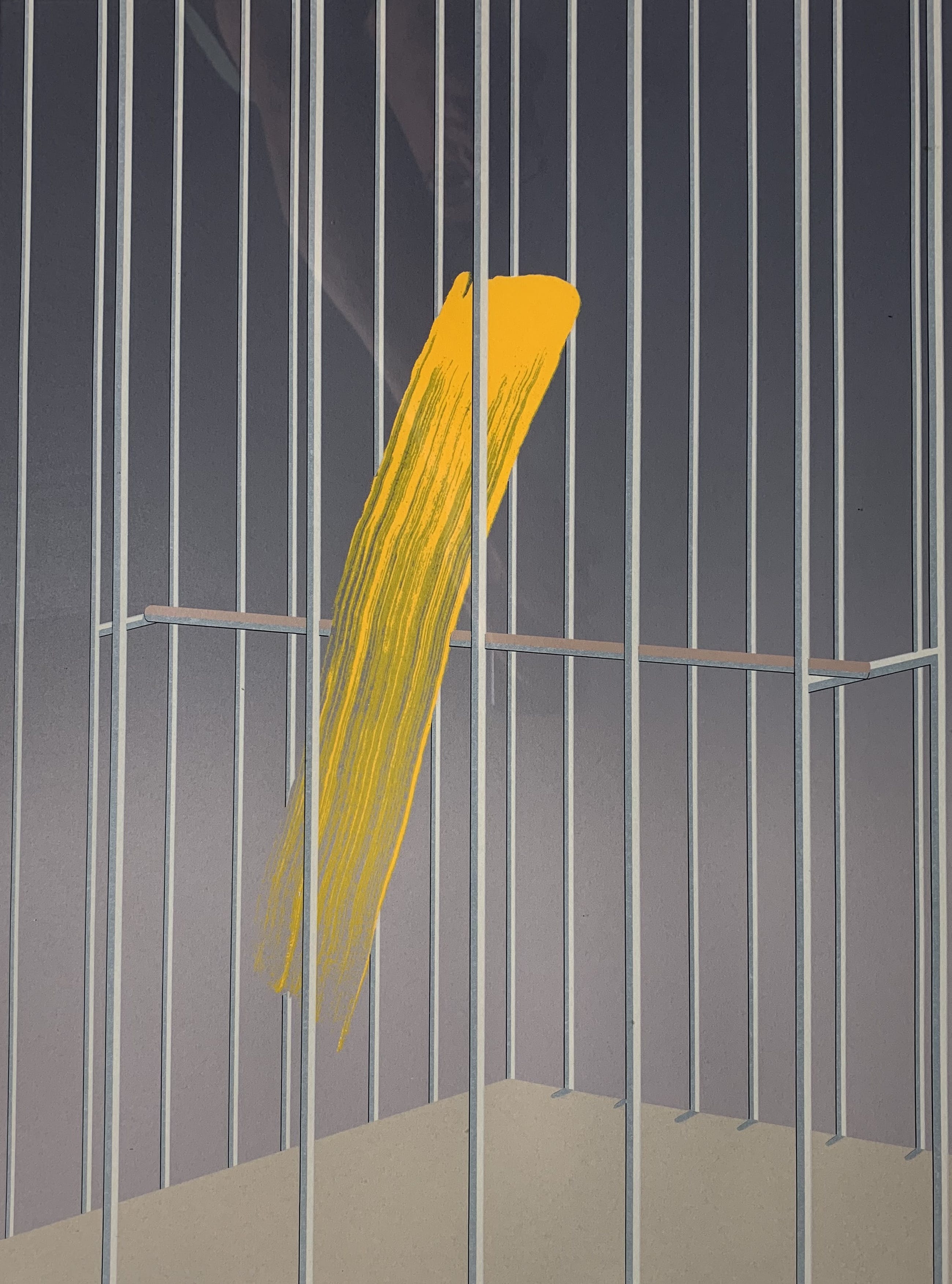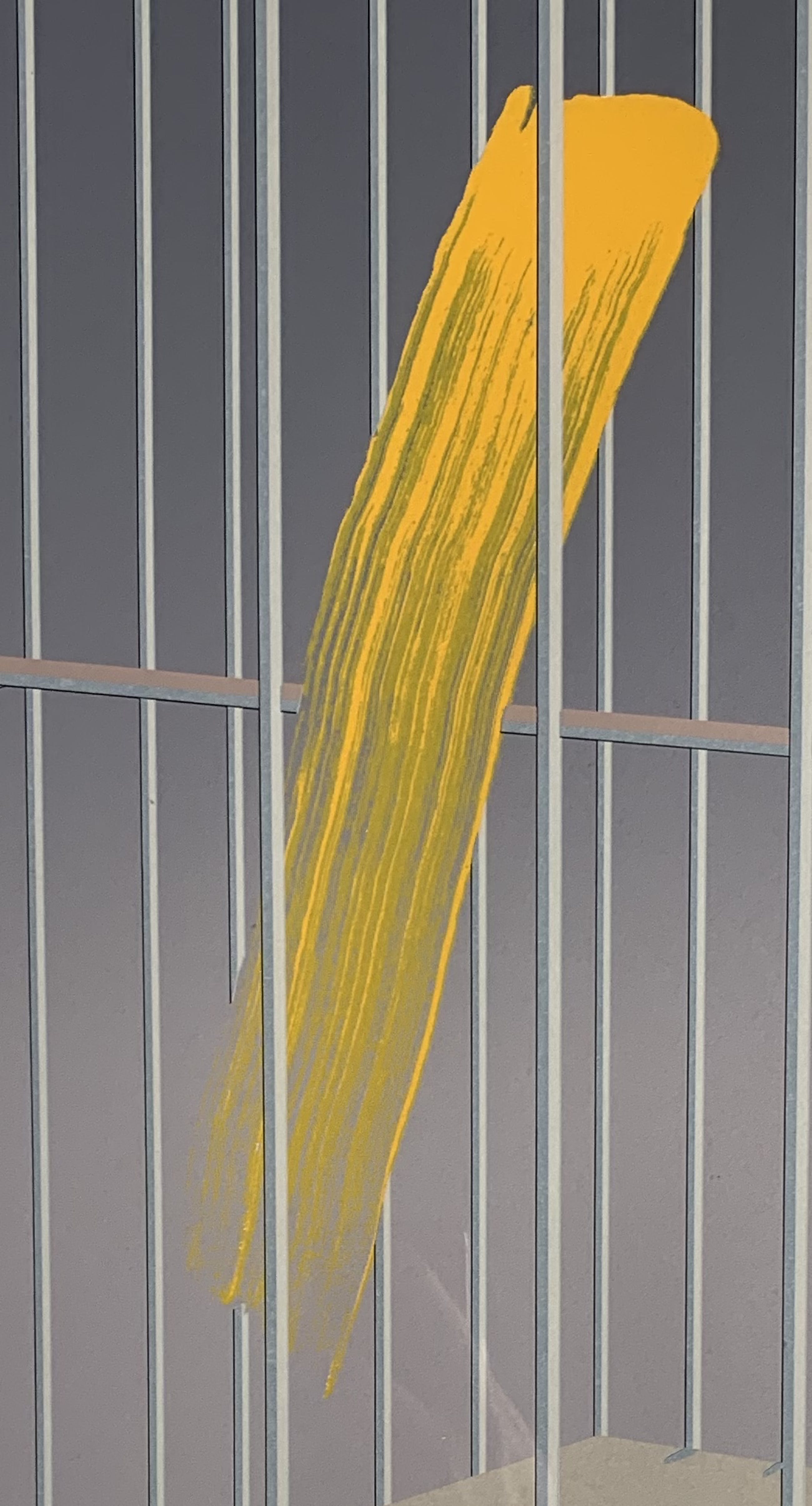 Jeroen Henneman merkte over deze zeefdruk op: "Als je naar een kanarie kijkt zonder bril zie je zo'n beetje een verfkloddertje in een kooitje. Ik heb een tijdje verf van heel hoog laten spatten, tot ik er eentje had die er een beetje fatsoenlijk uitzag"