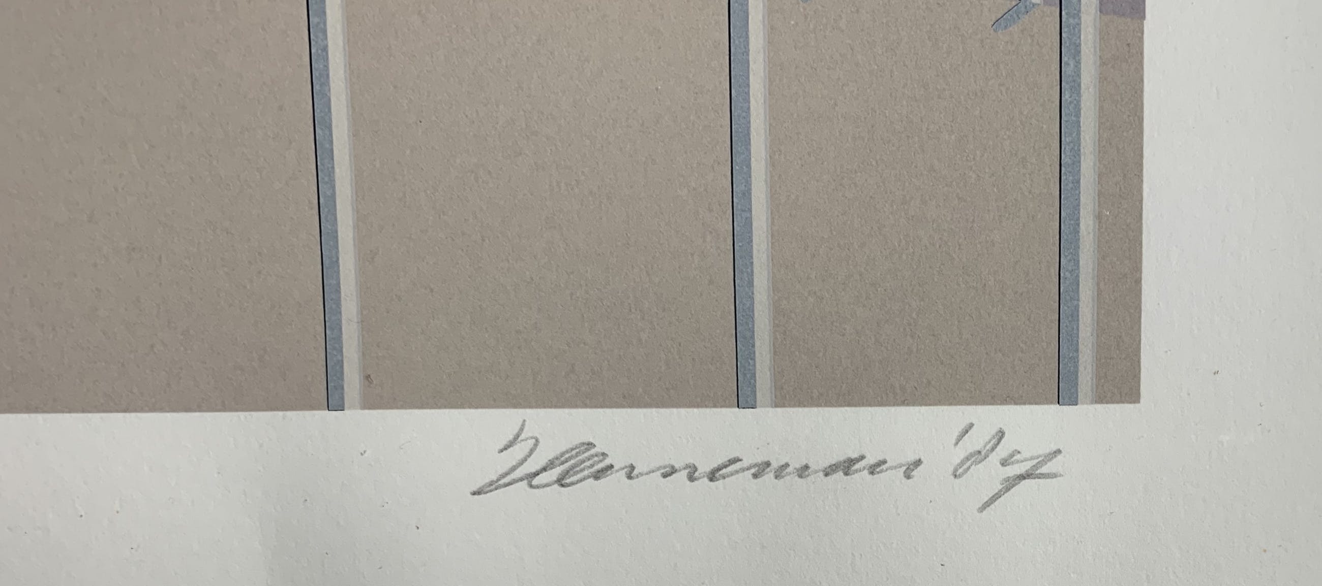 Zeefdruk van Jeroen Henneman (1942) getiteld "Uit het Leven der Dingen" uit de grafiekserie "Het Dagelijks Leven". Met potlood gesigneerd en gedateerd (rechts onder) en met een preegstempel gemerkt (links onder).