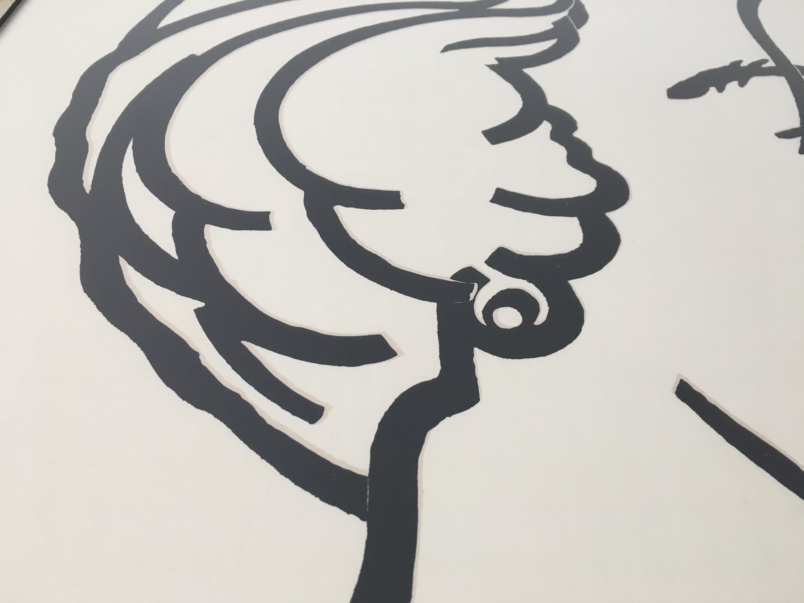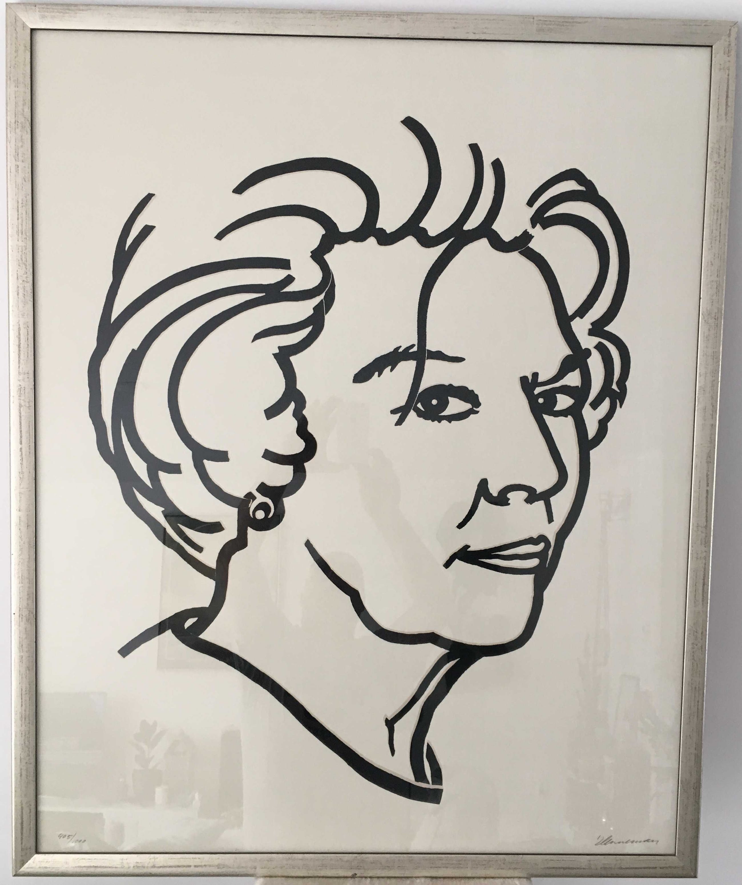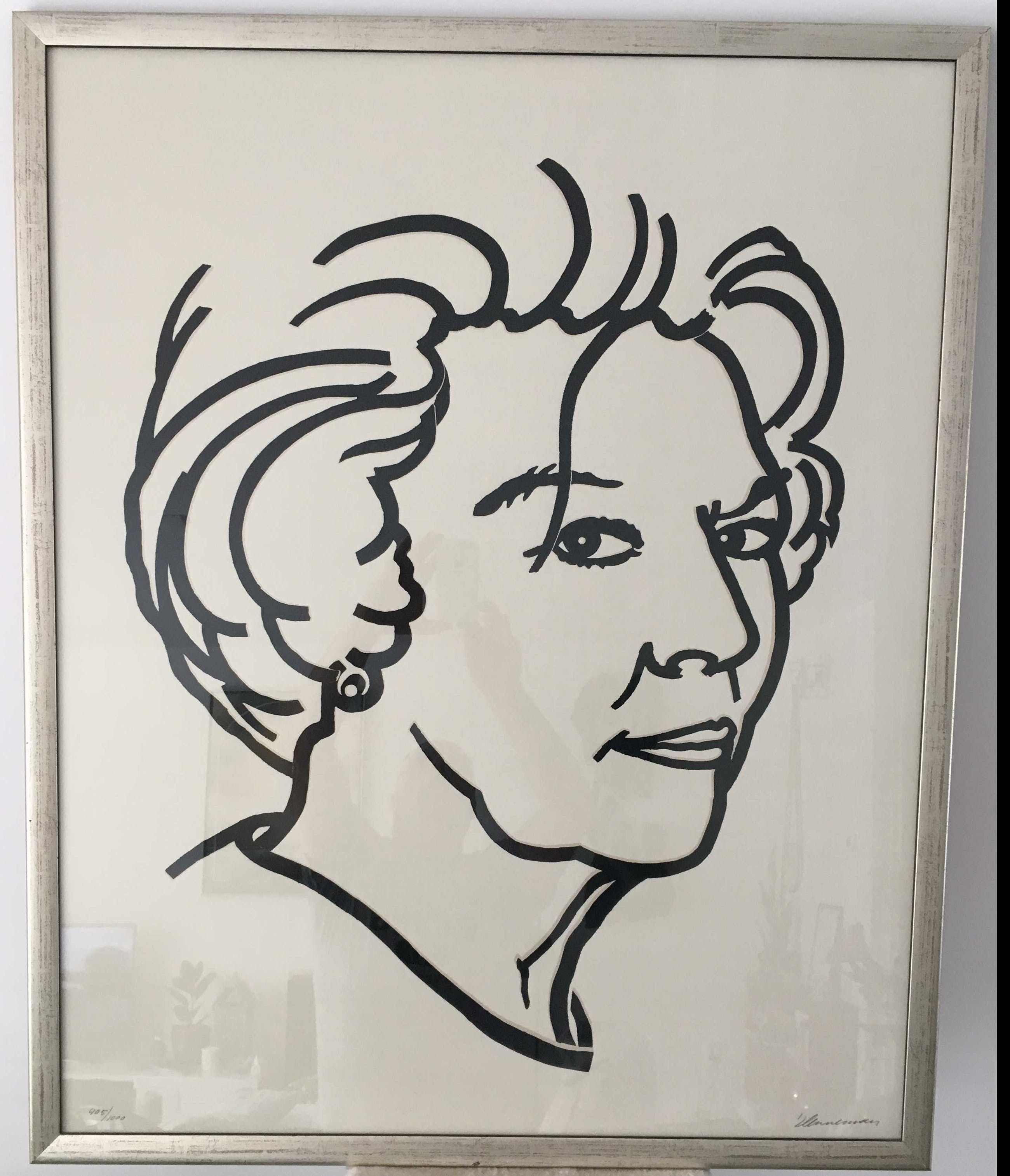Dit is een uniek werk van Jeroen Henneman en een uitstekende mogelijkheid om in het bezit te komen van een kunstwerk van deze toonaangevende kunstenaar. De oplage is 1000 en dit is het getekende nummer 405. Het werk is ons bezit gekomen en daarna direct ingelijst. Het bevindt zich in uitstekende staat en heeft jarenlang in de woonkamer gehangen, zonder dat het invloed van zon of ander overmatig licht heeft gehad. Het werk is oorspronkelijk een sculptuur in brons. De haarlok is met goedkeuring van Koningin Beatrix over het oog gevallen. Anders was het niet mogelijk het oog aan de rest van het sculptuur te koppelen.