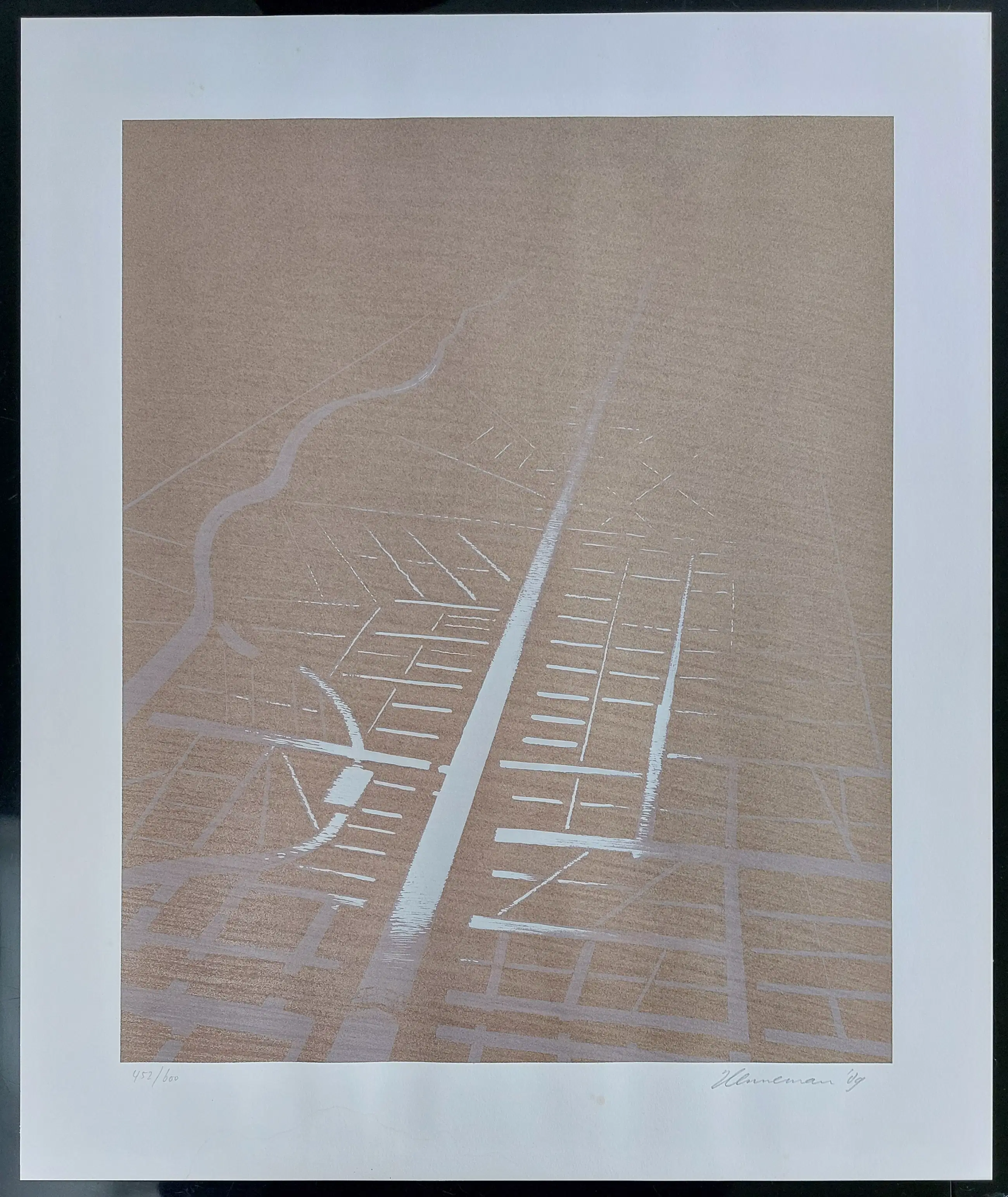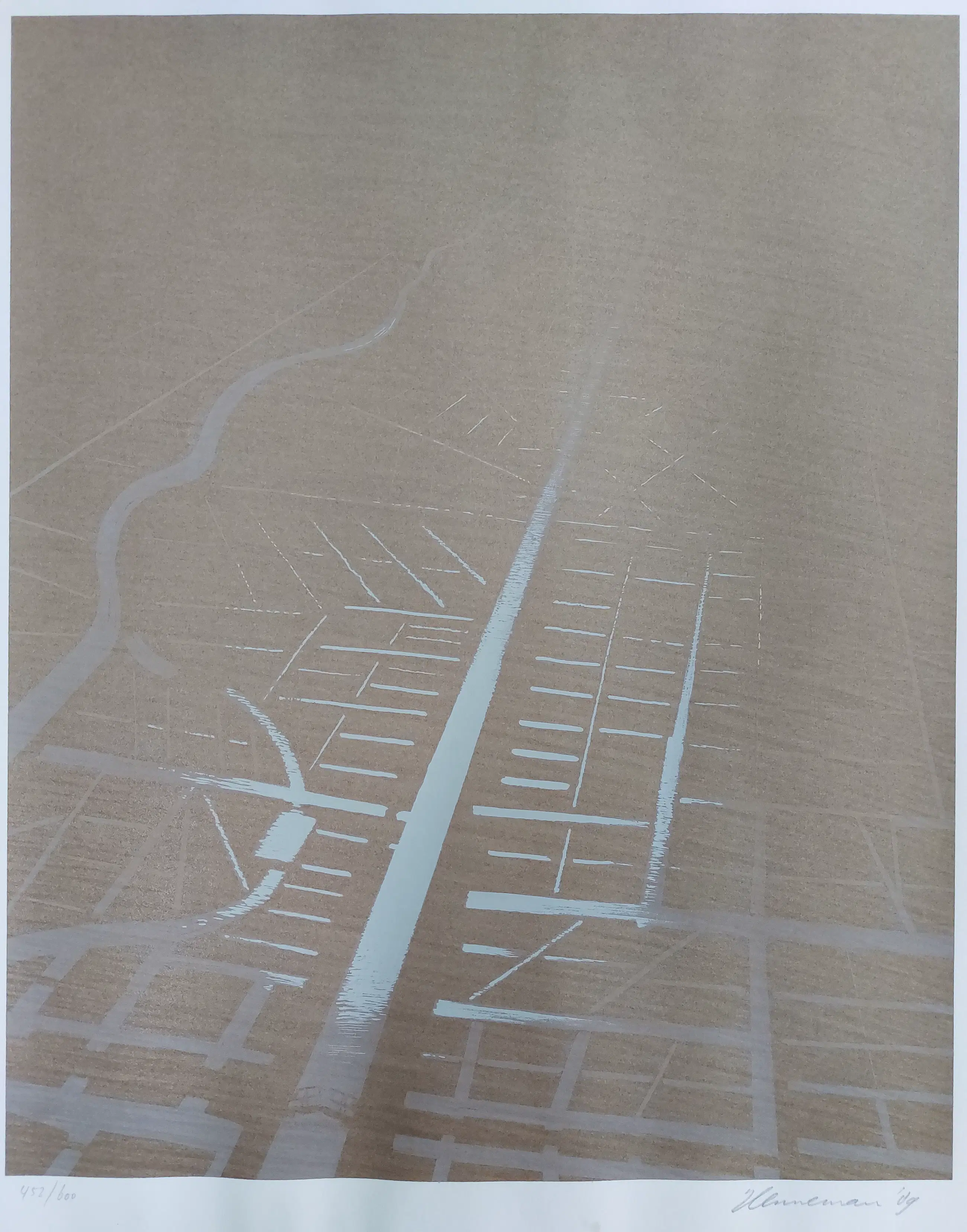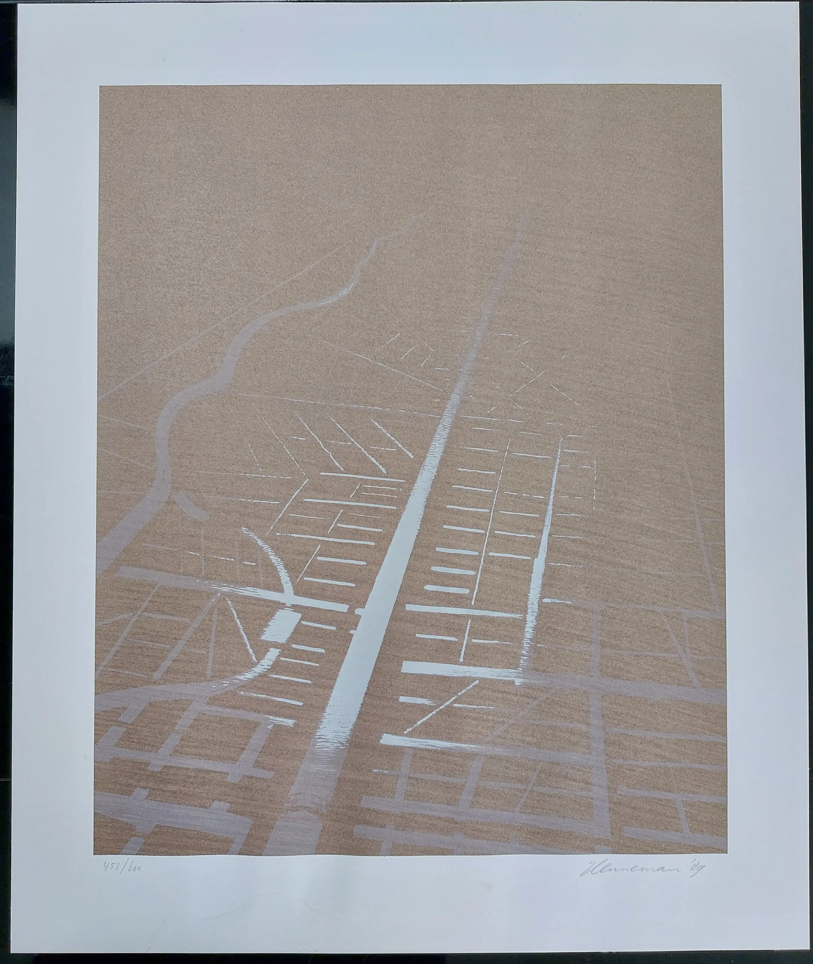 Mooie grote zeefdruk van Jeroen Henneman met afgebeeld een Nederlands landschap in vogelvlucht gezien waardoor een abstract beeld lijkt te ontstaan. Handgesigneerd, gedateerd en genummerd in potlood.
