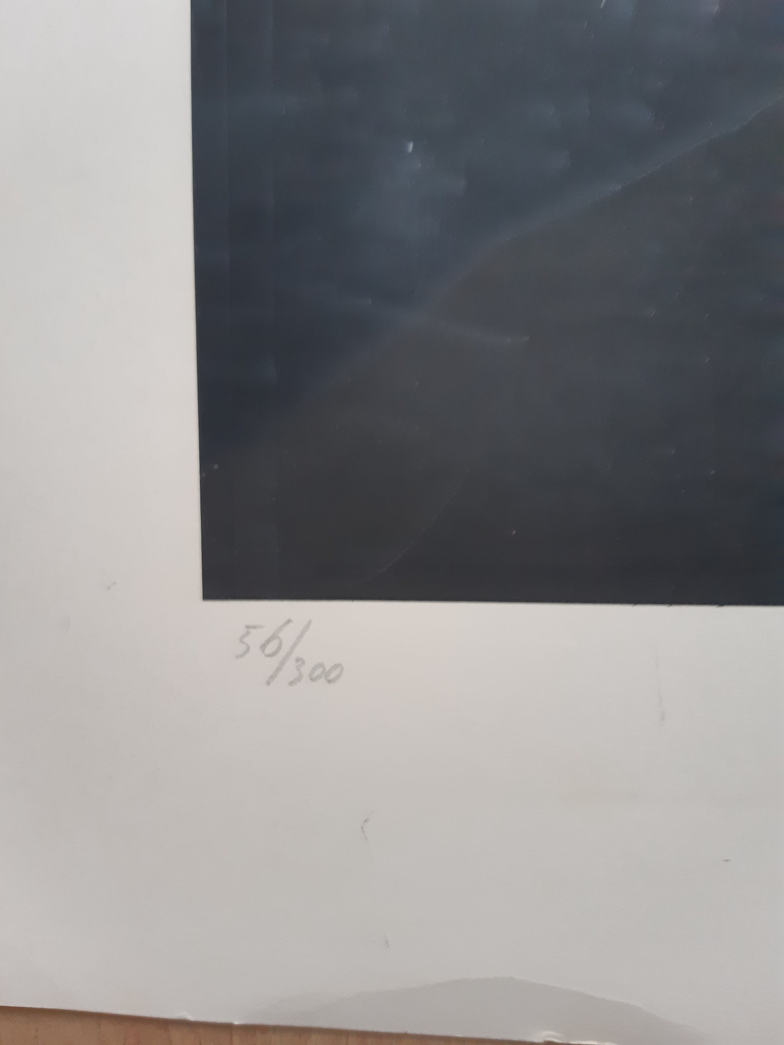 Enkele bijna onzichtbaar vlekken en 2 klein scheur op de wit rand van het Litho en een klein merk boven de handtekening zichtbaar op de foto.