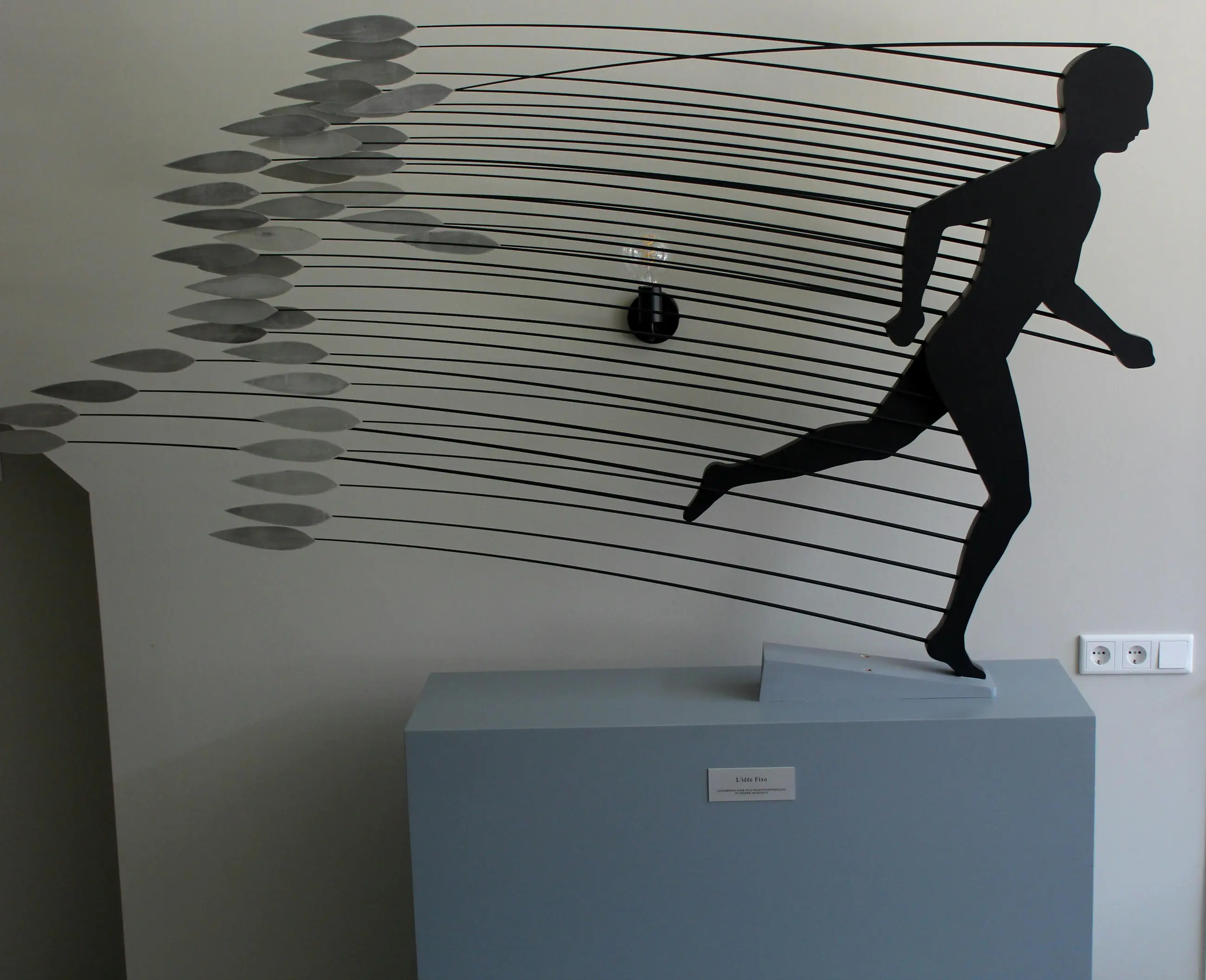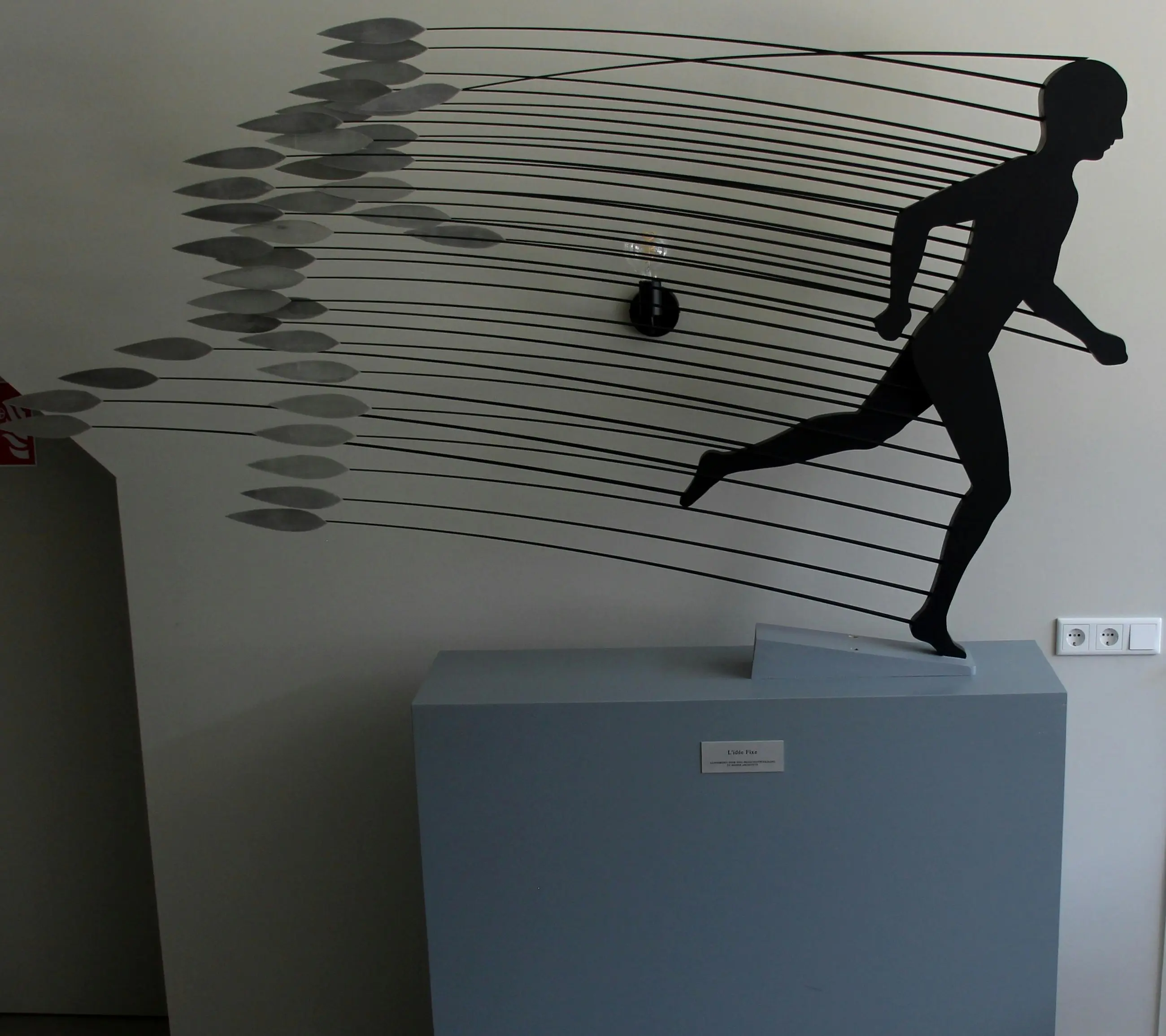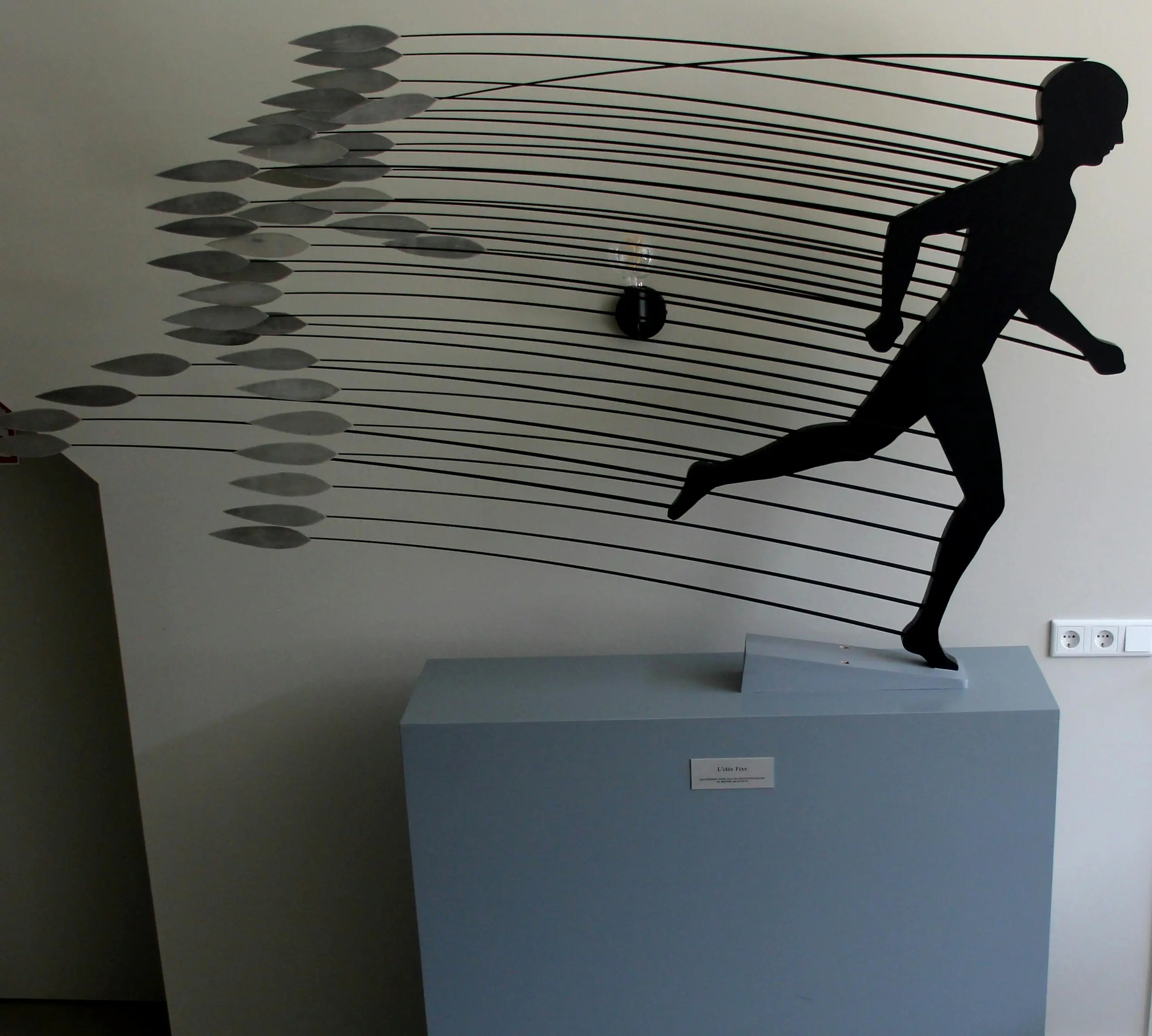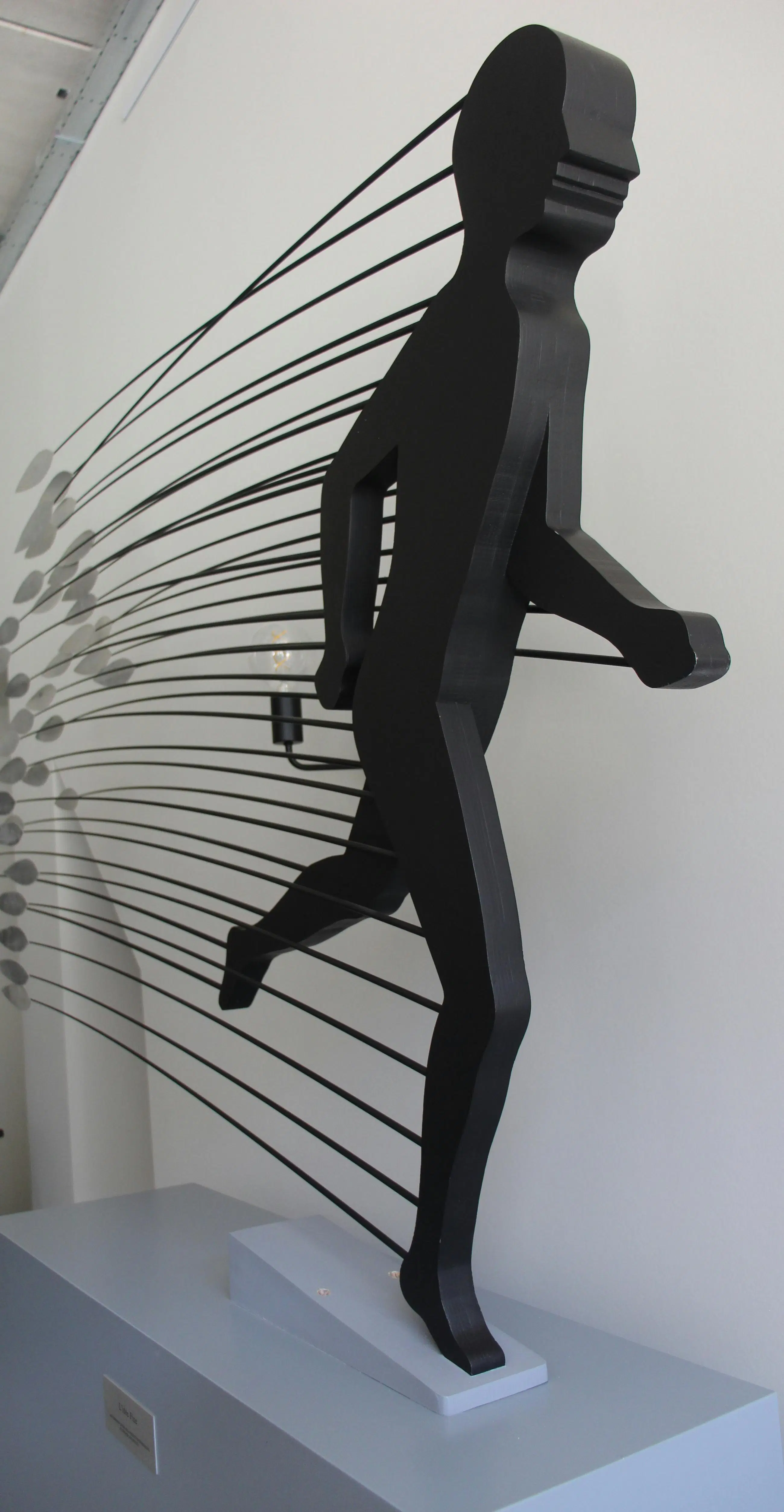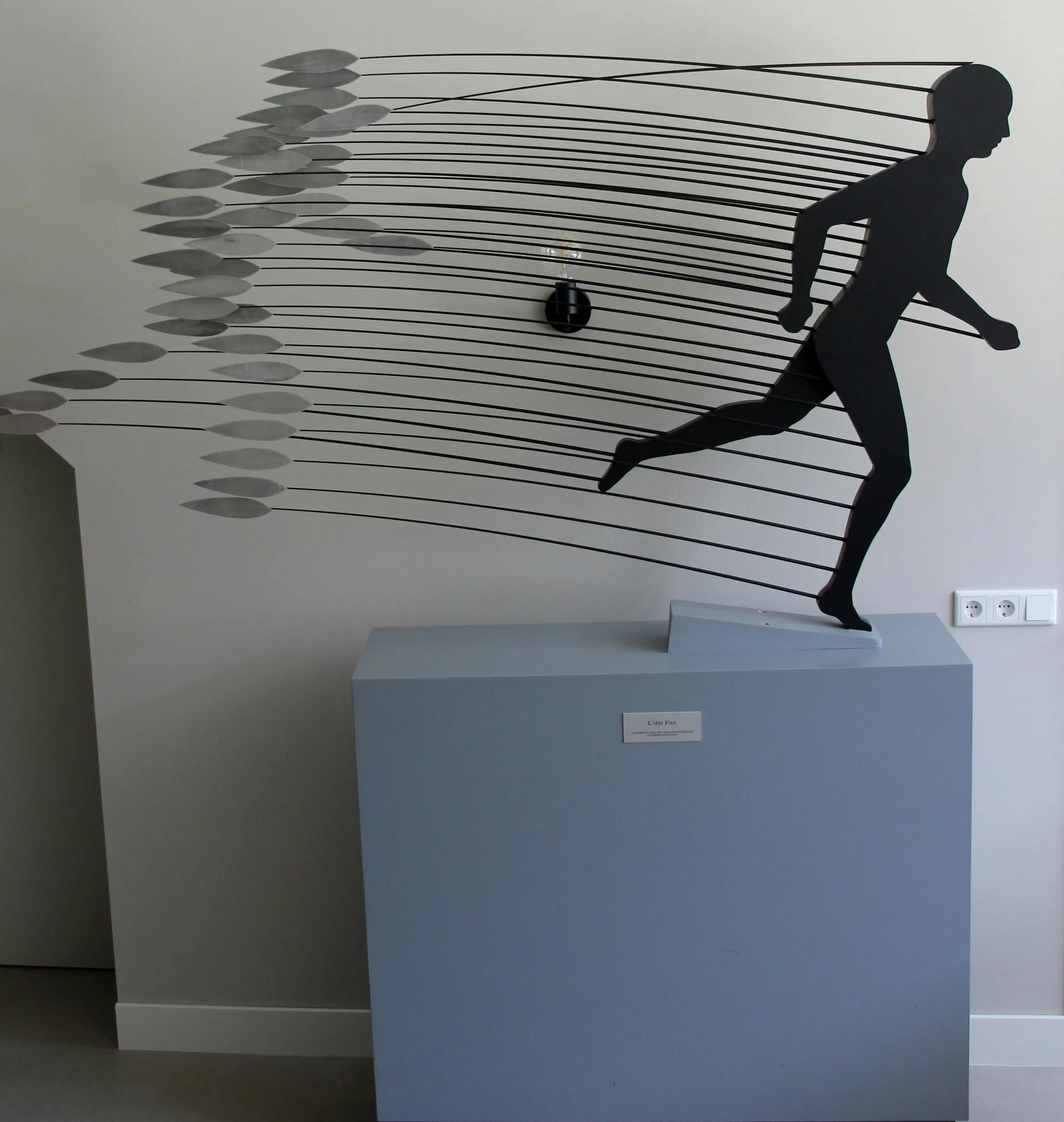 Dit kunstwerk is L' idée Fixe, een sculptuur van de Nederlandse kunstenaar Jeroen Henneman, gemaakt in 2006. Het toont een silhouet van een rennende figuur, uitgevoerd in zwartgelakt hout. De lijnen suggereren beweging en snelheid door de figuur te verbinden met ovaalvormige objecten in de ruimte.