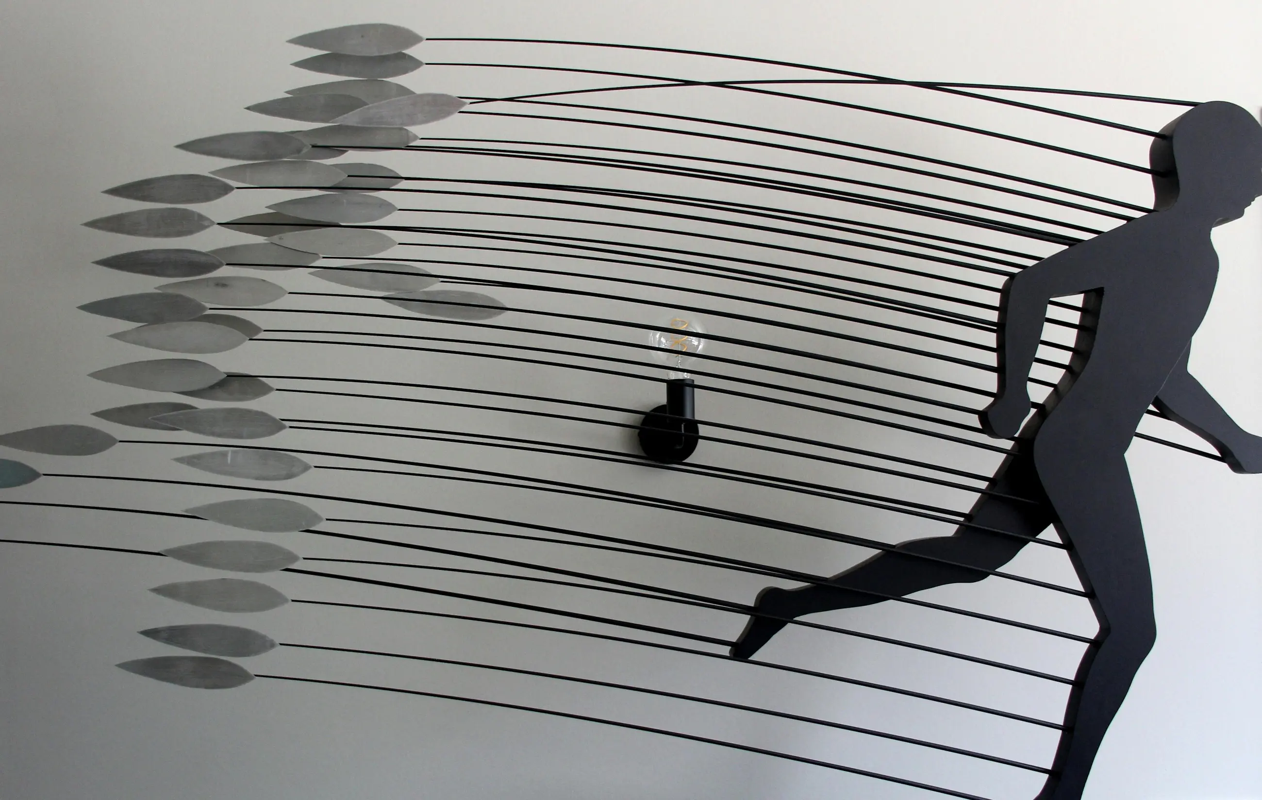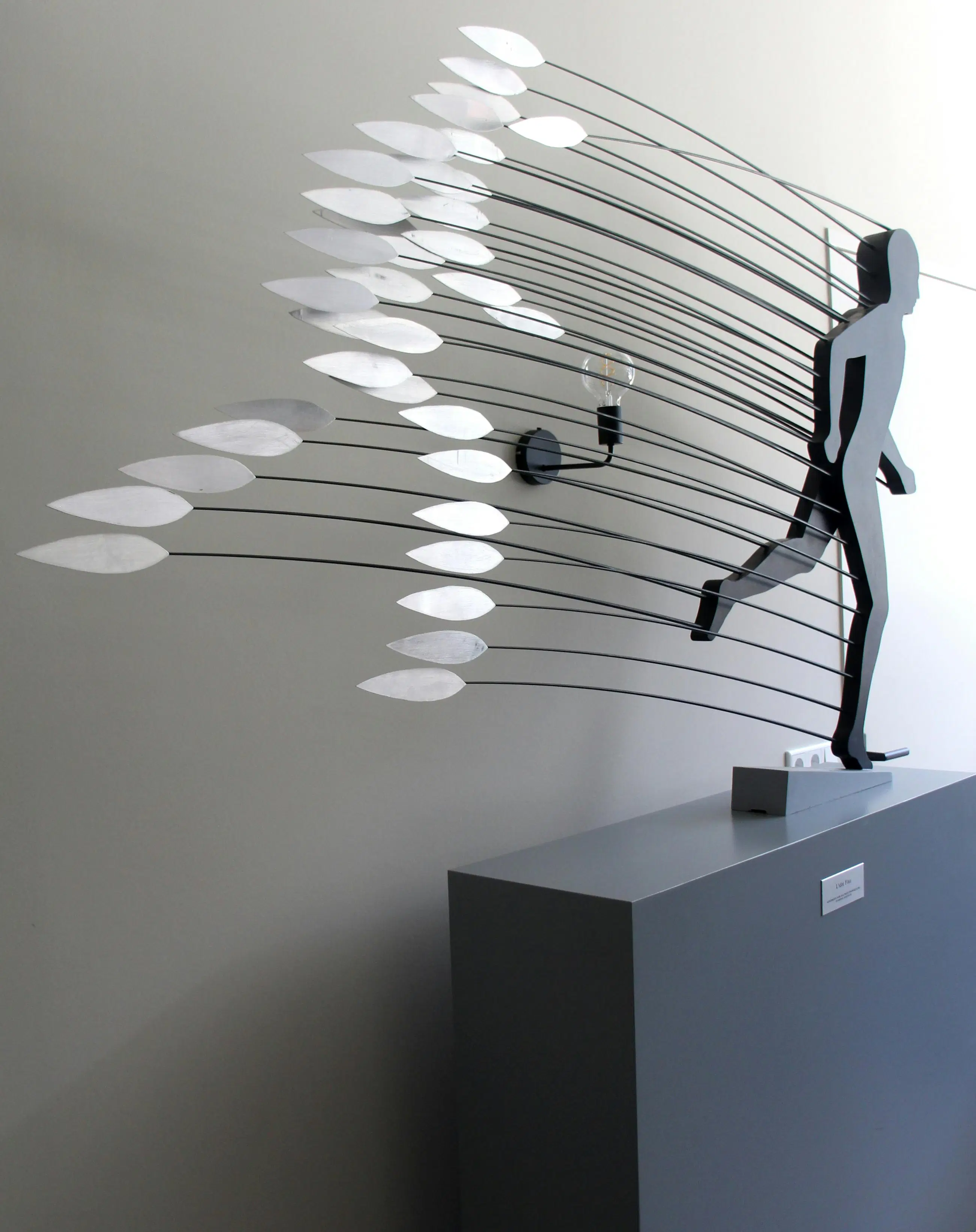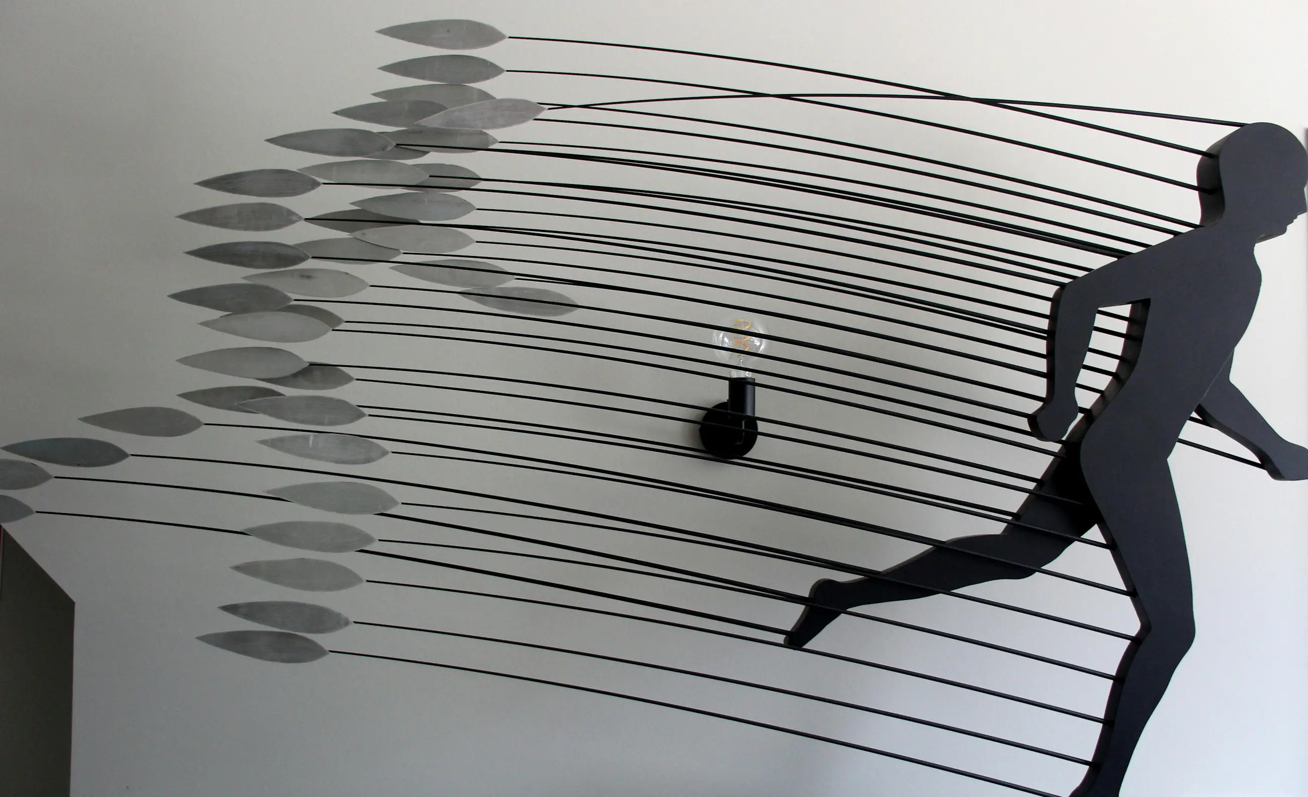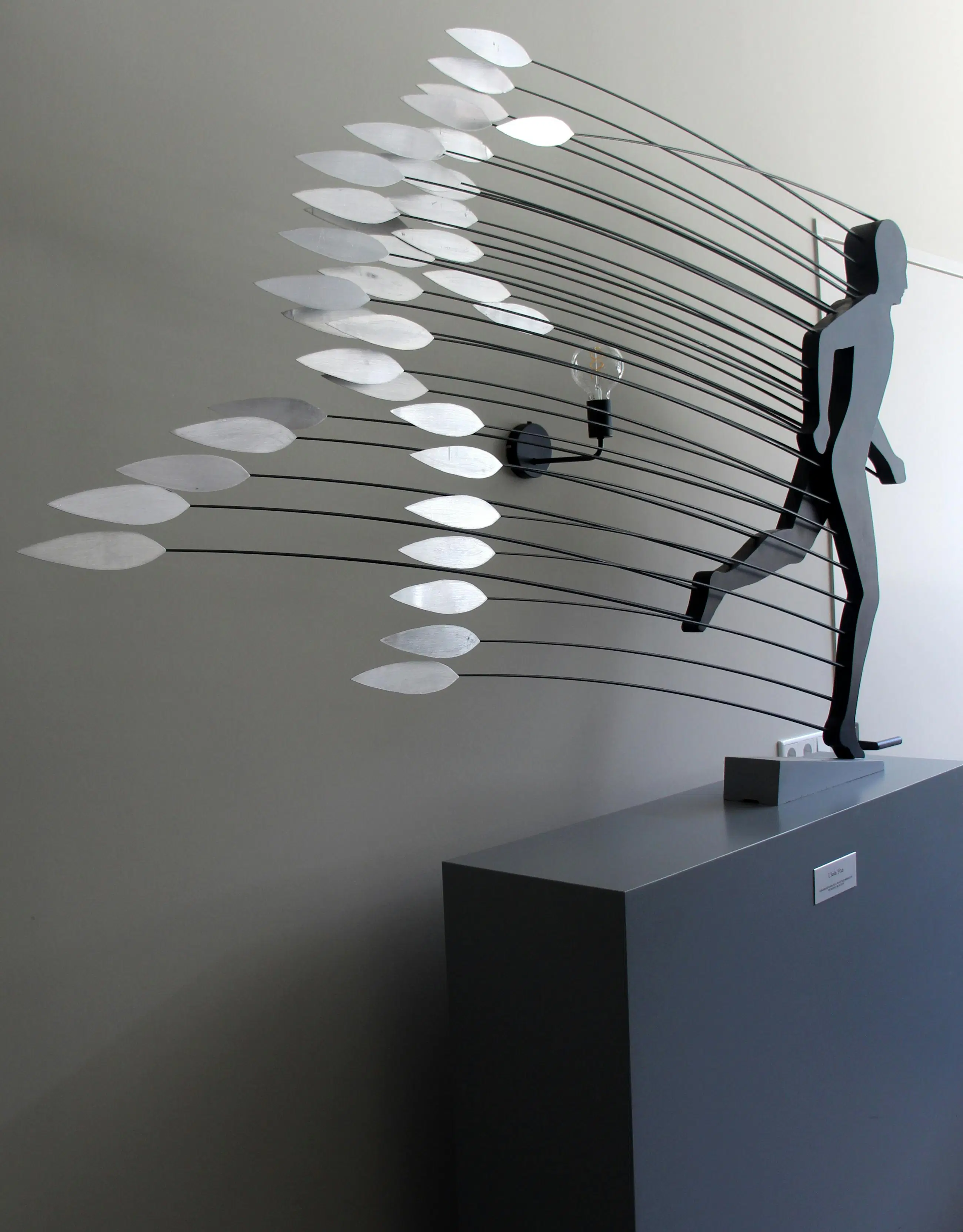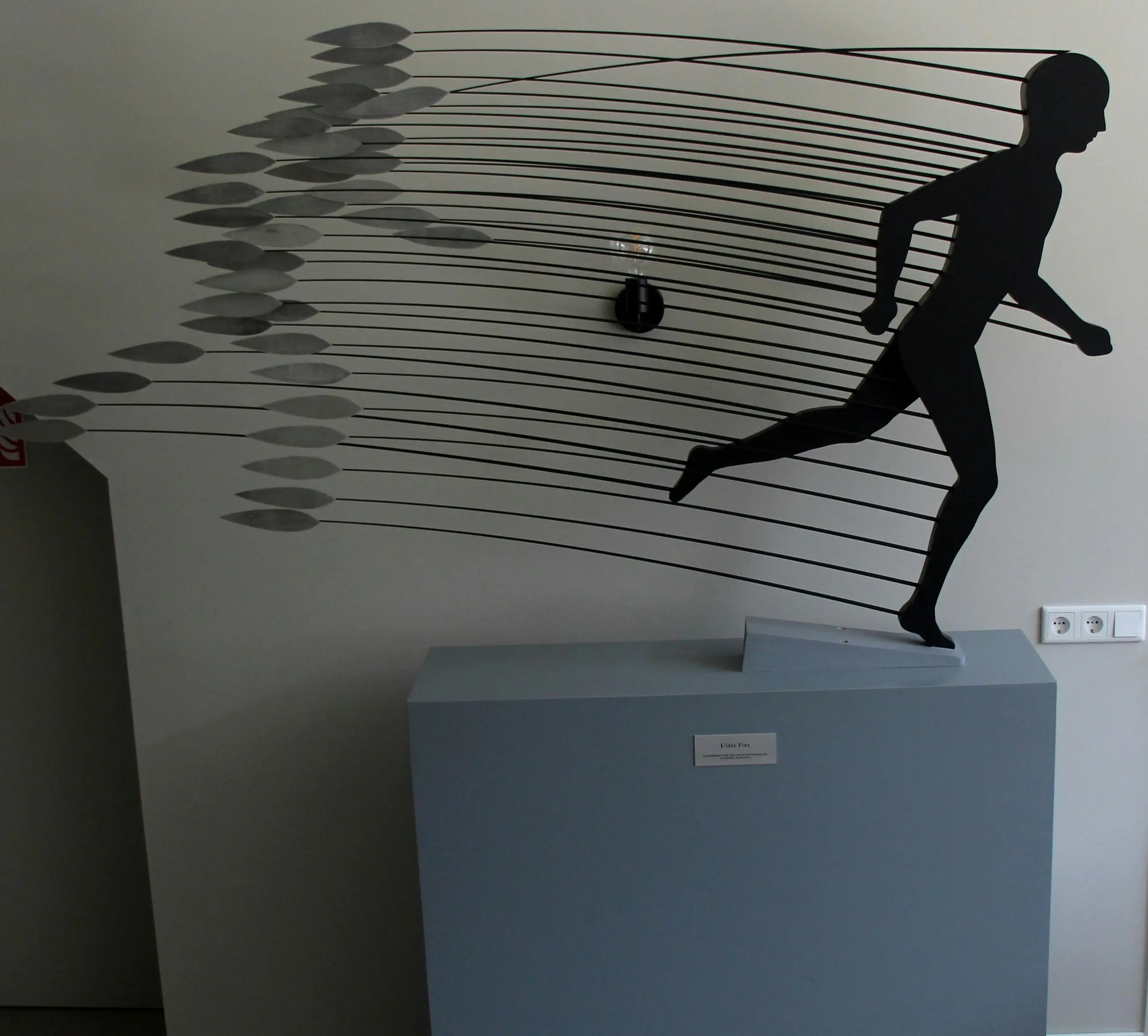 Dit kunstwerk is L' idée Fixe, een sculptuur van de Nederlandse kunstenaar Jeroen Henneman, gemaakt in 2006. Het toont een silhouet van een rennende figuur, uitgevoerd in zwartgelakt hout. De lijnen suggereren beweging en snelheid door de figuur te verbinden met ovaalvormige objecten in de ruimte.