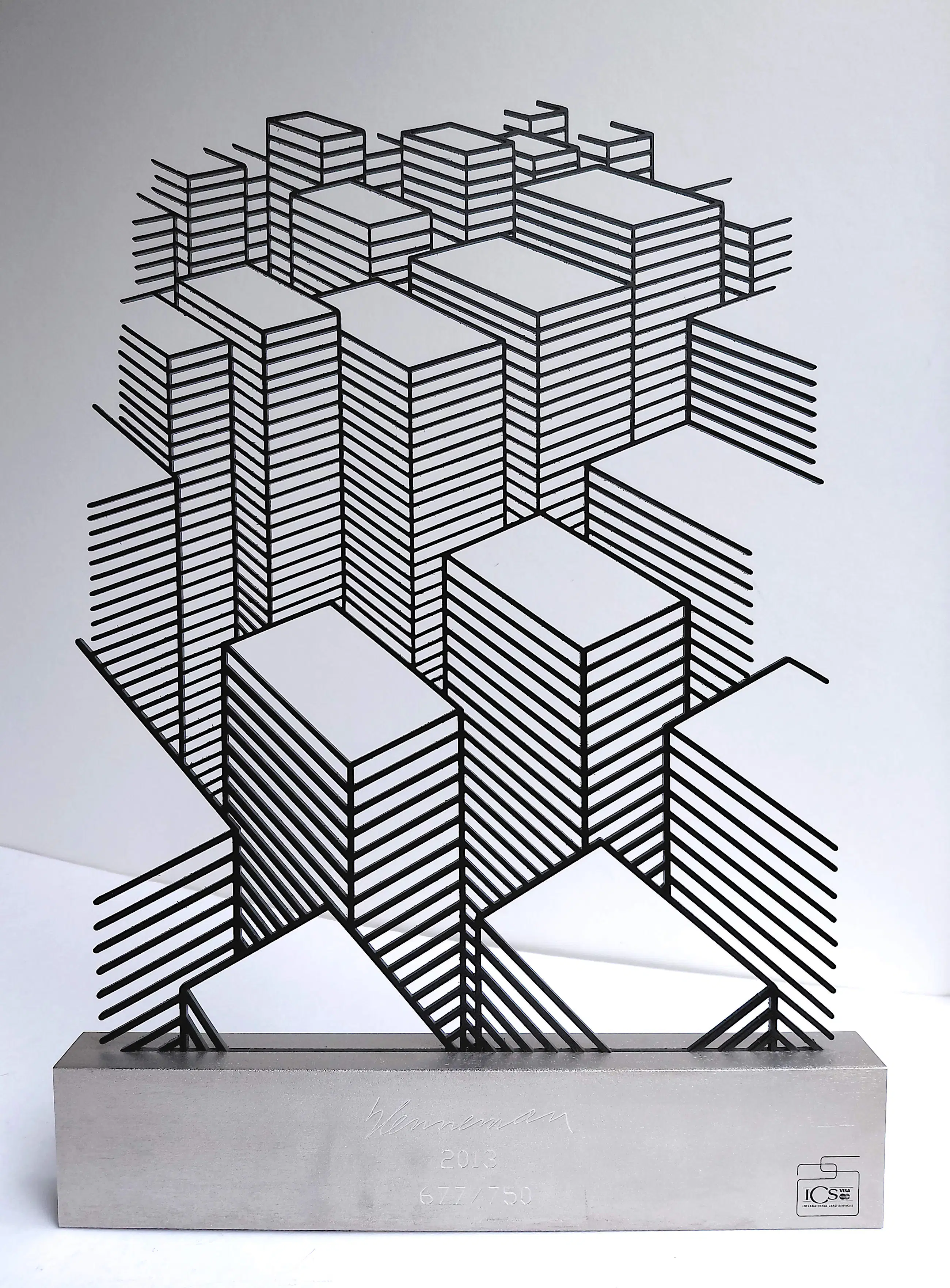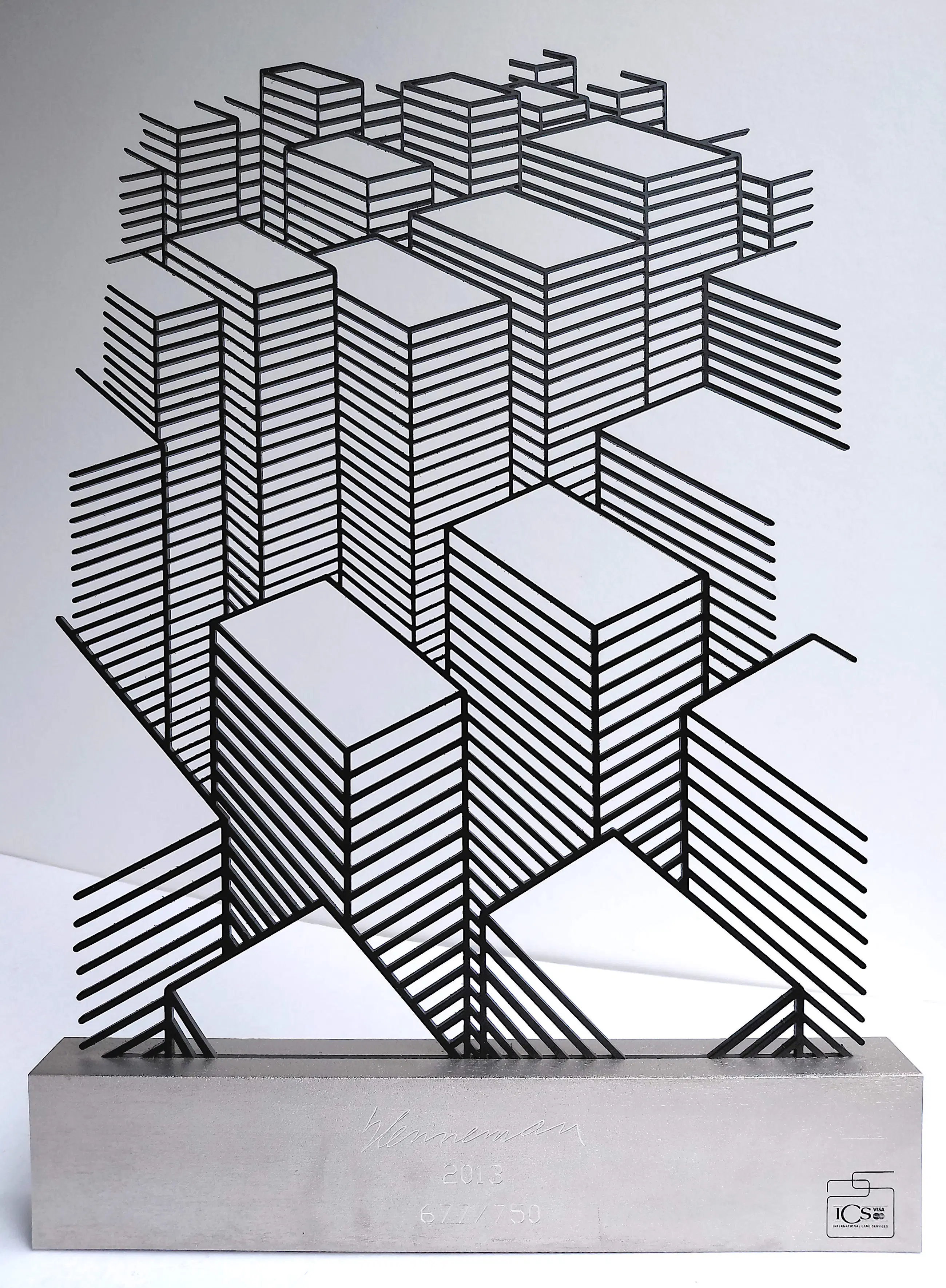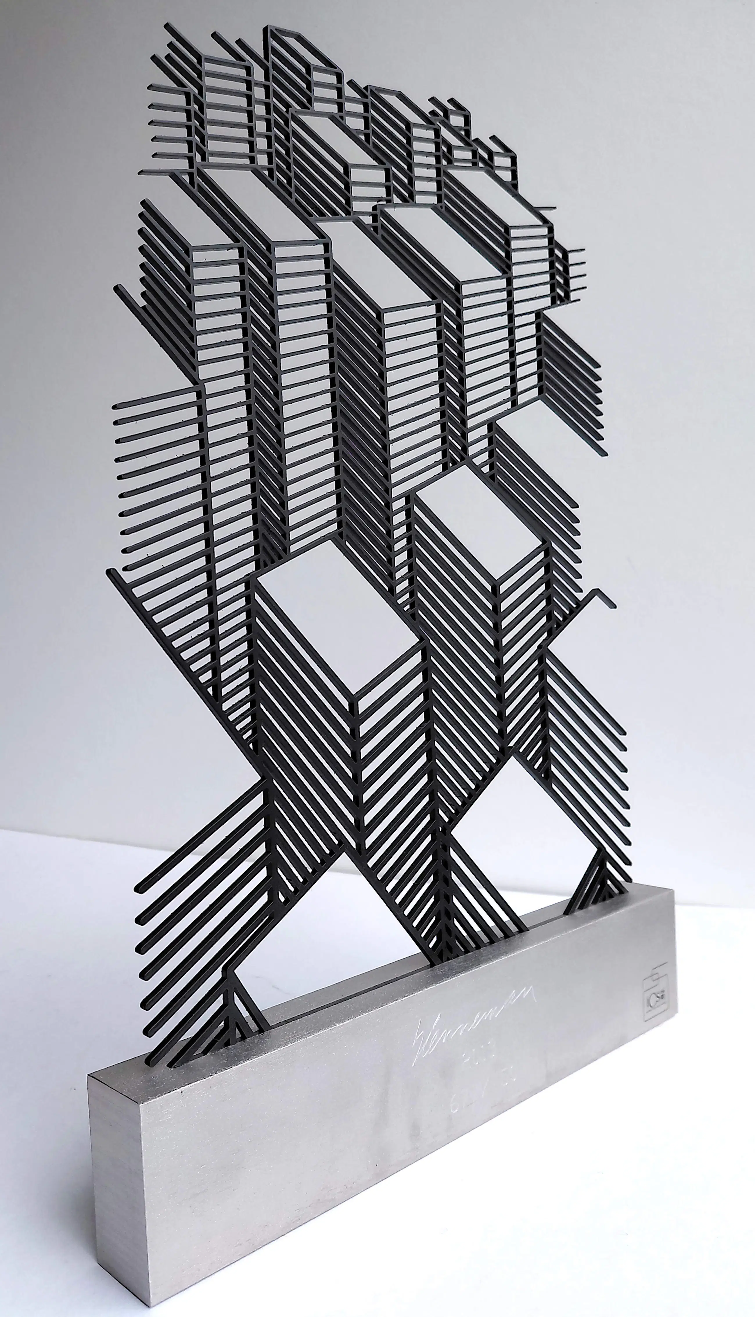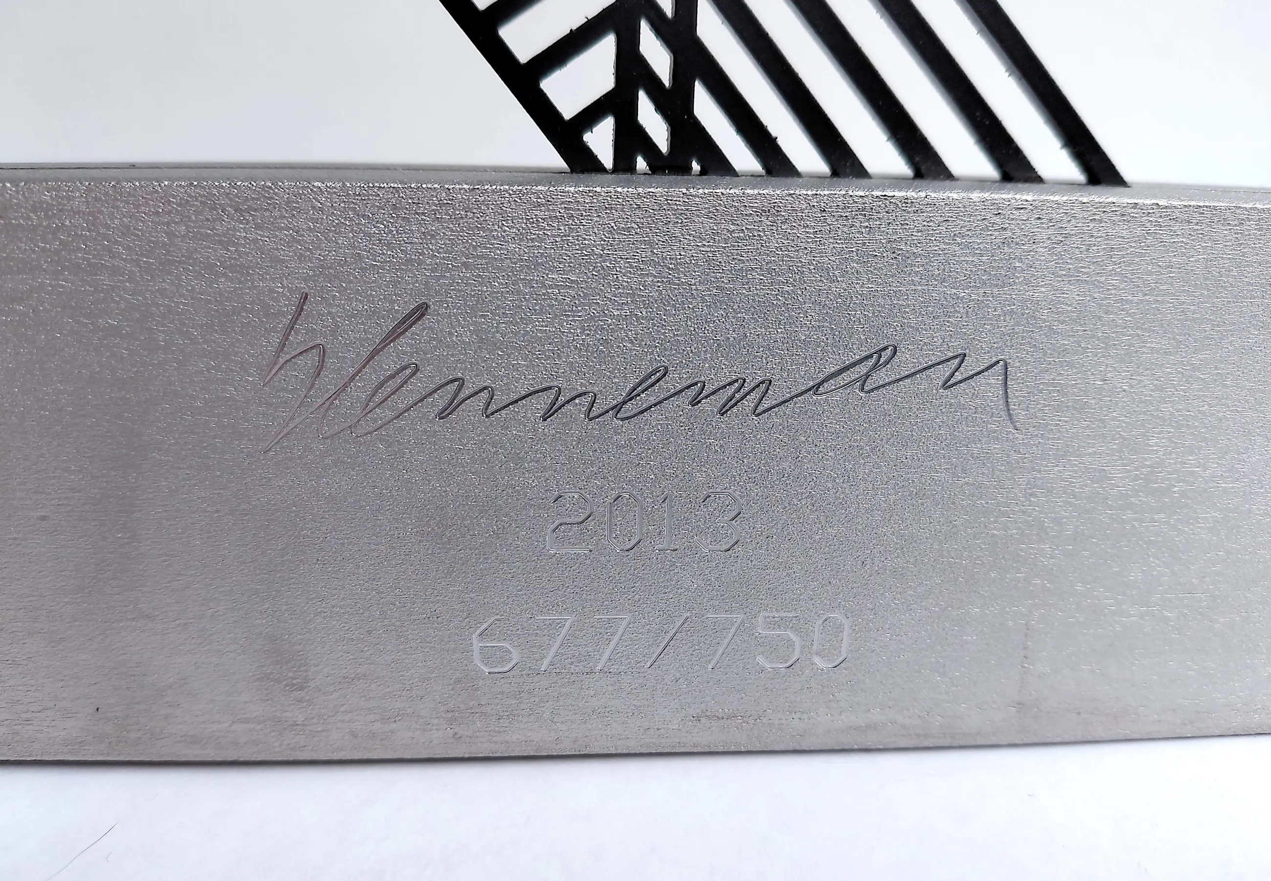 Prachtig, direct herkenbaar object van Jeroen Henneman. Roestvrijstalen object, op de voet gesigneerd, gedateerd en genummerd (677/750) en met stempel van de uitgevende instantie (International Card Services). Totaalgewicht: 4,7 kg. In de originele cassette en met boek met tekst van Rudi Fuchs. Alles in nieuwstaat.