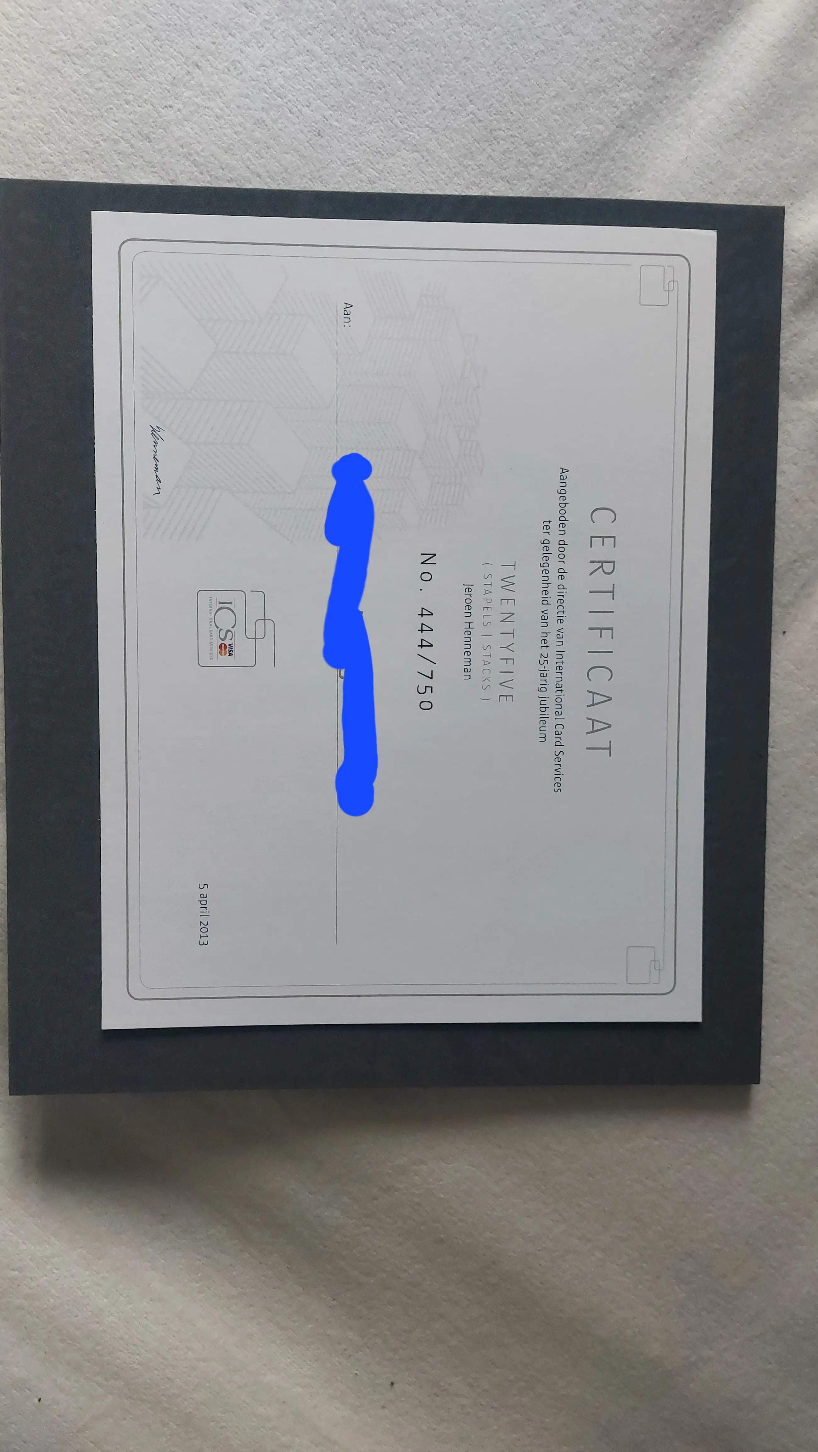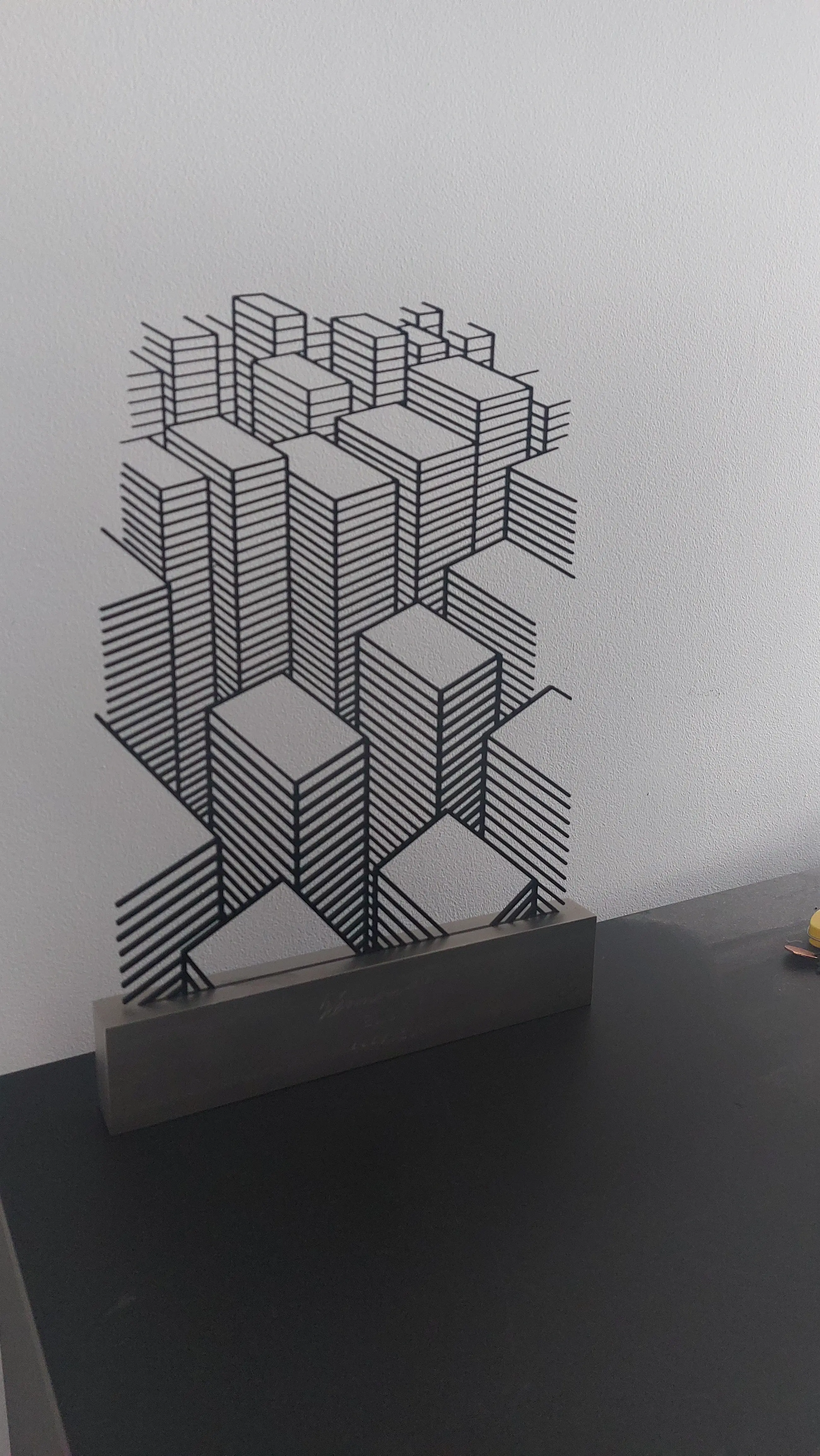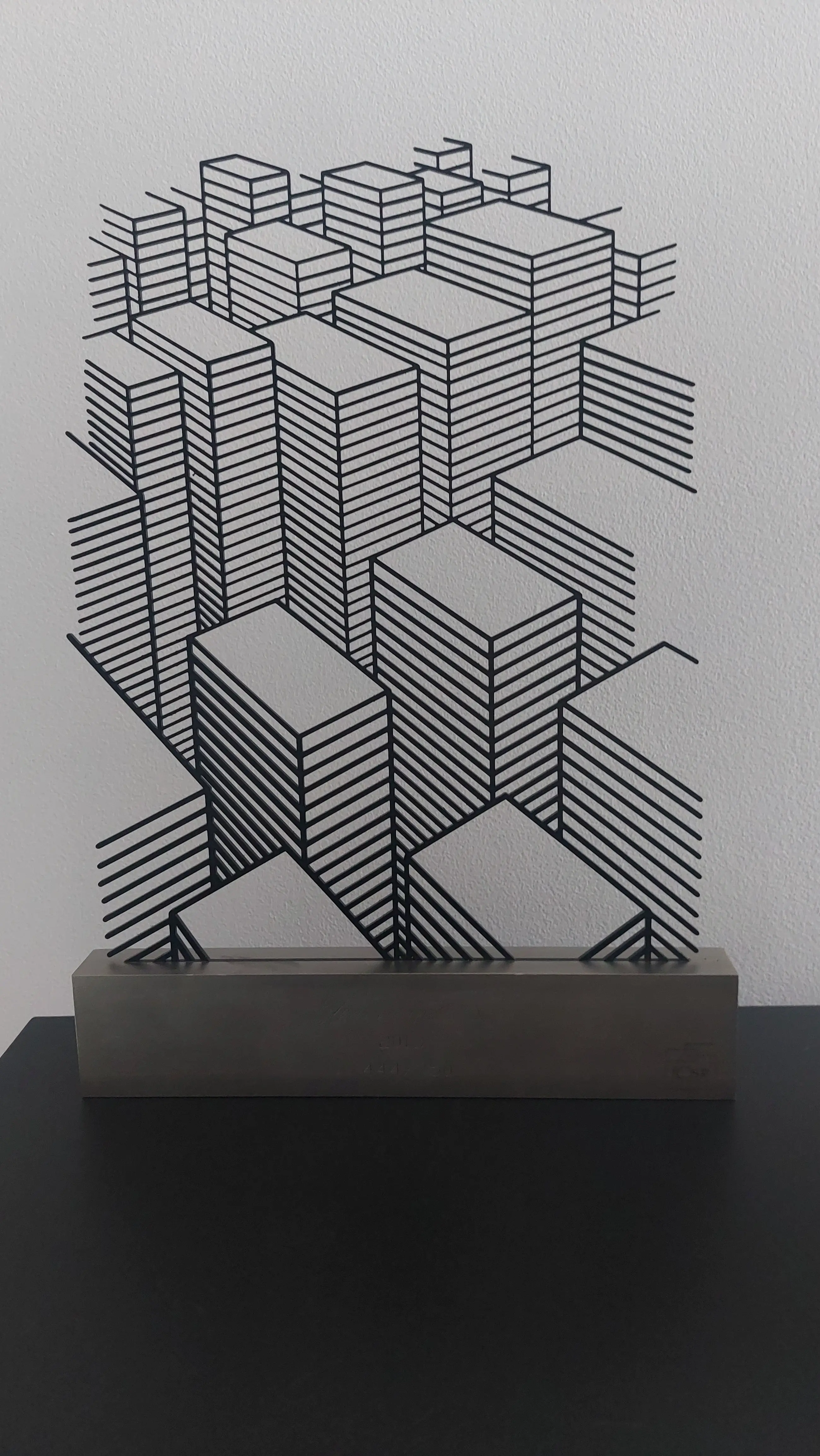 Kunstwerk aangeboden aan personeel en relaties bij het 25 jarig jubileum van ICS. Het kunstwerk staat op een kleine sokkel en komt voor een witte muur uit tot "leven".
