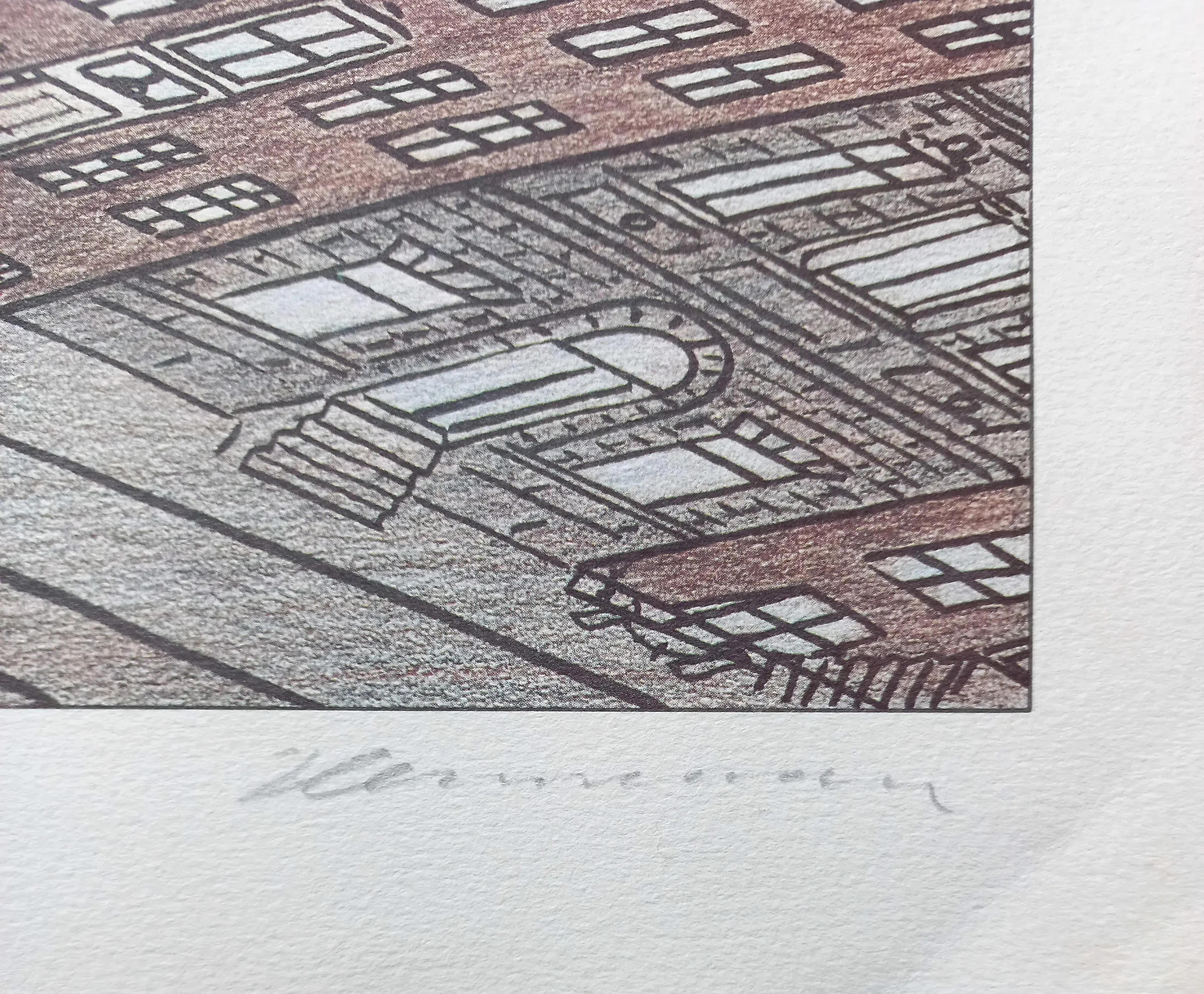 Karakteristiek stadsgezicht van Jeroen Henneman, uitgegeven in 1989 in het kader van het project Twelve European Artists. Offset litho op papier, met potlood gesigneerd. In goede conditie. Deze compositie is ook te zien op Henneman’s website (zie laatste foto).