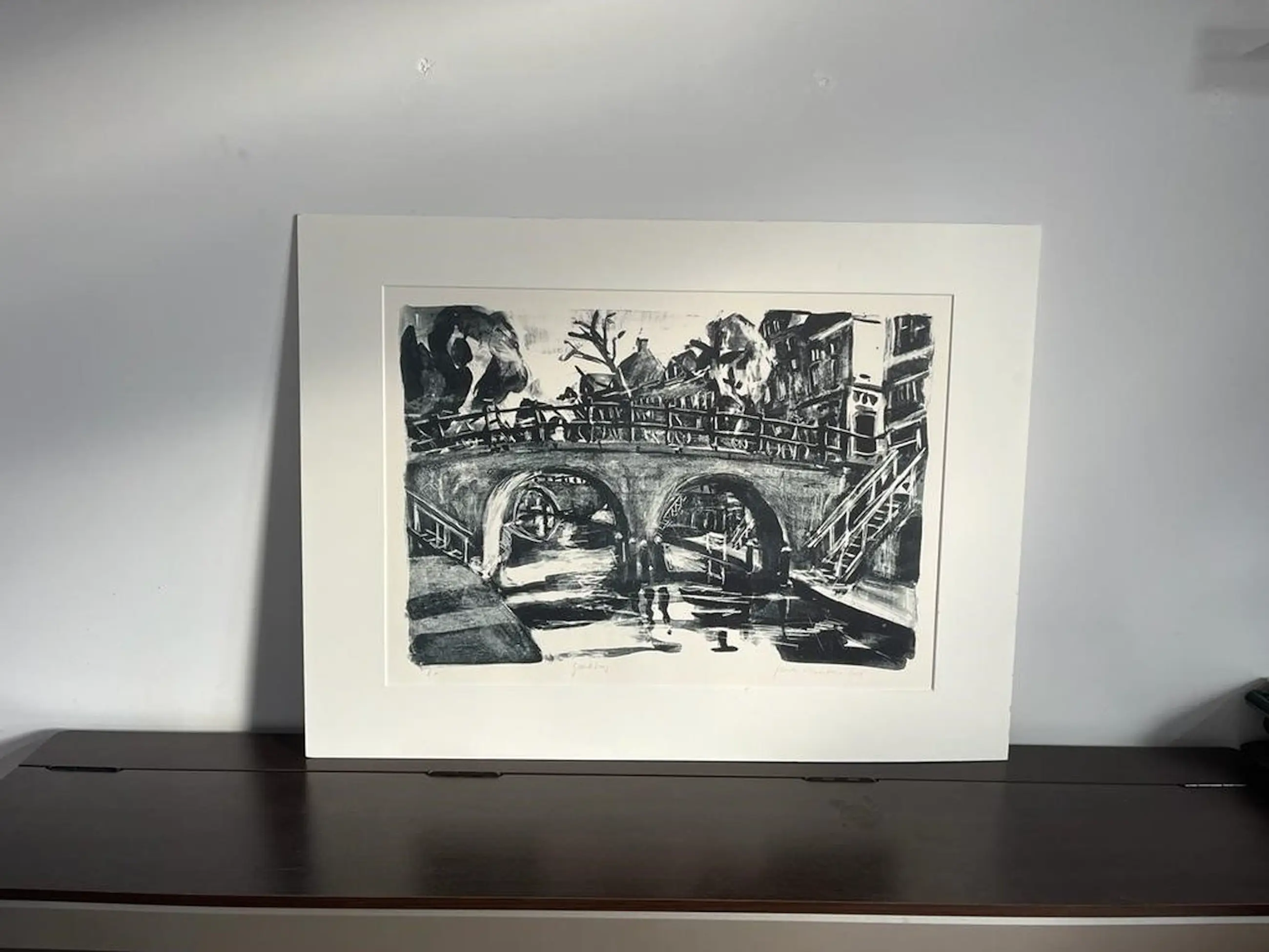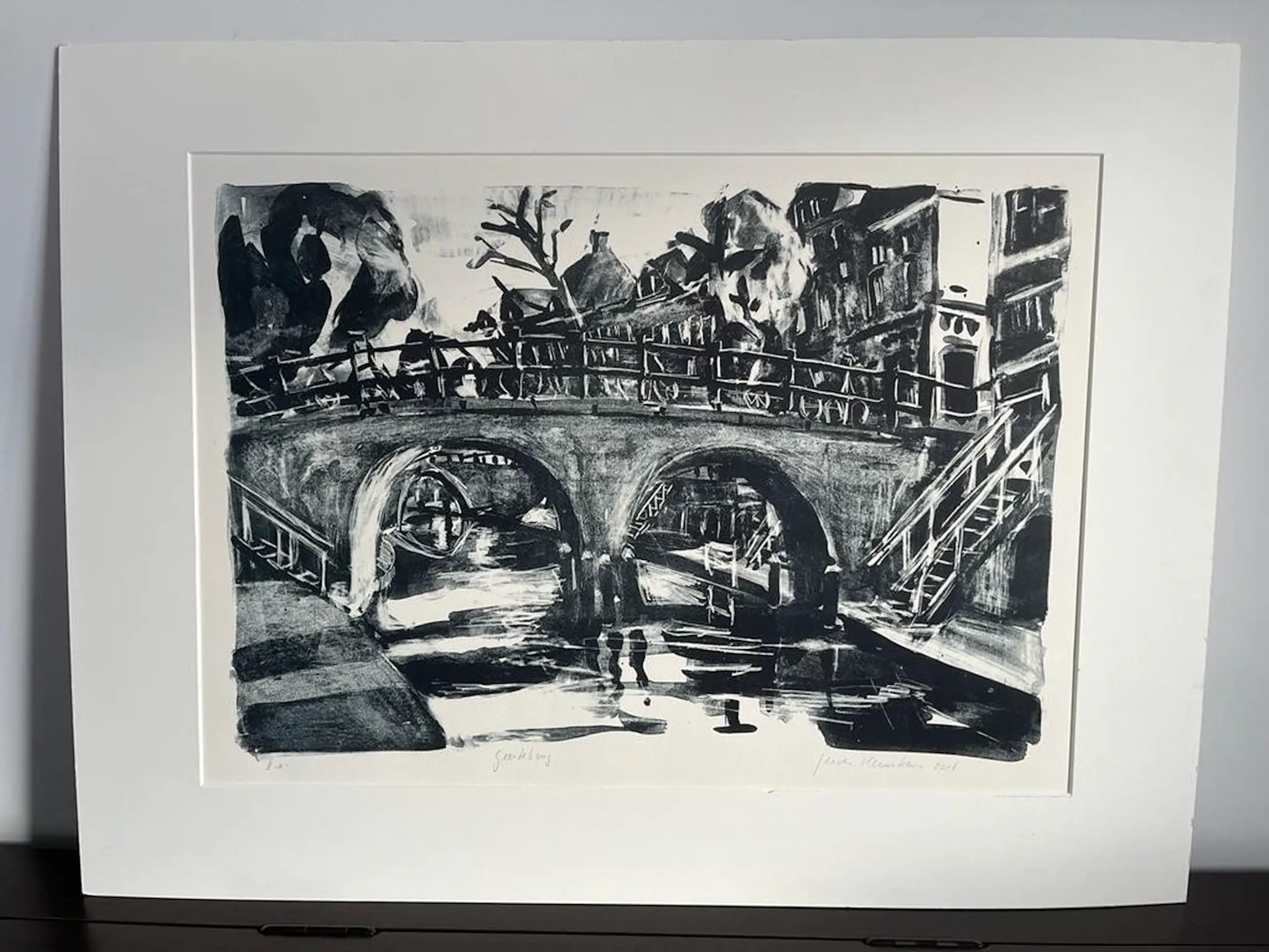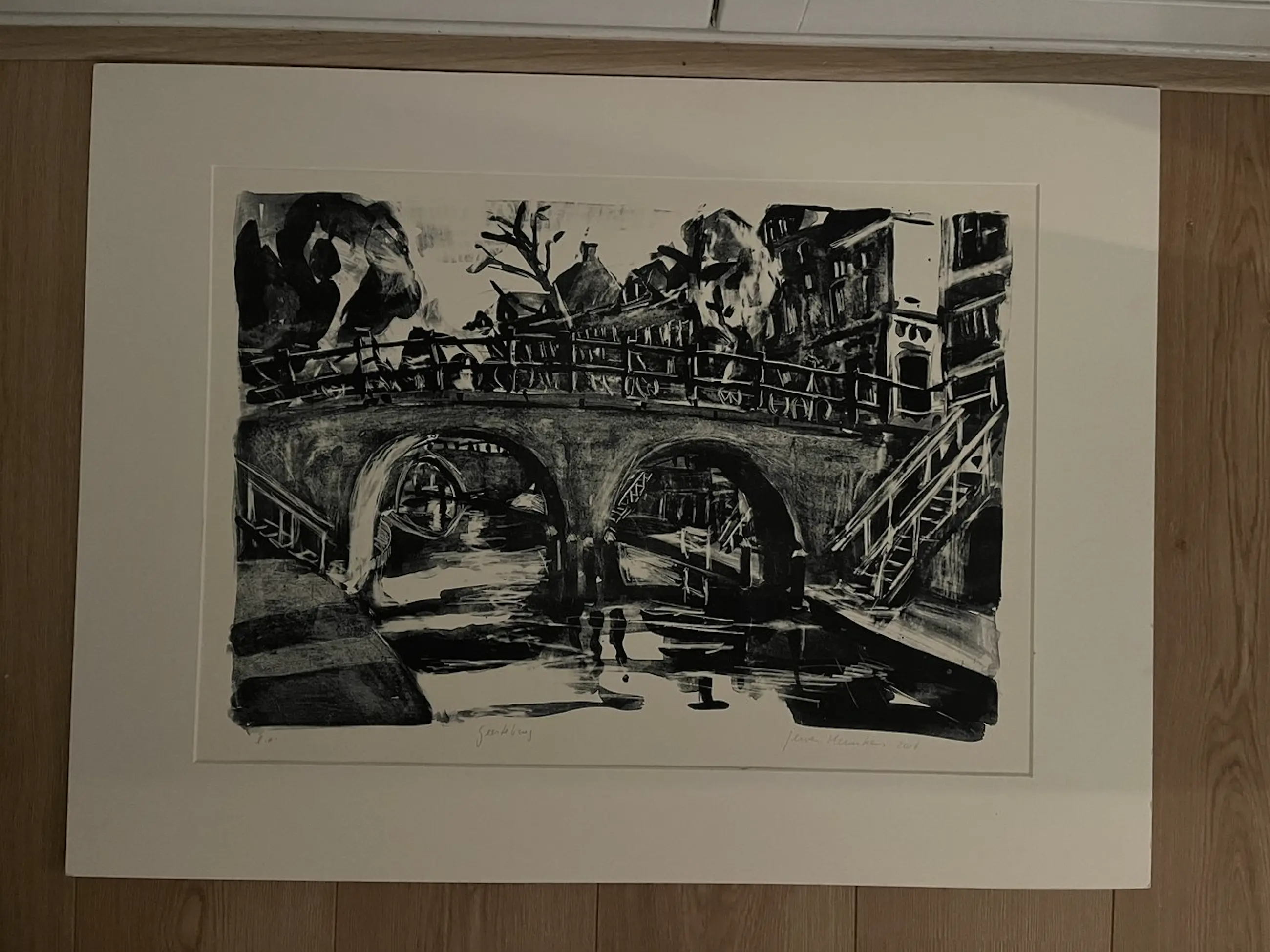 Lithograaf door kunstenaar Jeroen Hermkens. Getekend is de Geertebrug in Utrecht.