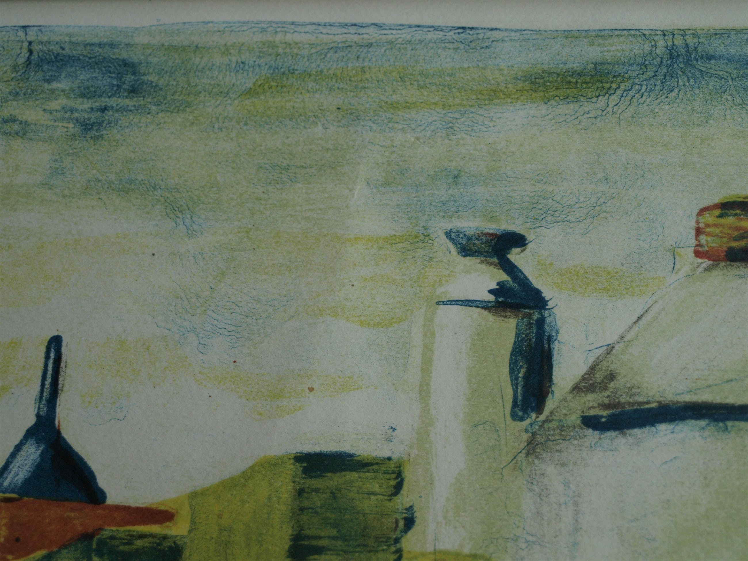 Een grote ingelijste litho uit 1992 van de Utrechtse kunstenaar Jeroen Hermkens (1960), getiteld: “Blikken stad”.