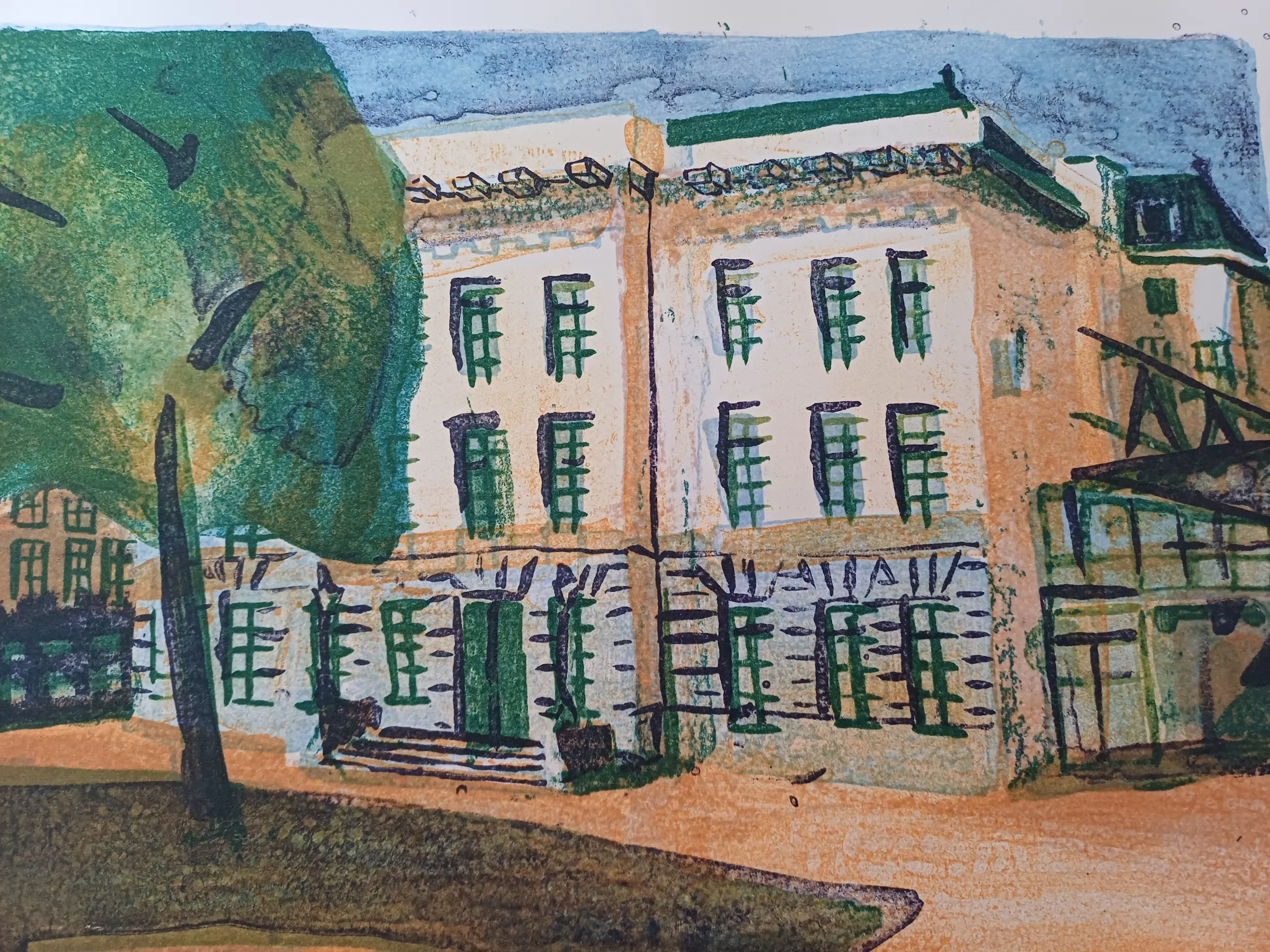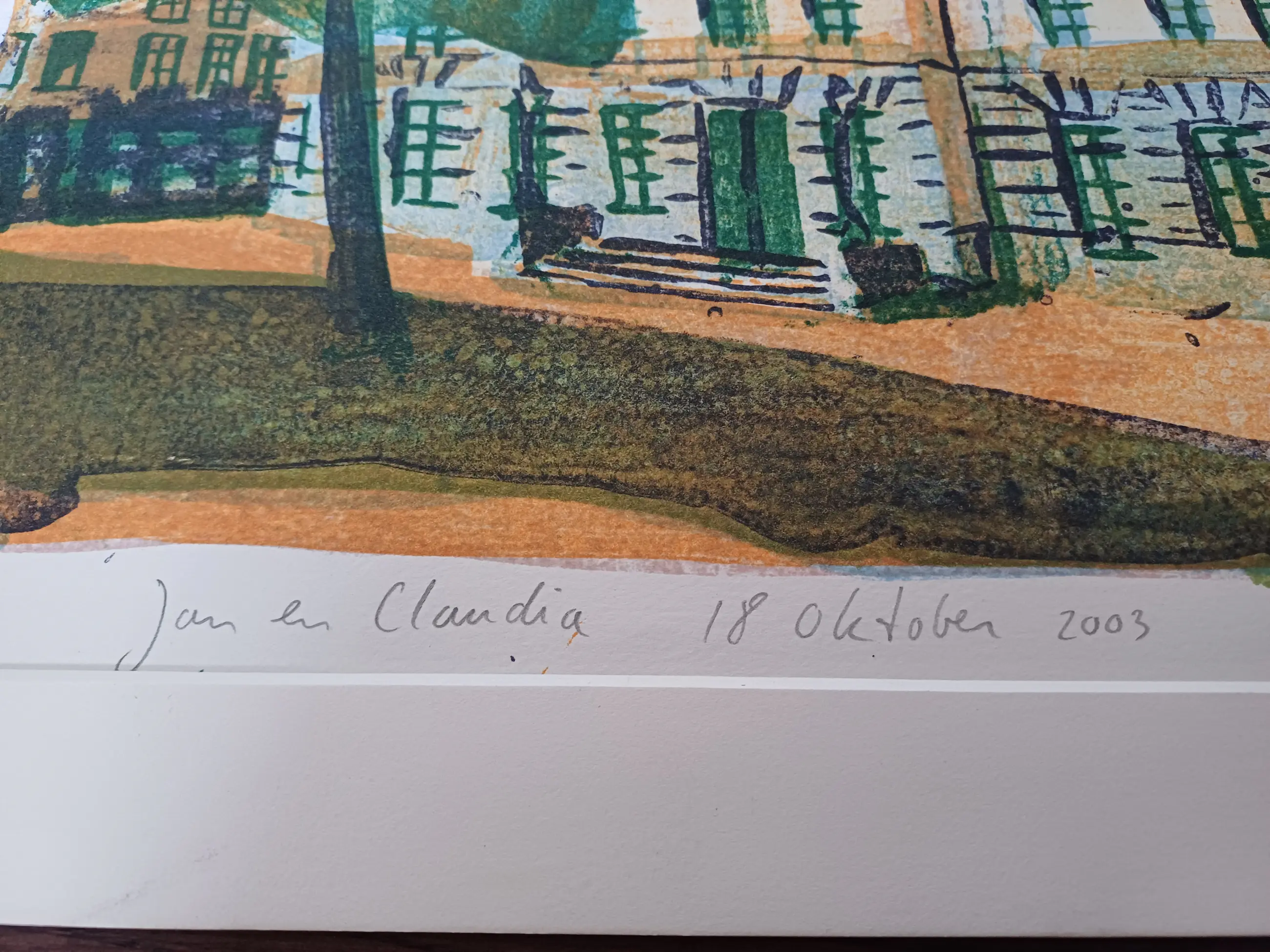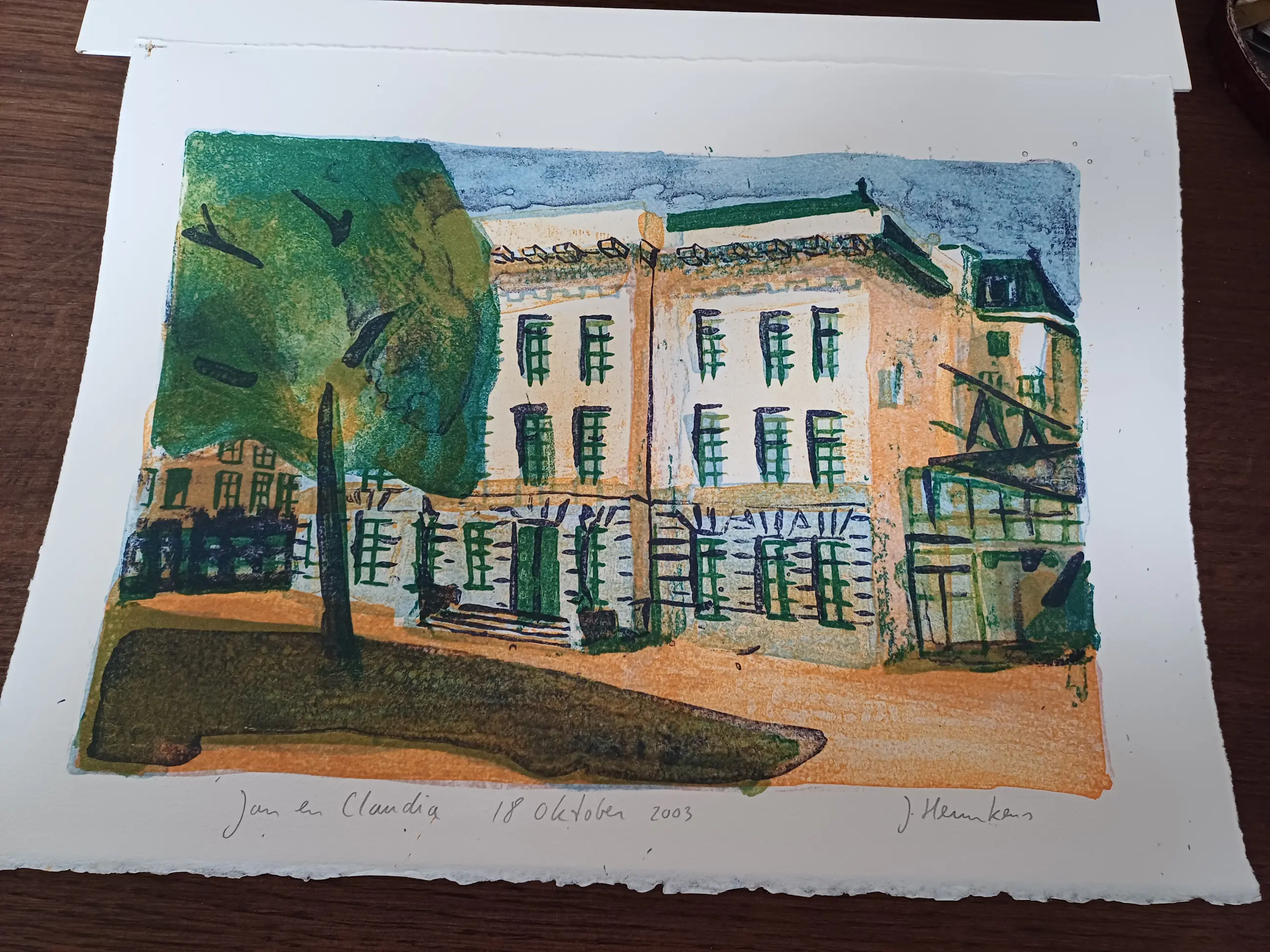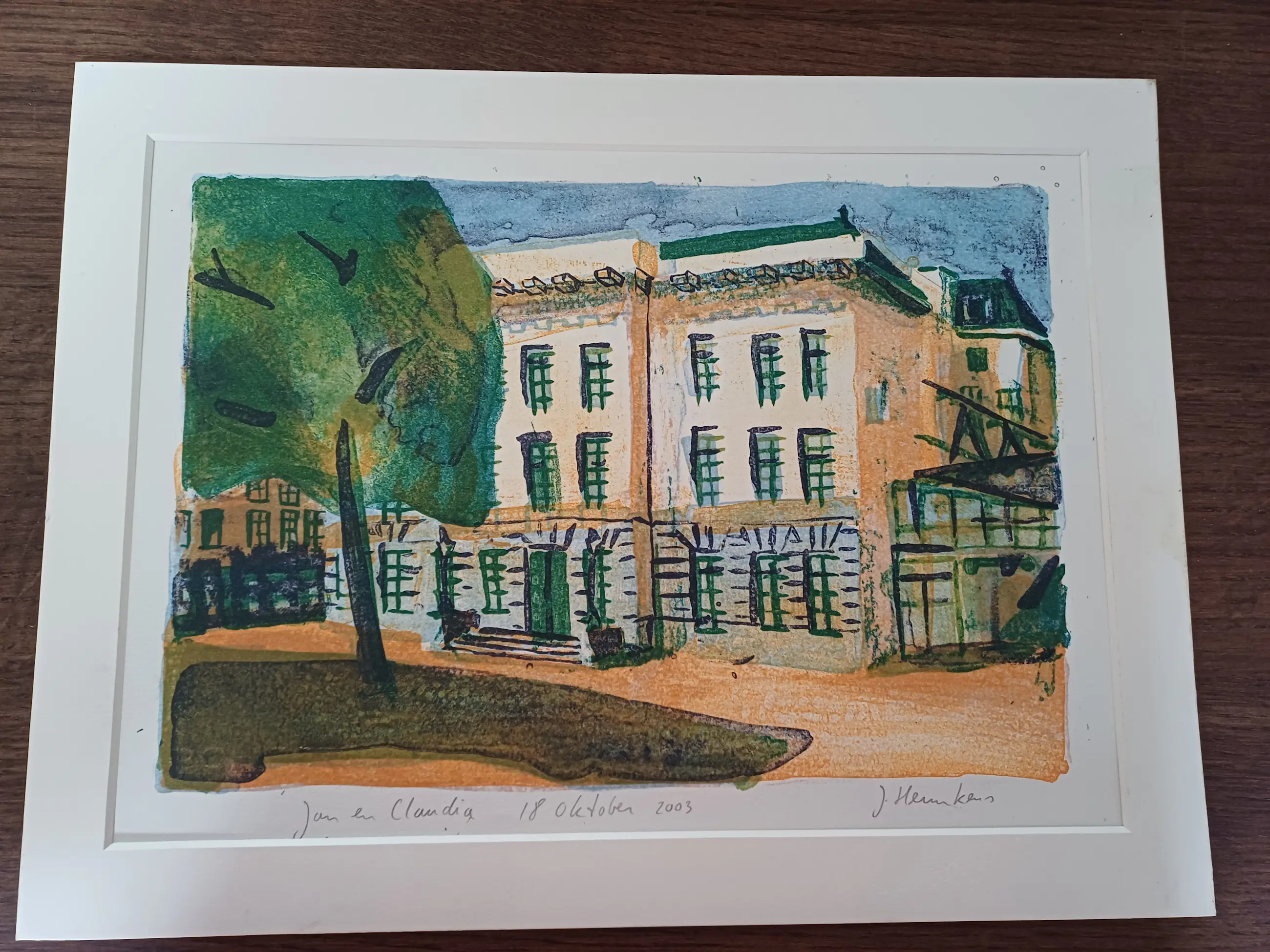 Gebouw met boom ervoor. Met de titel. " Jan en Claudia 18 oktober 2003.