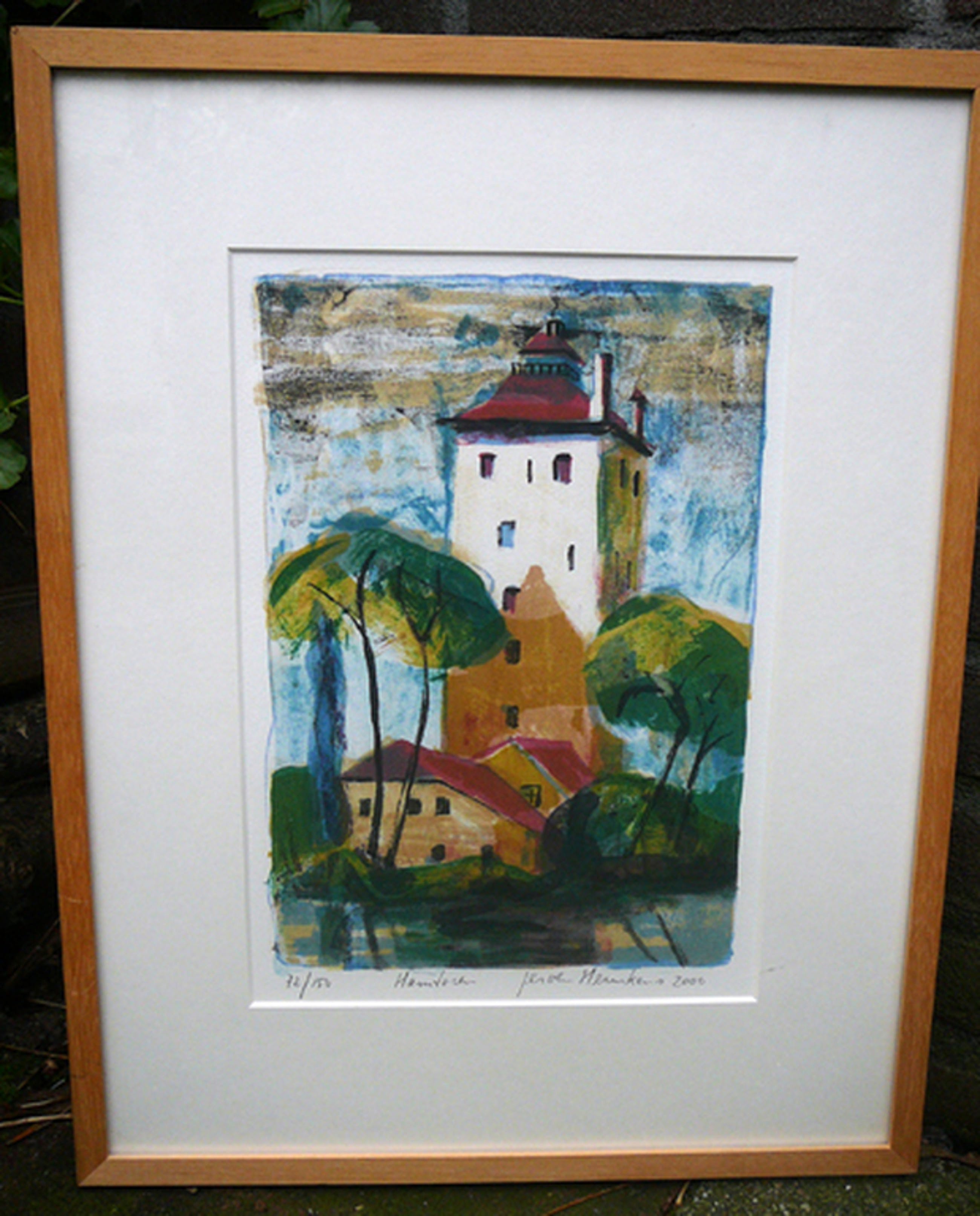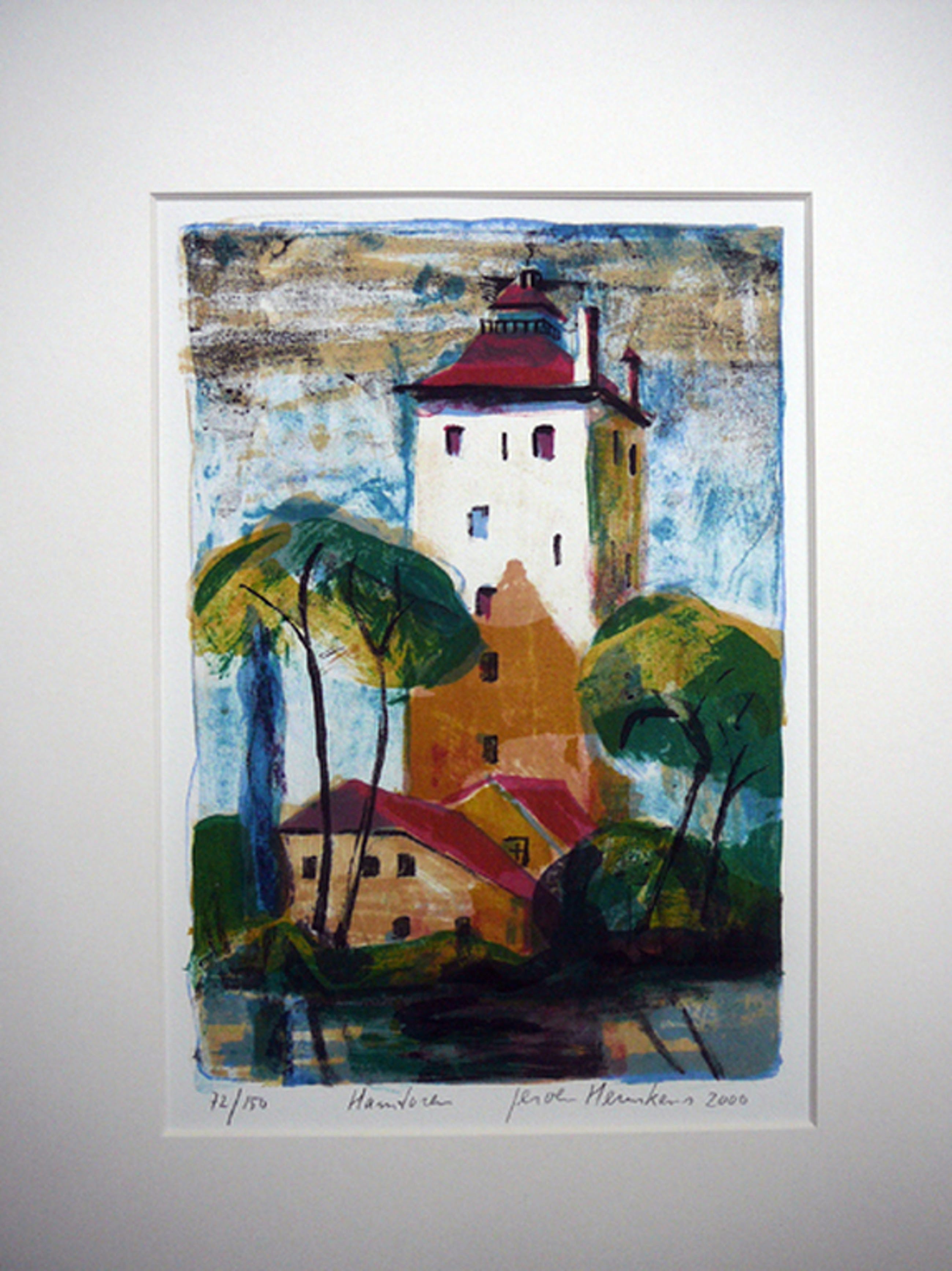 Kleurrijke litho in herkenbare stijl van Jeroen Hermkens met een voorstelling van de Hamtoren, omgeving Vleuten. Gelijst achter glas en in zeer goede staat.